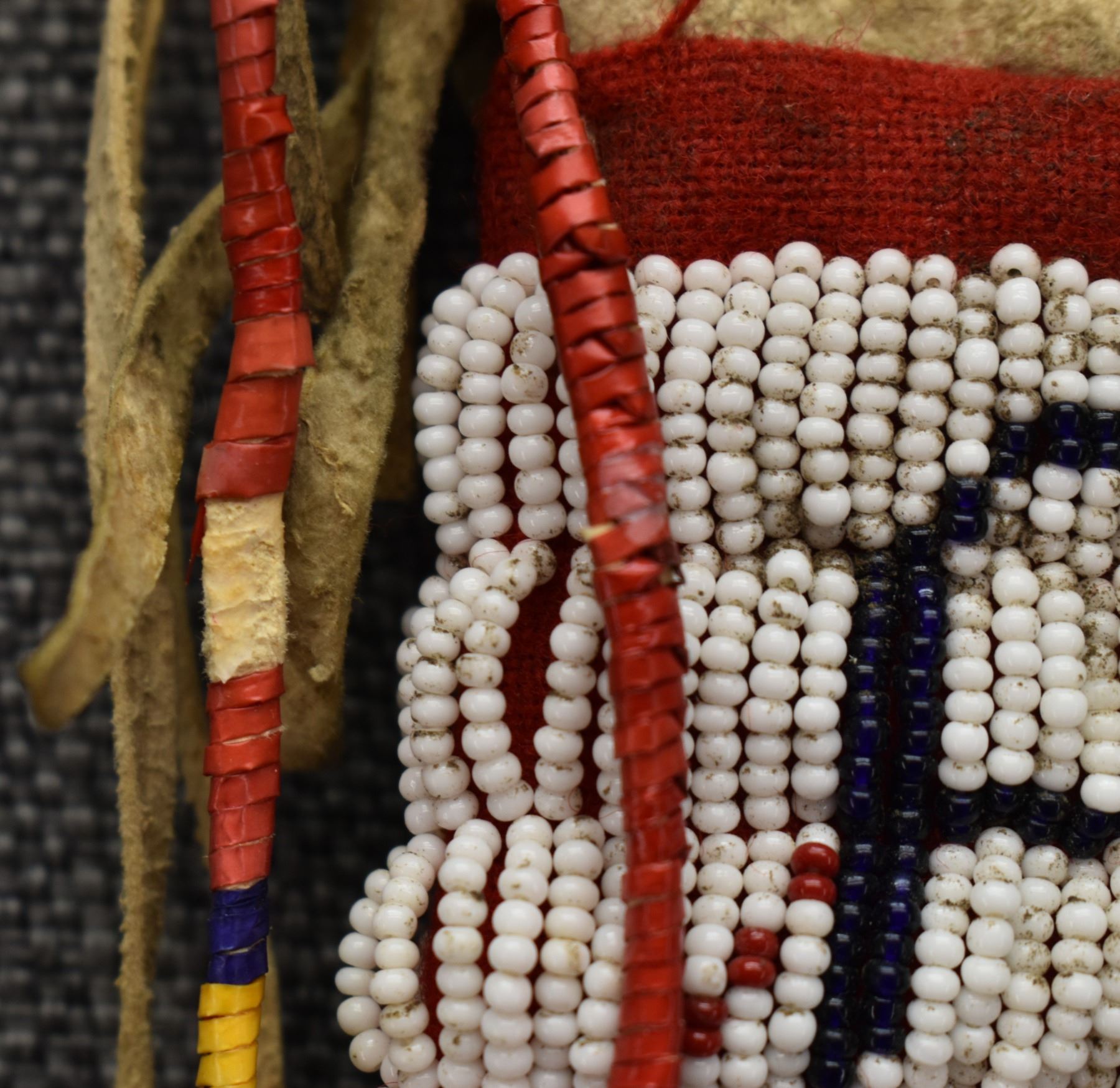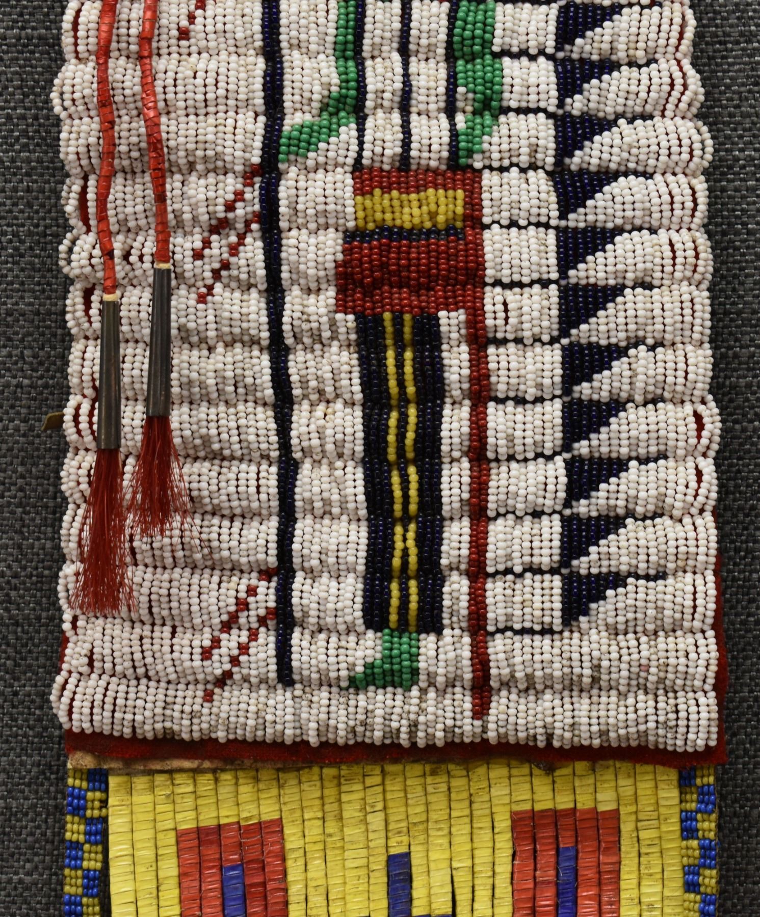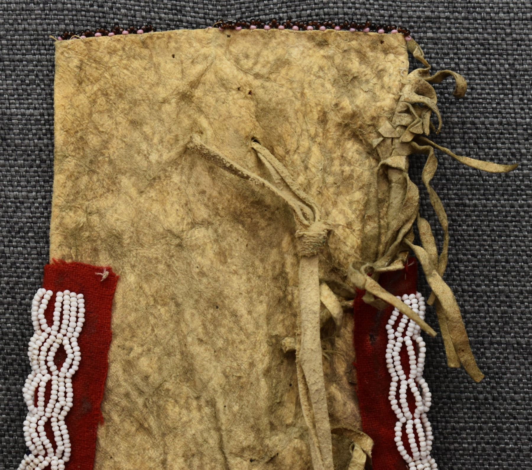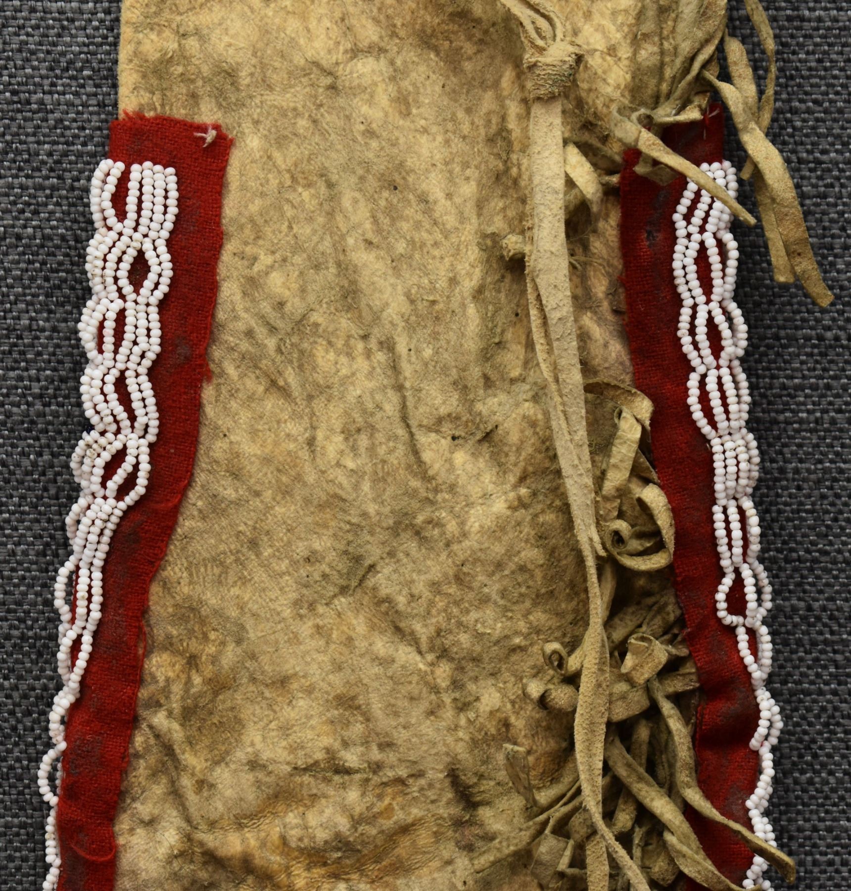 20th century Sioux. Thread sewn beaded and quilled pictorial design on native tanned leather. Tabacco bag. 28'' x 6''