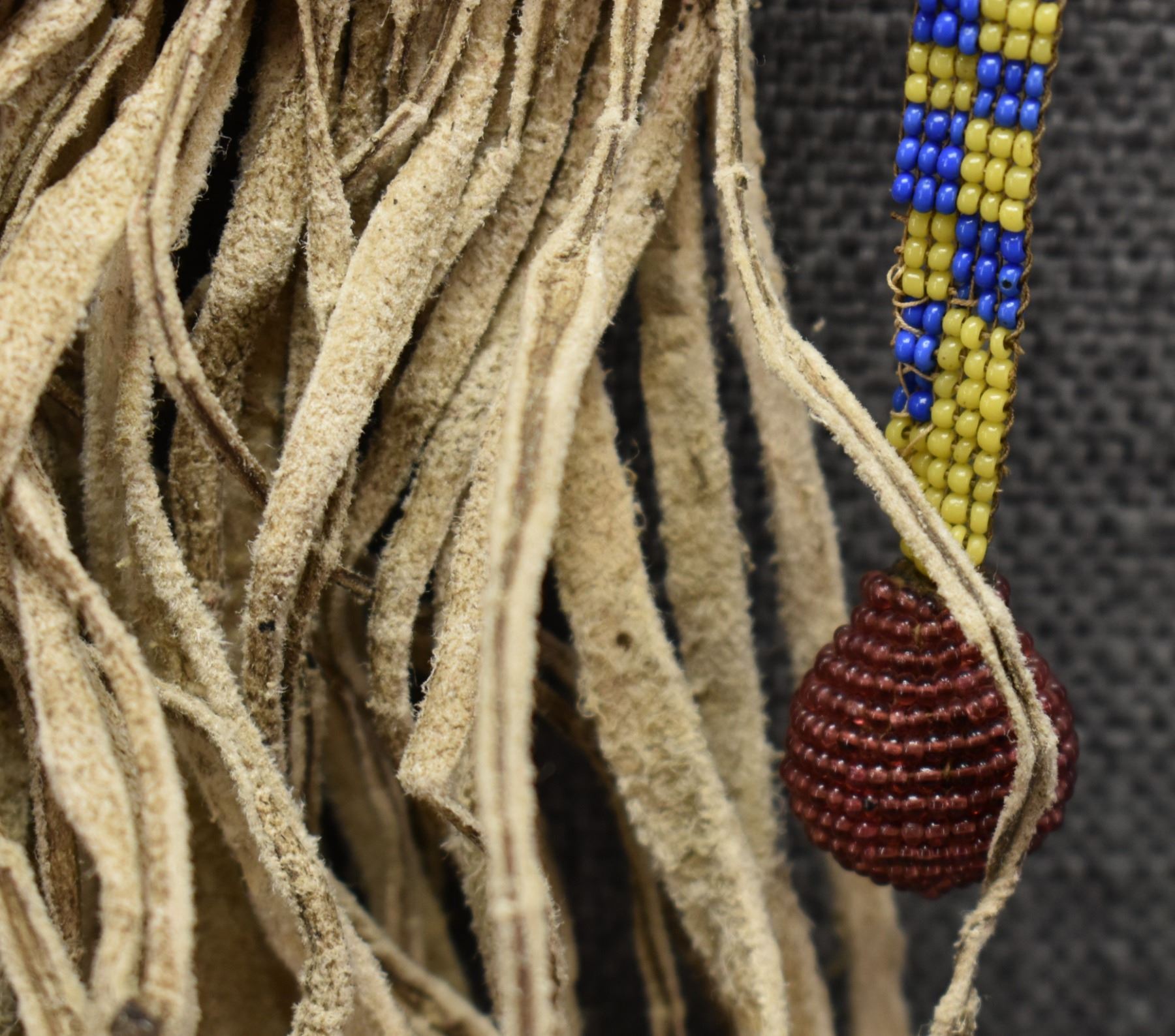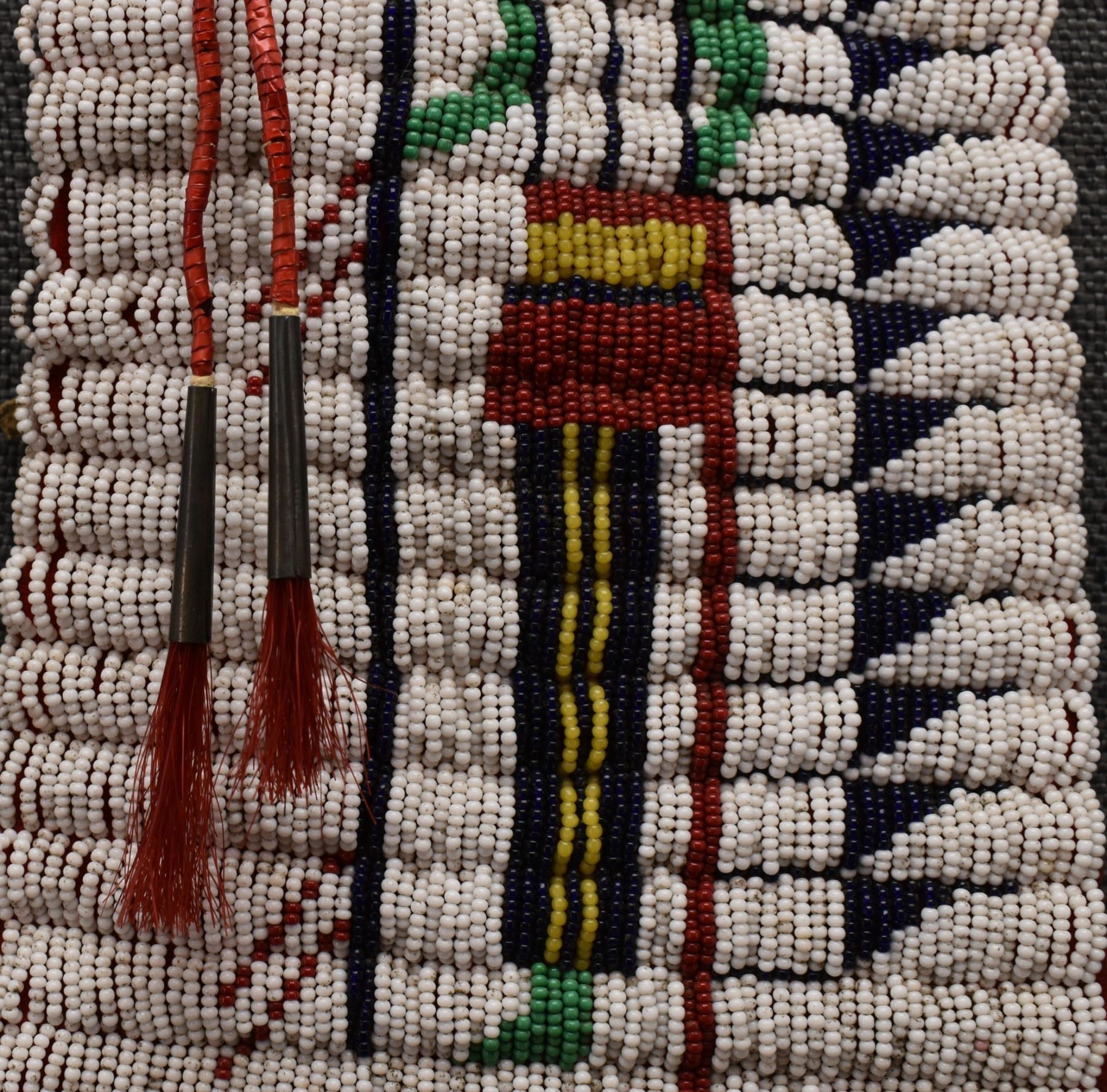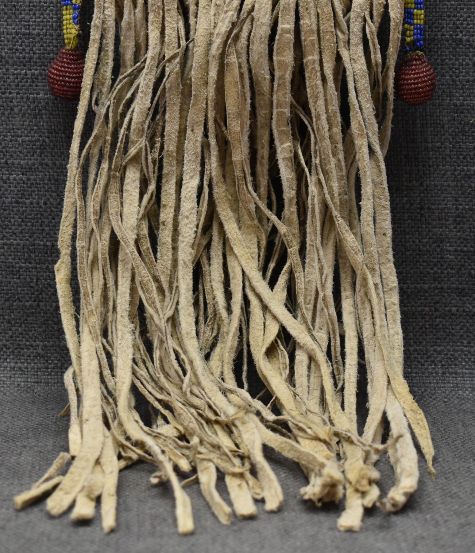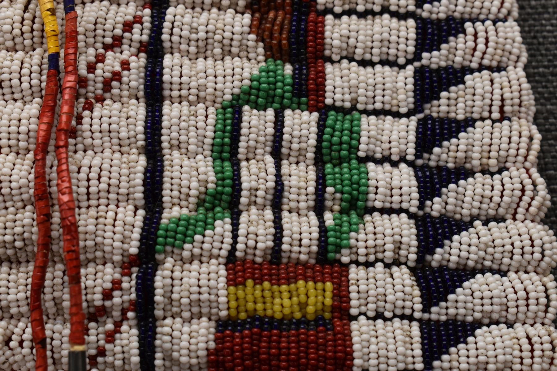 20th century Sioux. Thread sewn beaded and quilled pictorial design on native tanned leather. Tabacco bag. 28'' x 6''