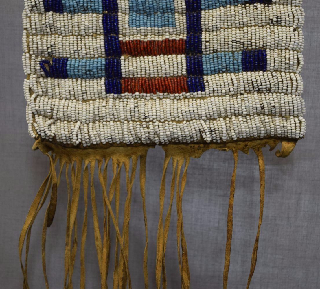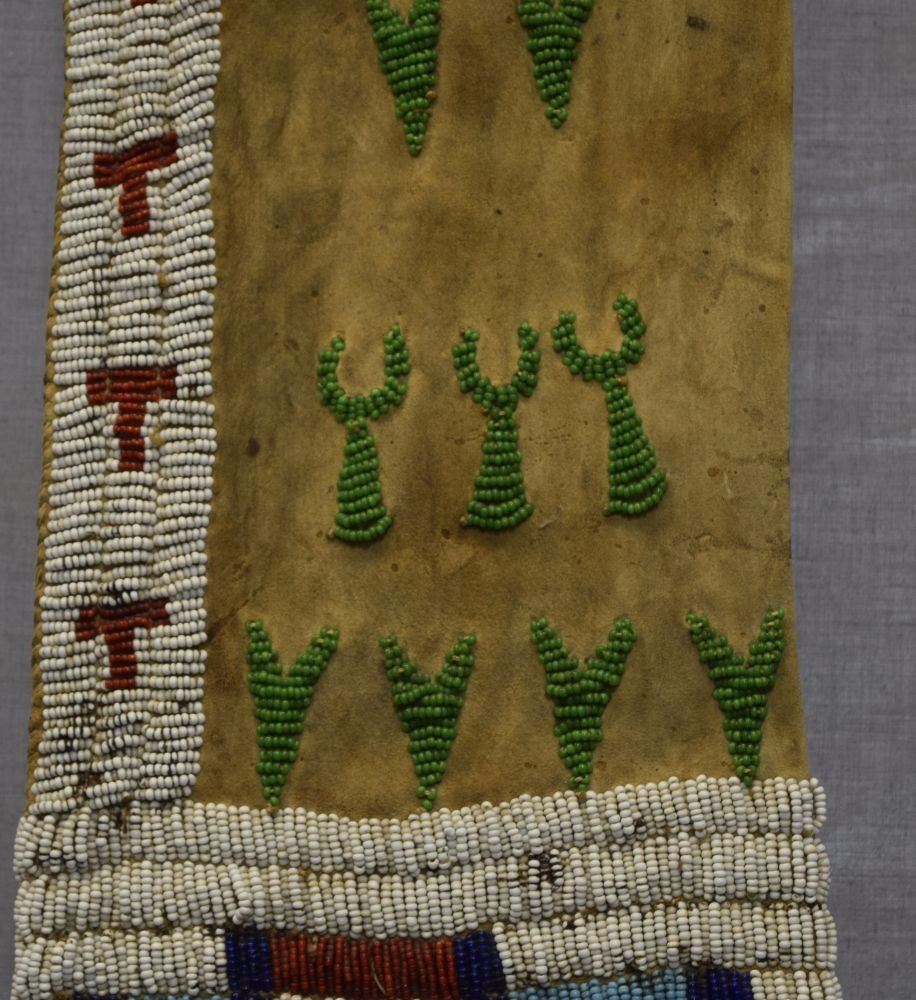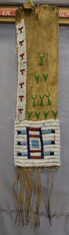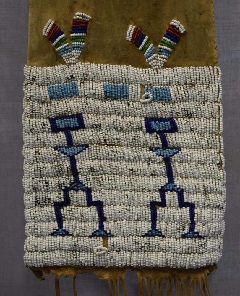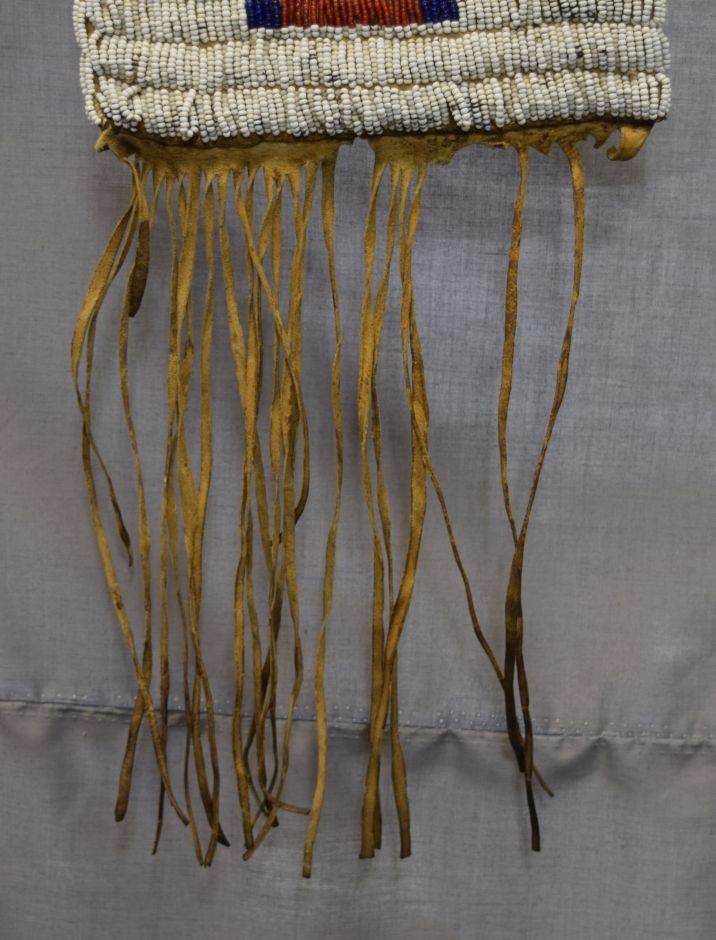 1940's geometric beaded design on native tanned leather thread sown, 7'' x 35'' has minor damage.