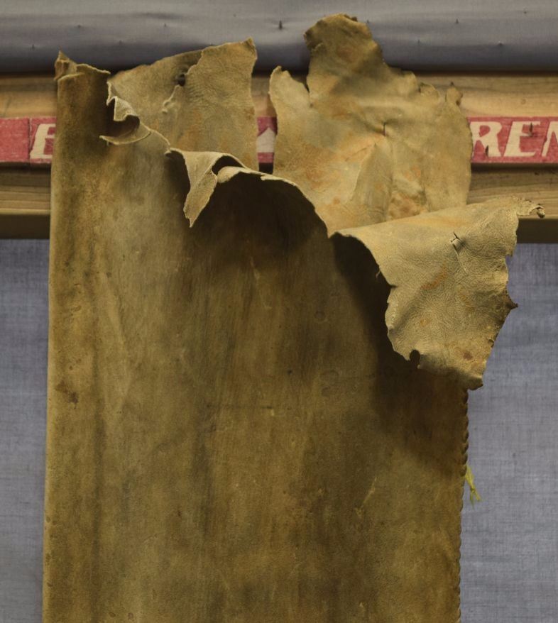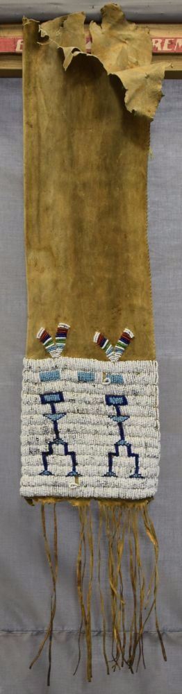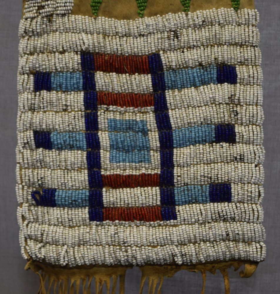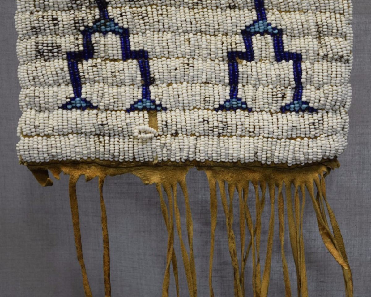 1940's geometric beaded design on native tanned leather thread sown, 7'' x 35'' has minor damage.