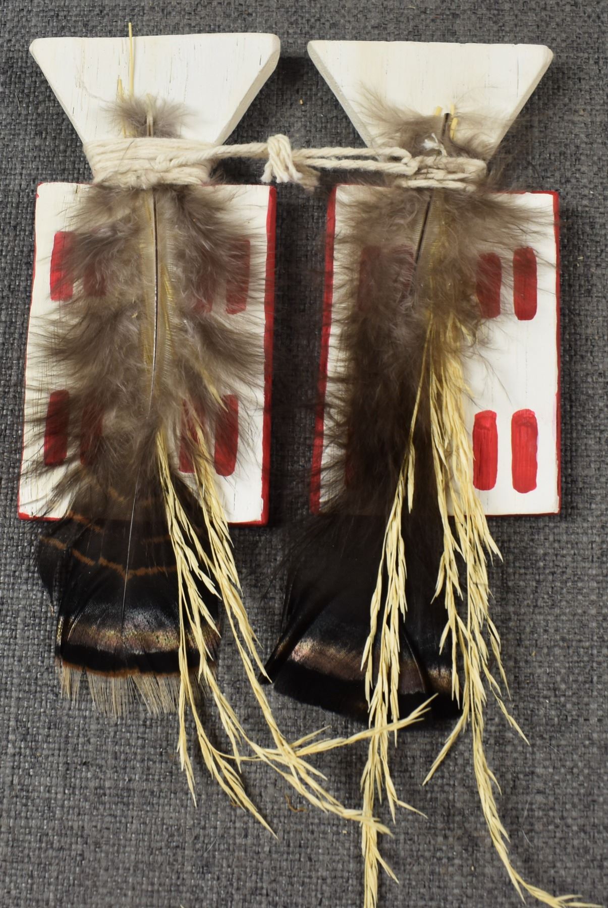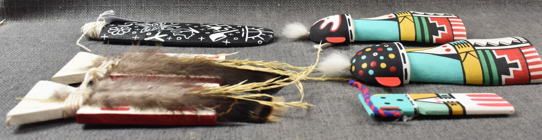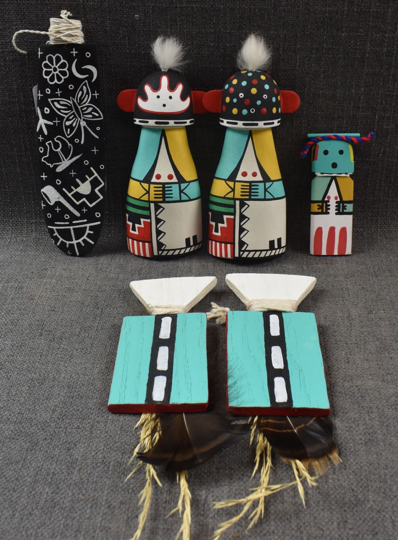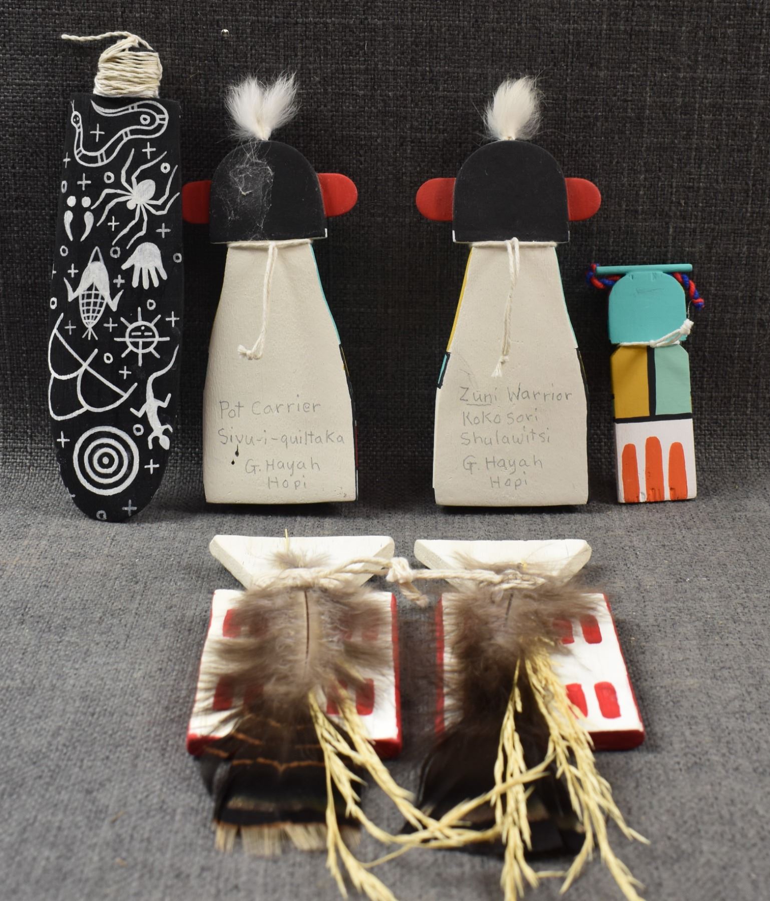 six Hopi decorations. Three Hopi polychrome flat dolls two signed G Hayah, two polychrome dance wands, one white on black bull roarer. Largest 5.5" x 2.5" x .75"