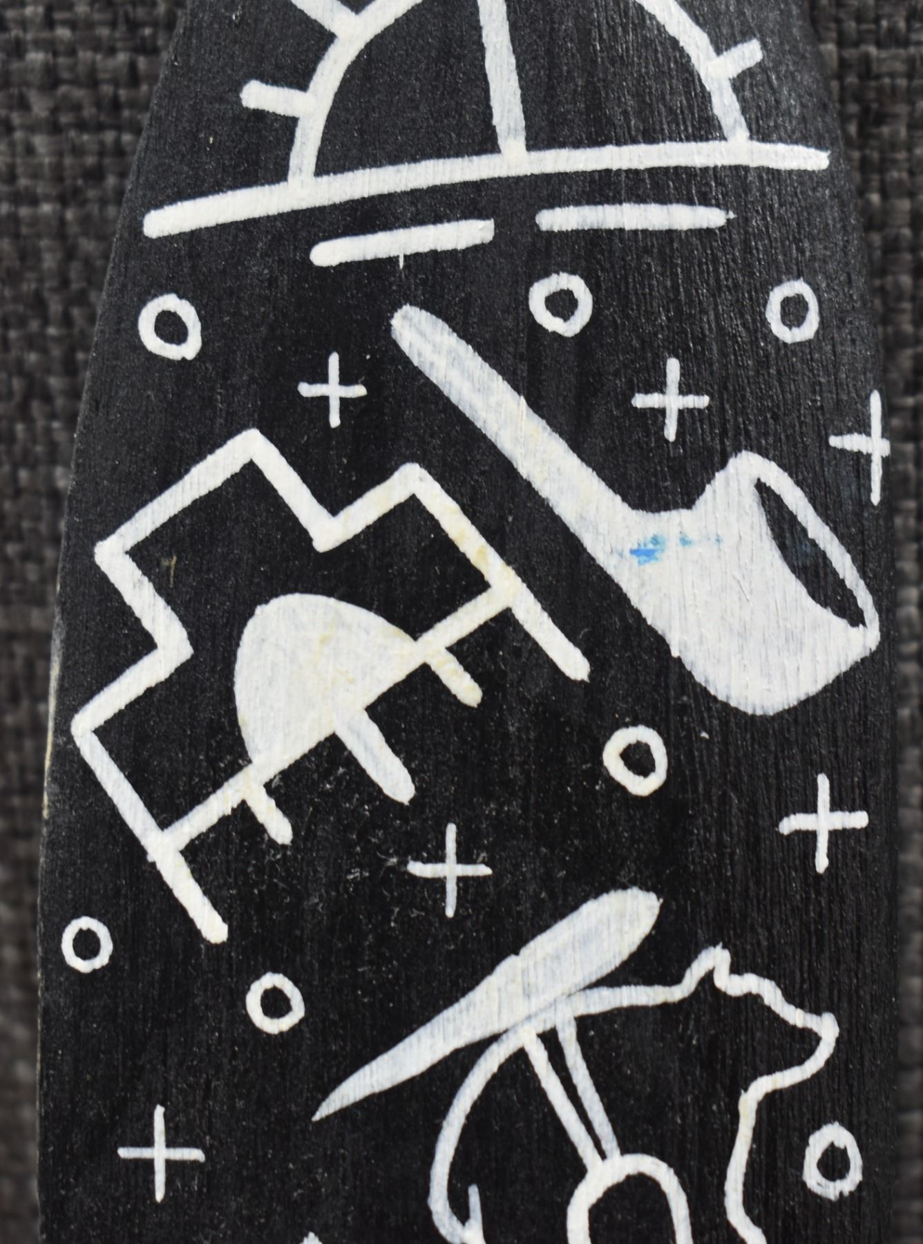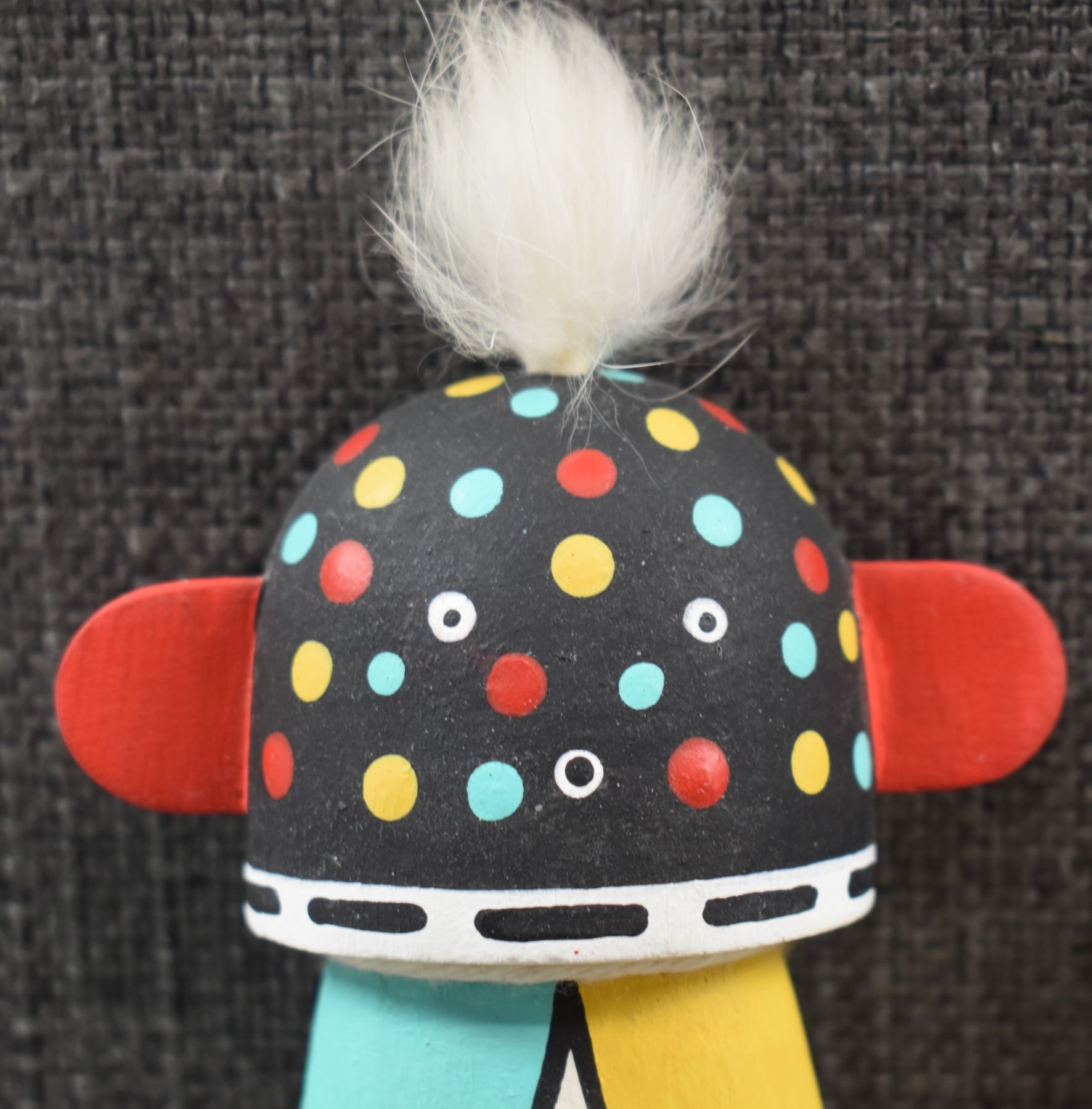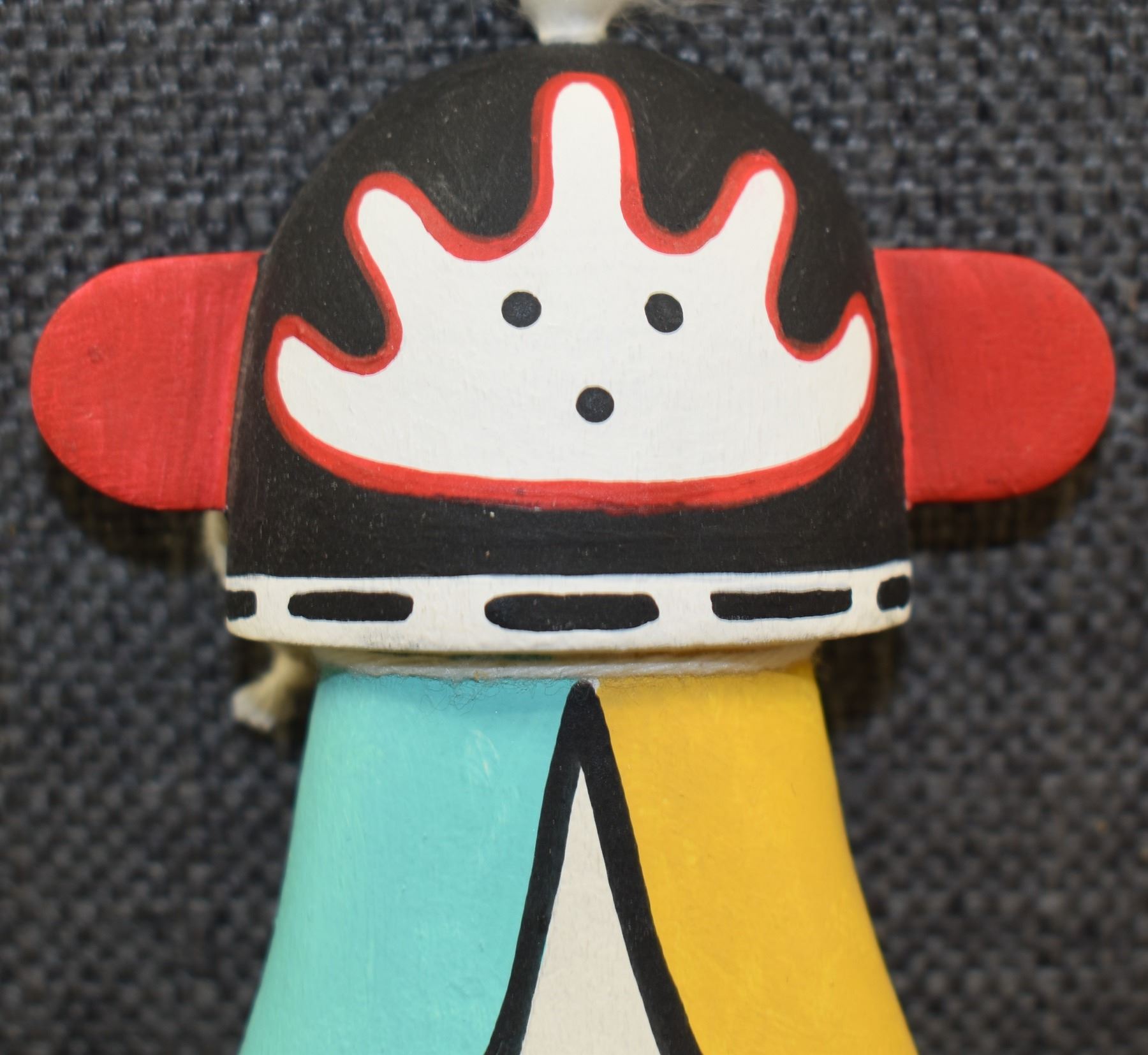 six Hopi decorations. Three Hopi polychrome flat dolls two signed G Hayah, two polychrome dance wands, one white on black bull roarer. Largest 5.5" x 2.5" x .75"