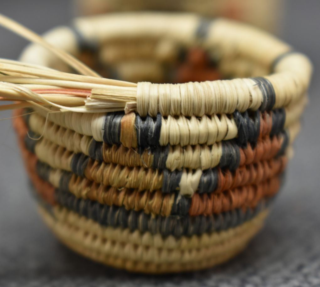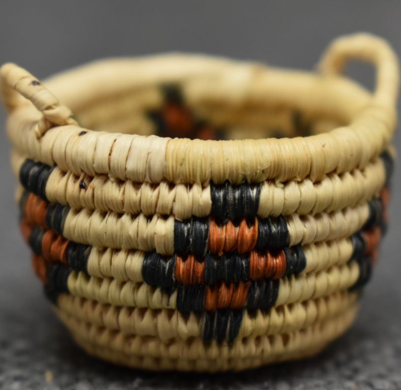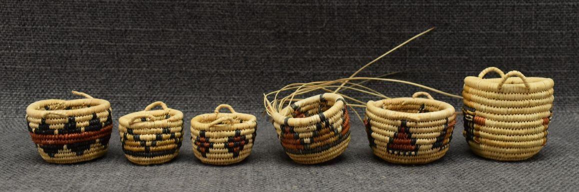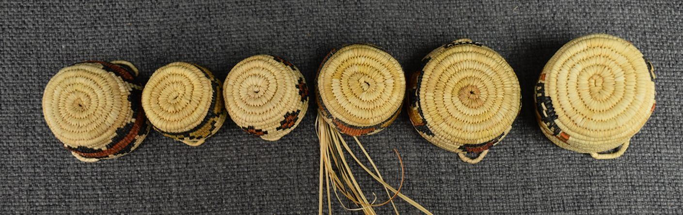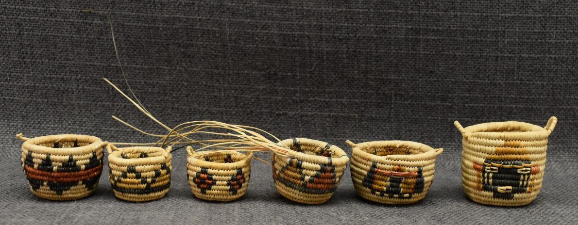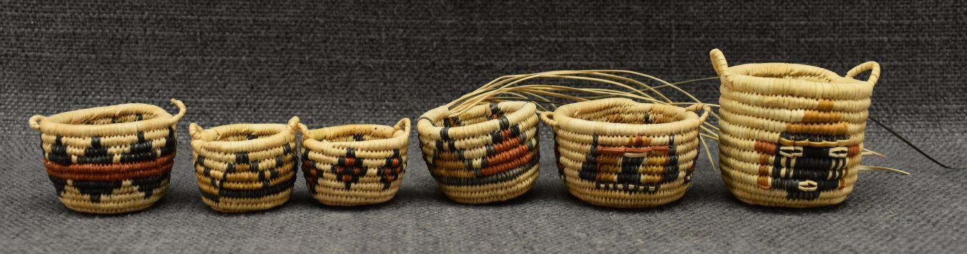 1980's/90's Hopi, six hand coiled and polychrome kachina face and geometric design. One is unfinished. Largest 1.5" x 1.75"
