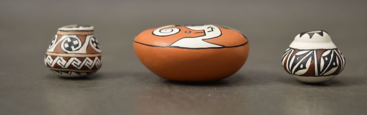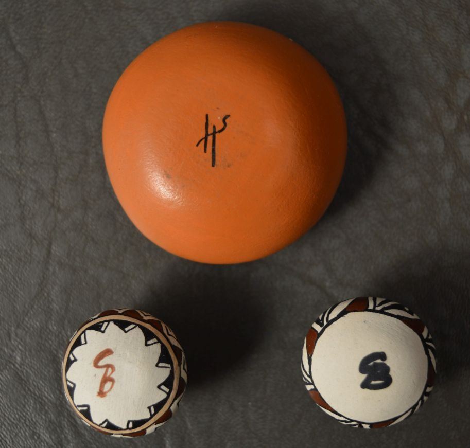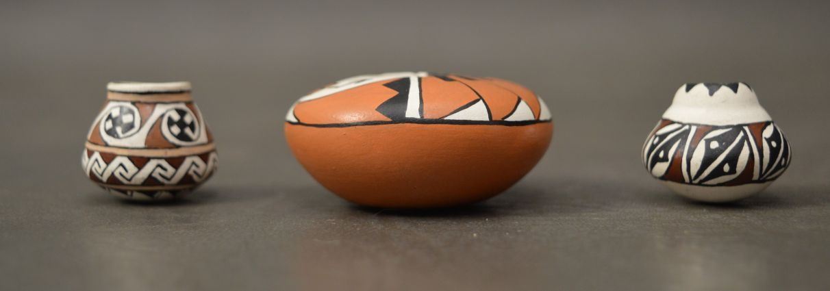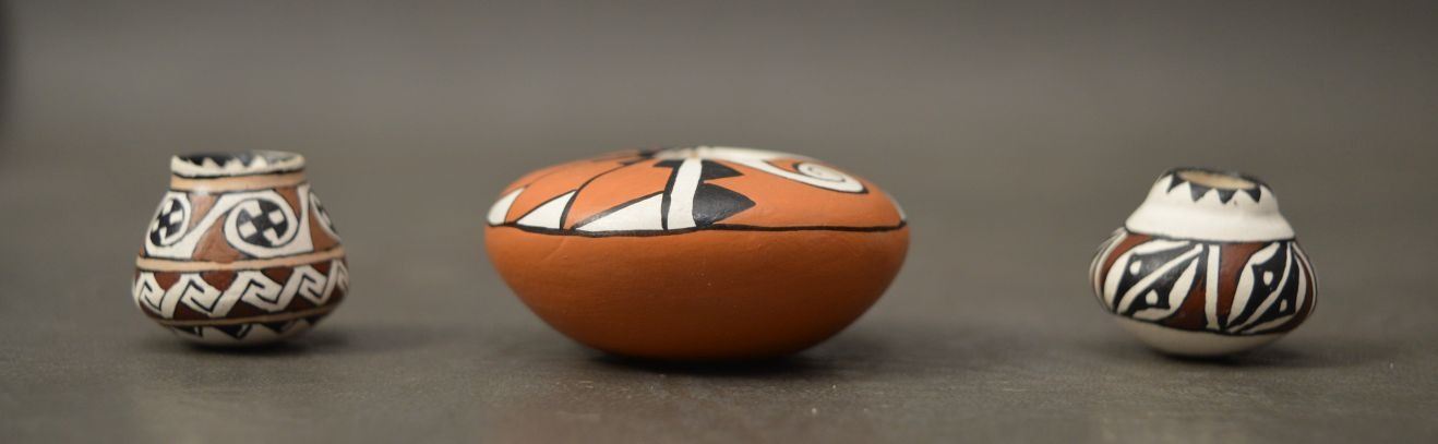 2000's hand coiled and busy painted poly chrome design pottery jars, all signed with unknown hall mark. Largest is .75'' x 1 1/2''