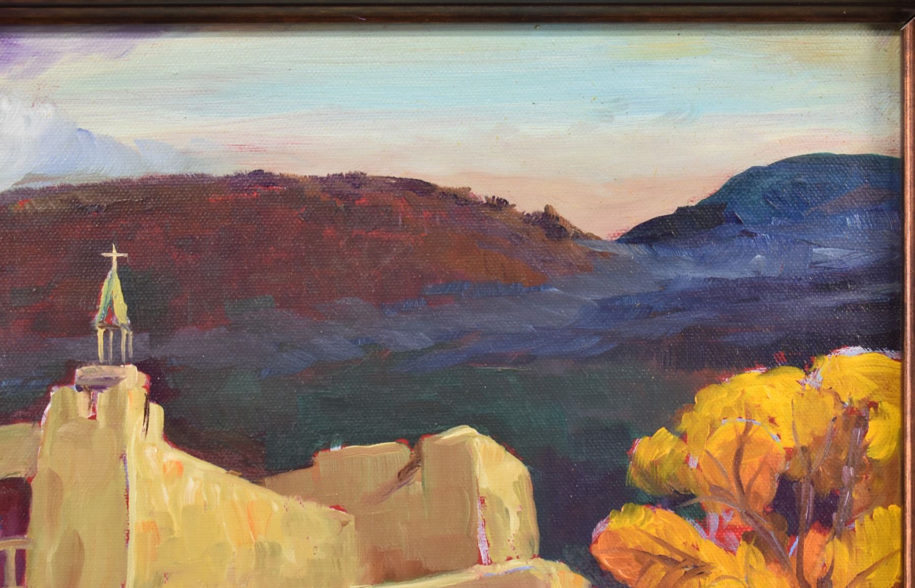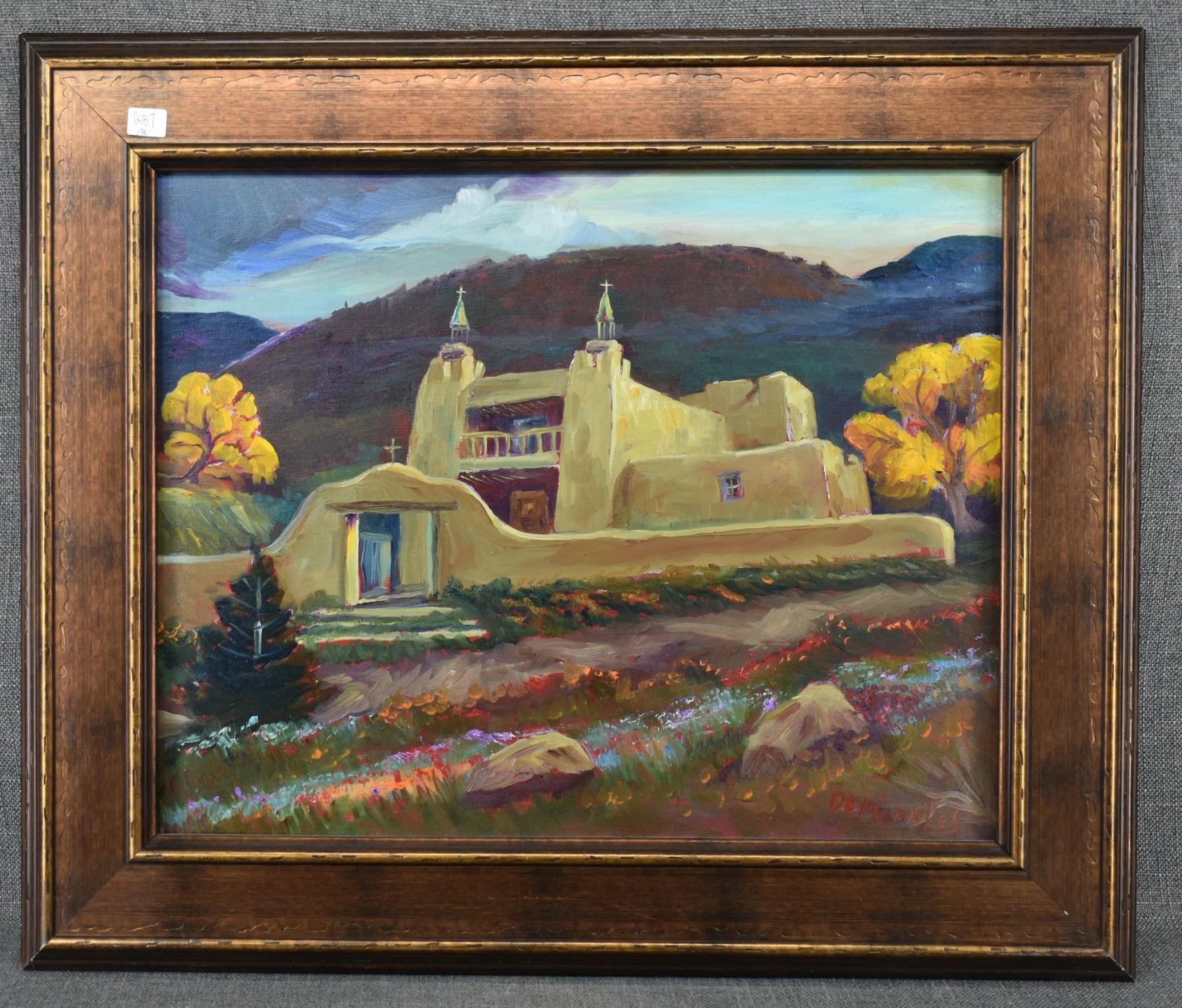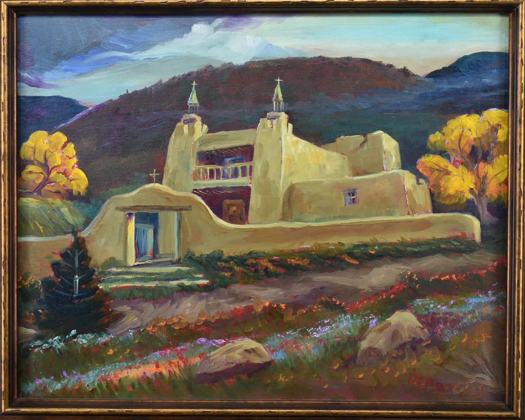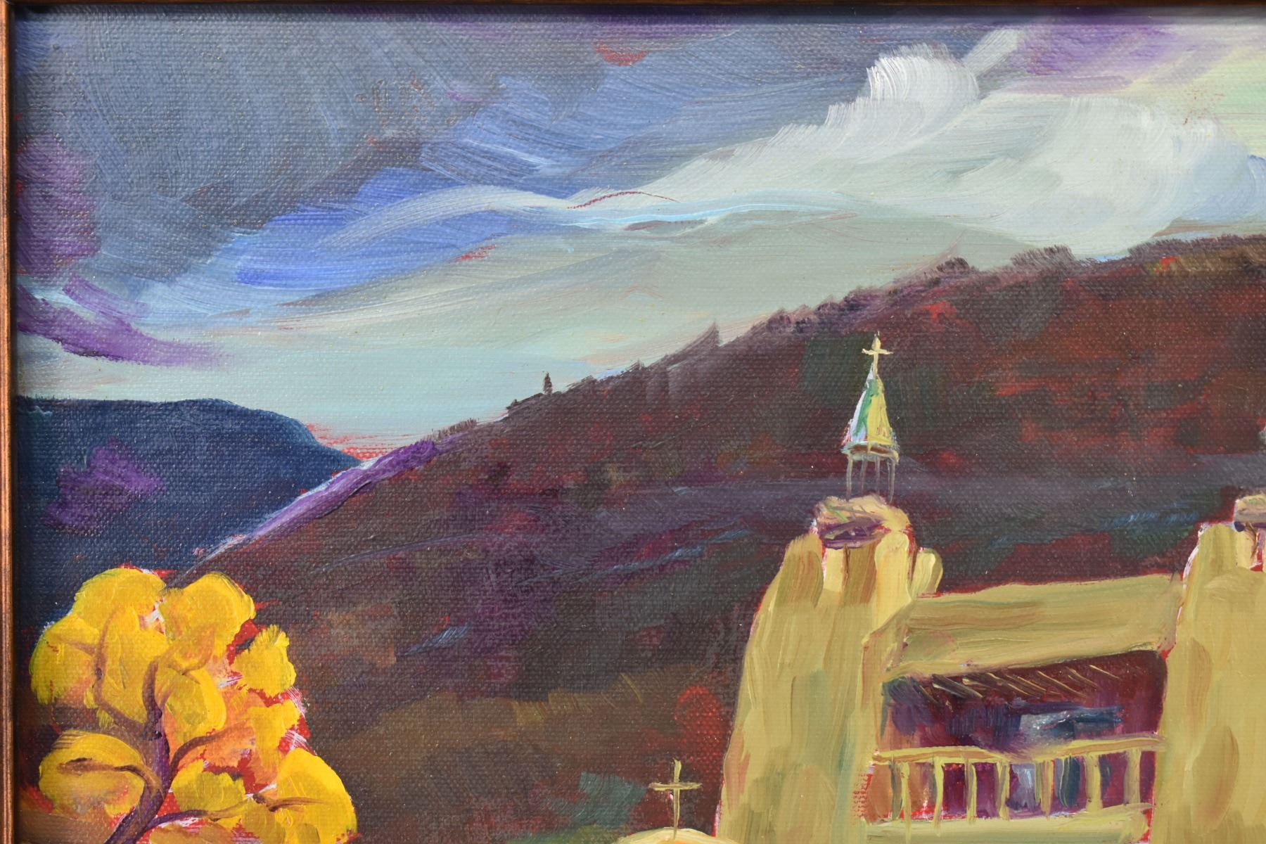 1980's Original, hand painted on canvas depicting church signed Demorales 15.25" x 19.25" framed to 22" x 26"