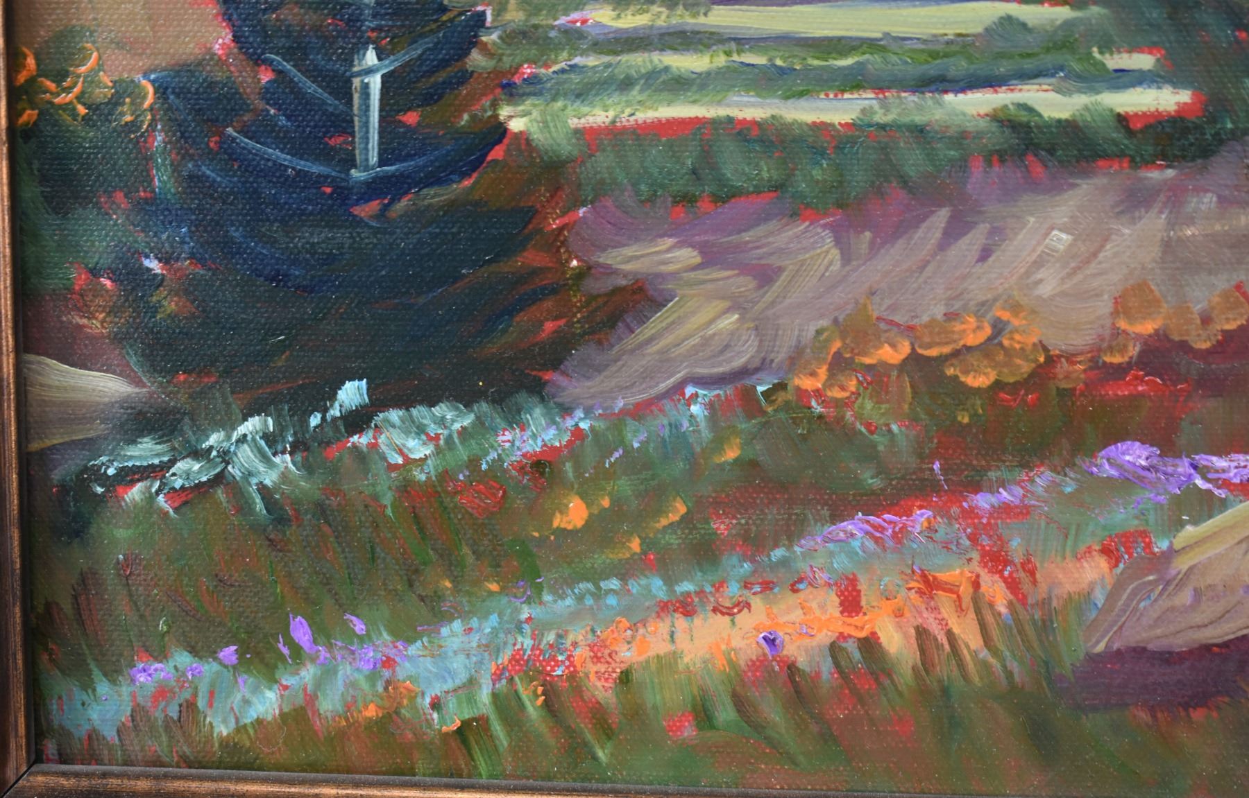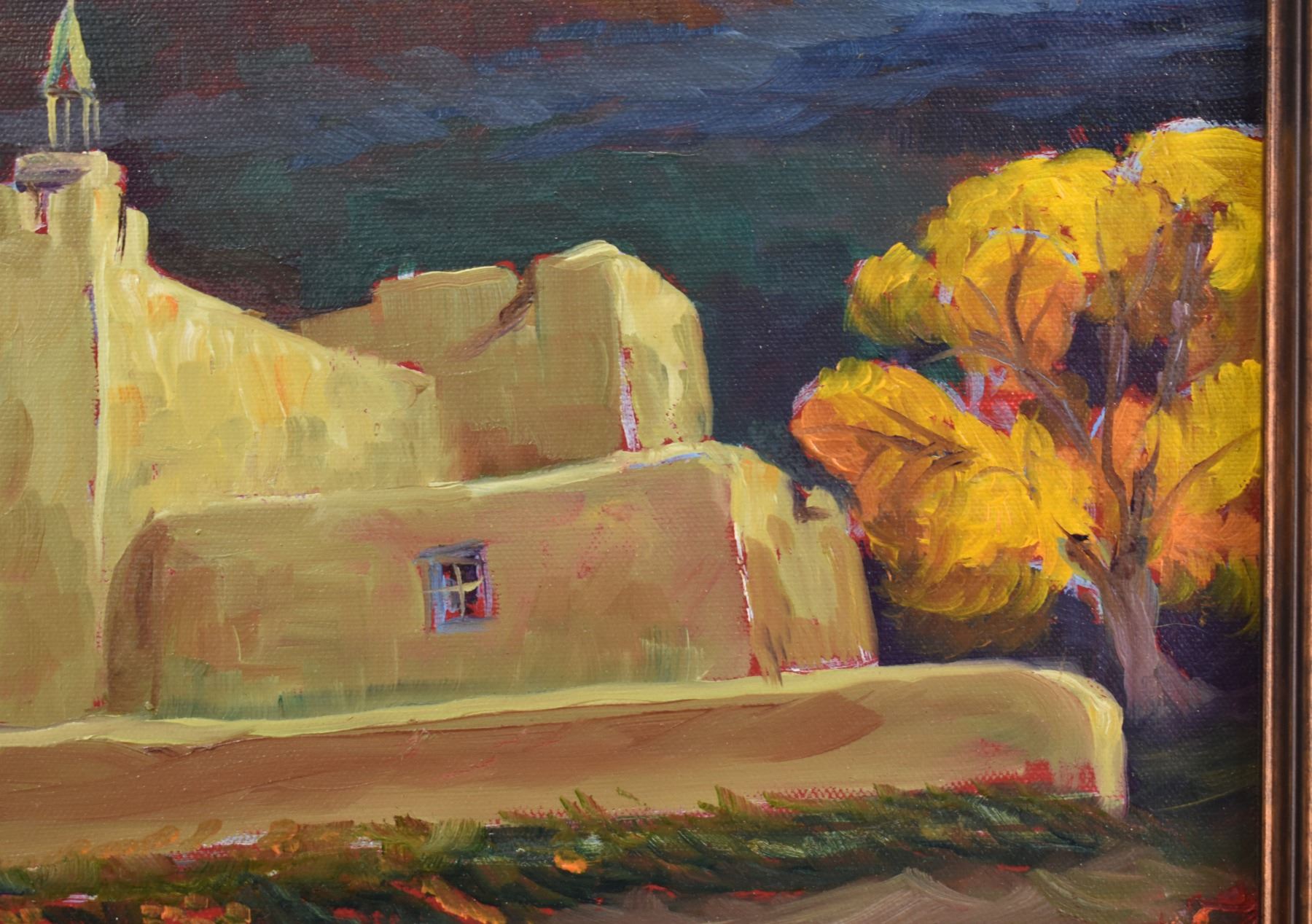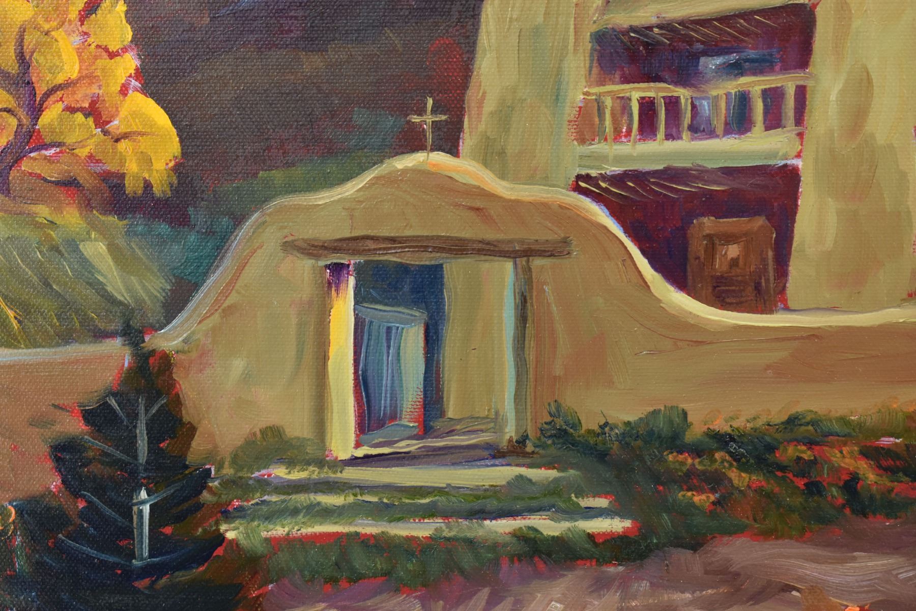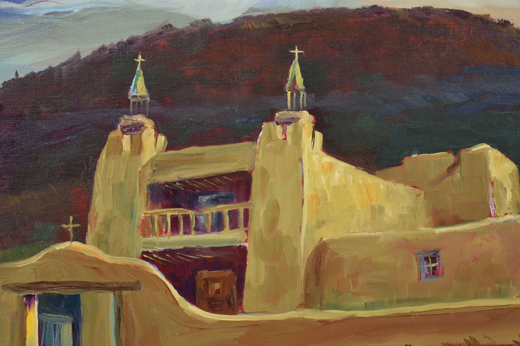1980's Original, hand painted on canvas depicting church signed Demorales 15.25" x 19.25" framed to 22" x 26"