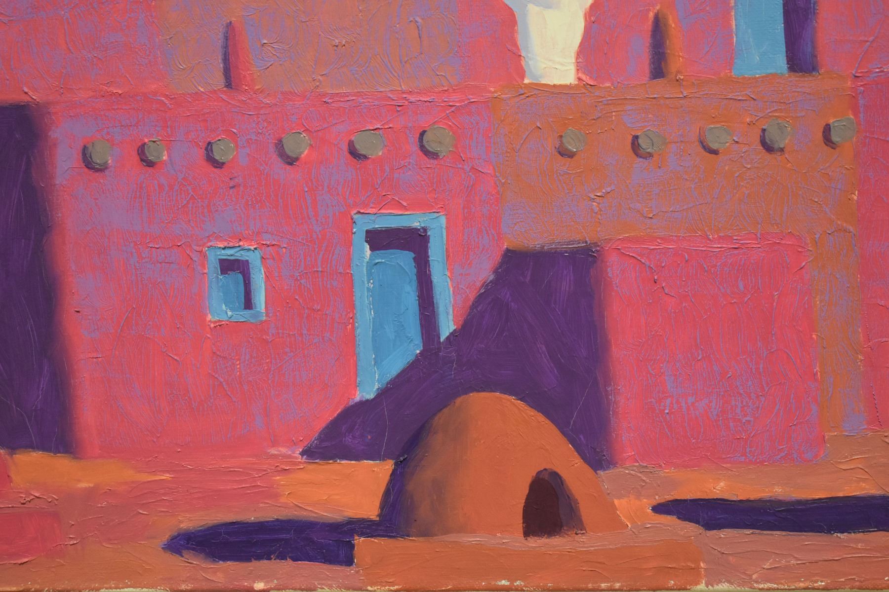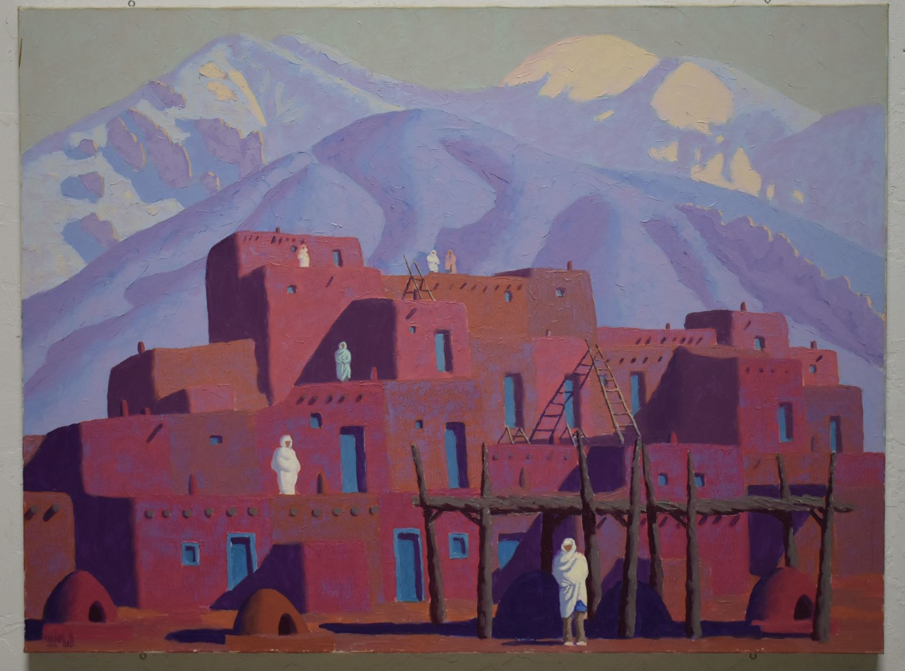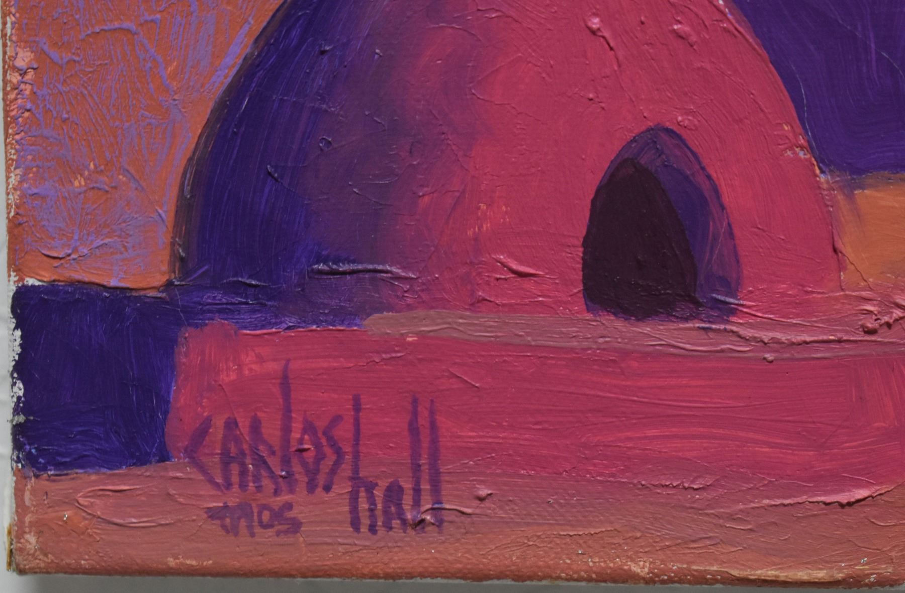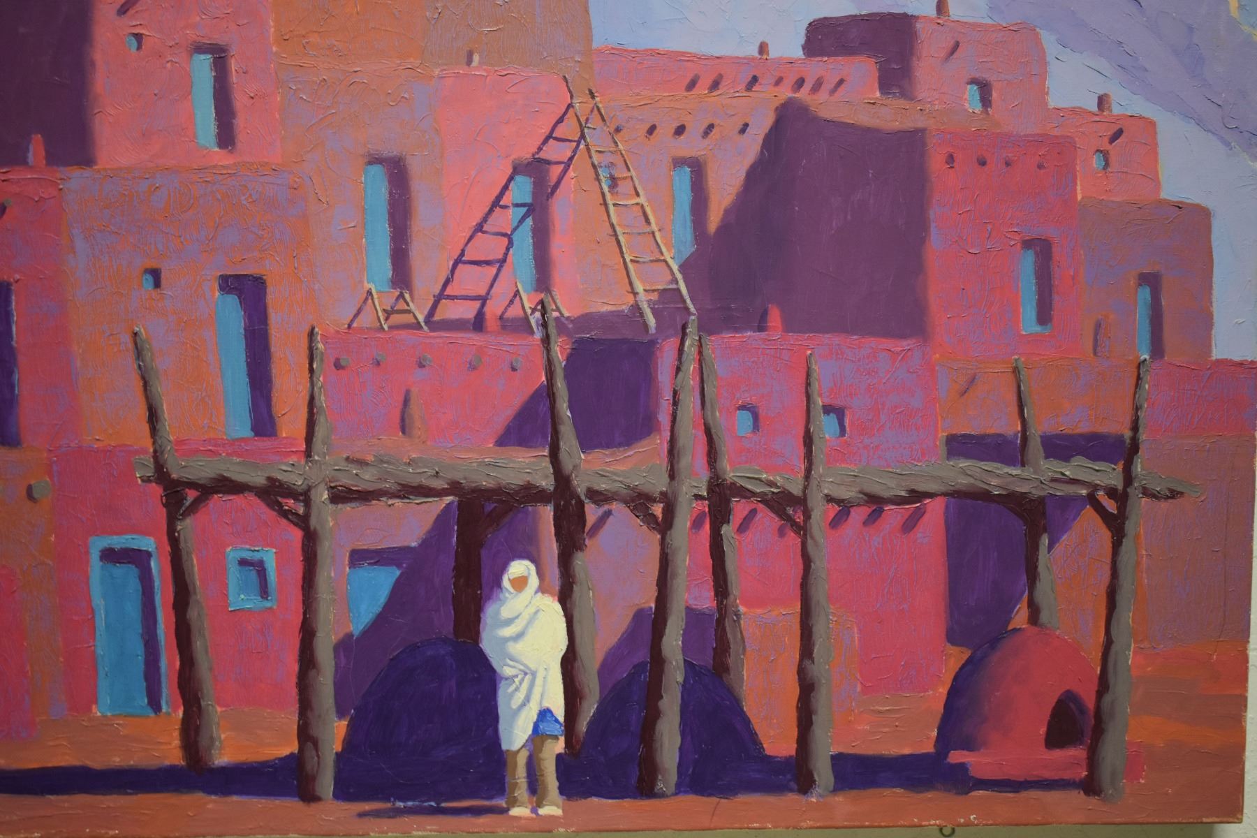 1970-80's Taos, original hand painted oil on canvas depicting Pueblo by Carlos Hall 30" x 40"