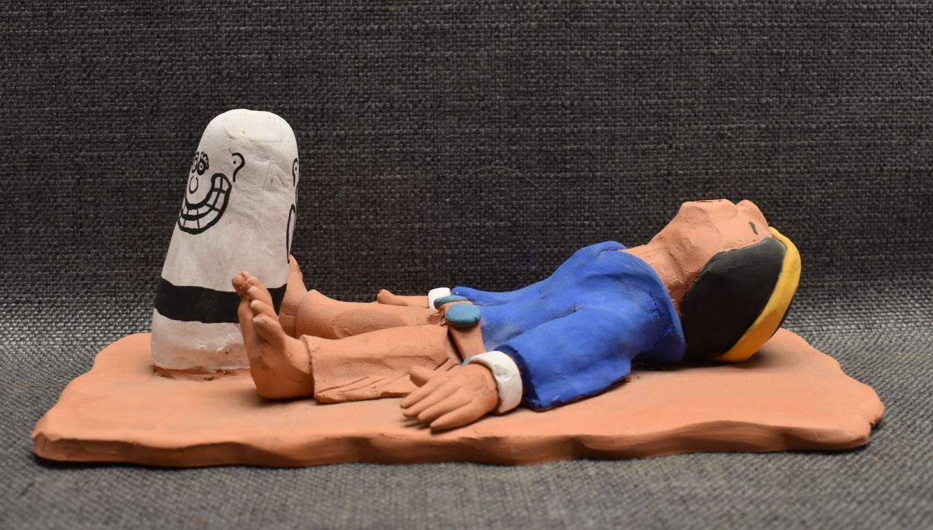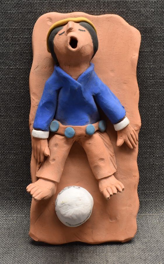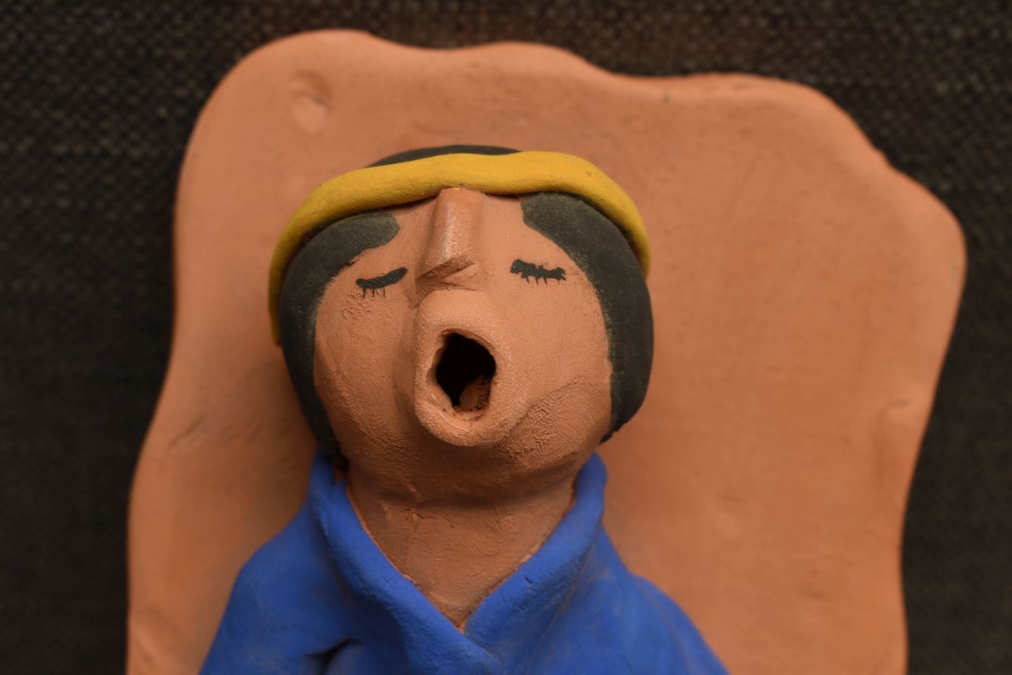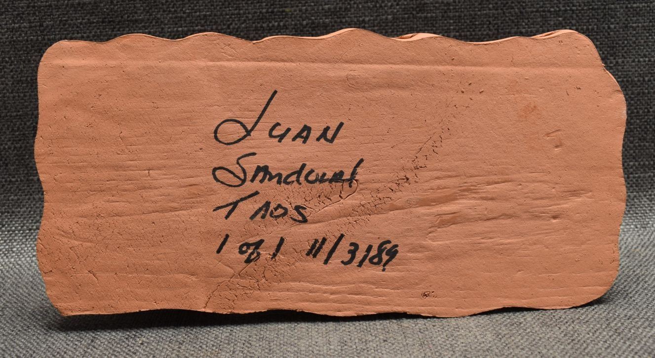 1989 San Juan Indian, hand coiled and painted pottery Halloween scene. Signed Juan Sandoval. 4'' x 10'' x 4.5''