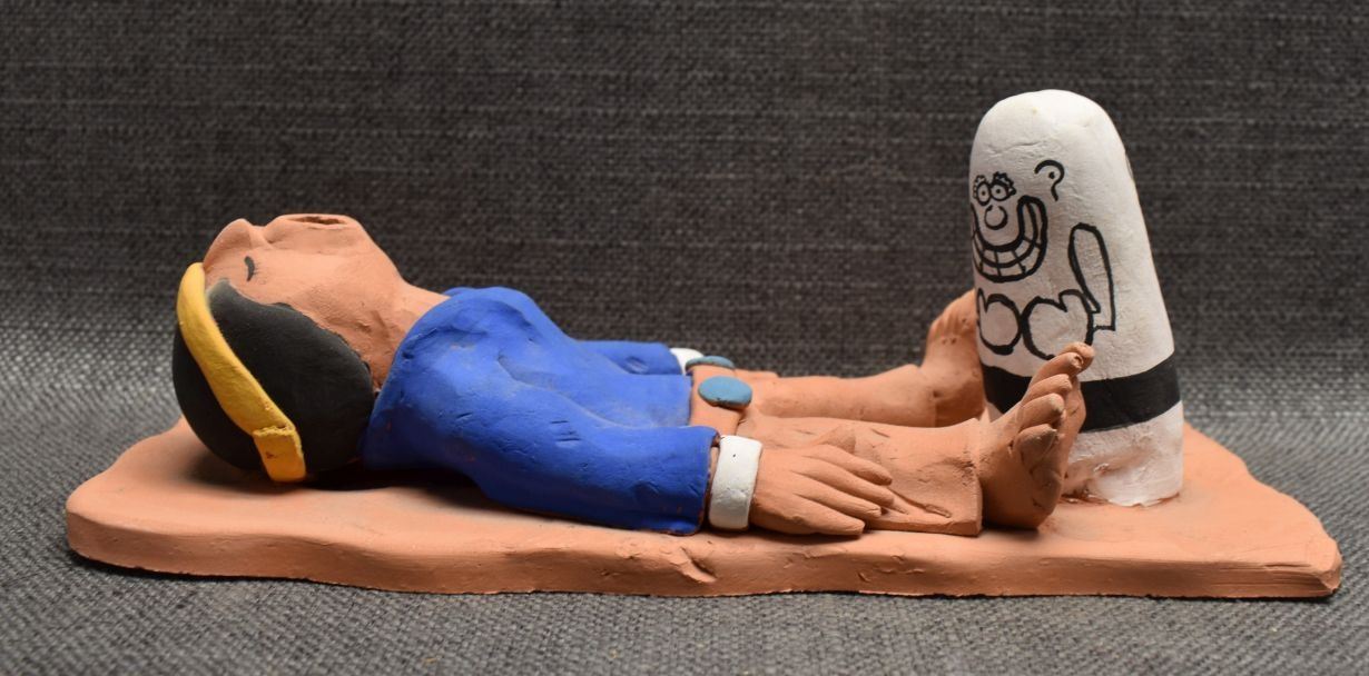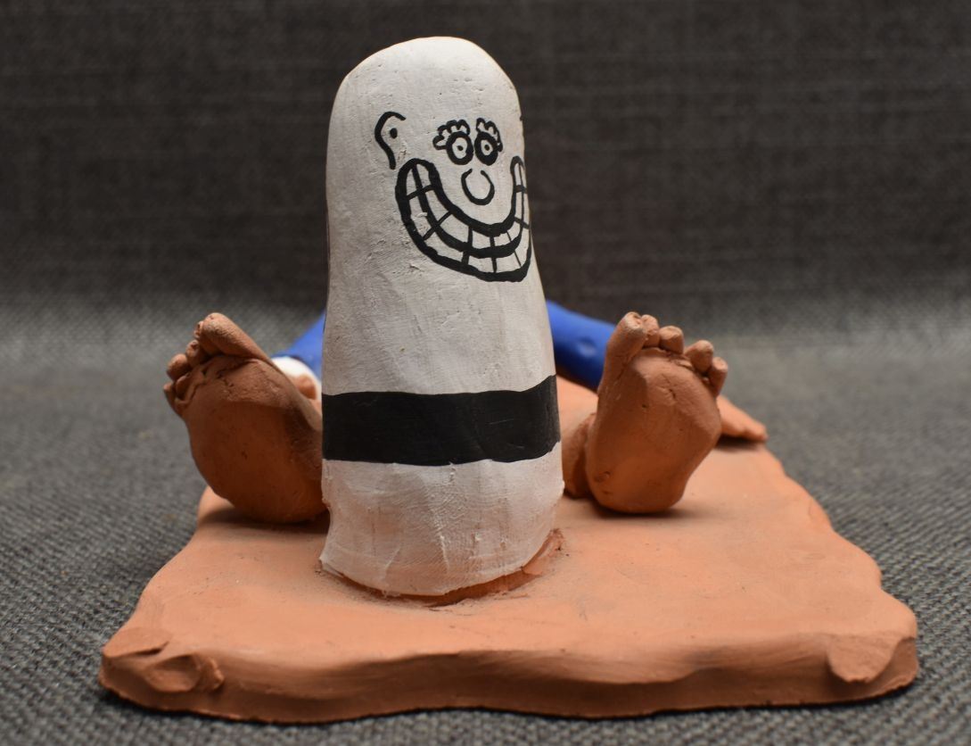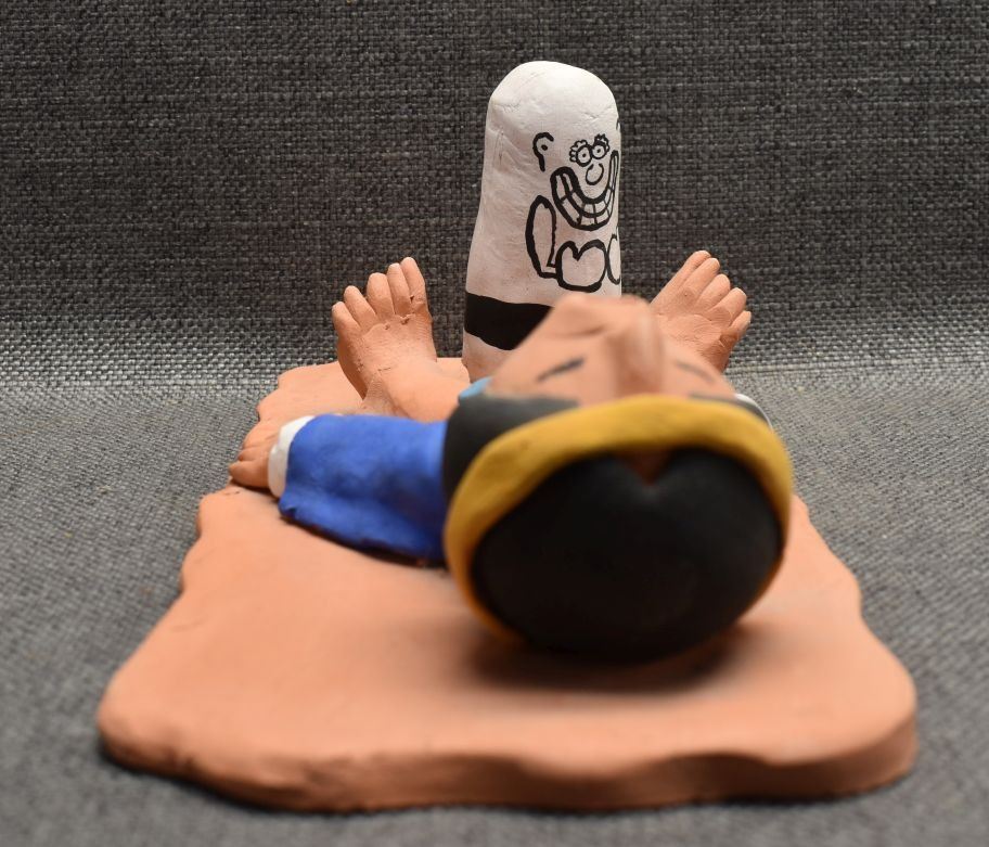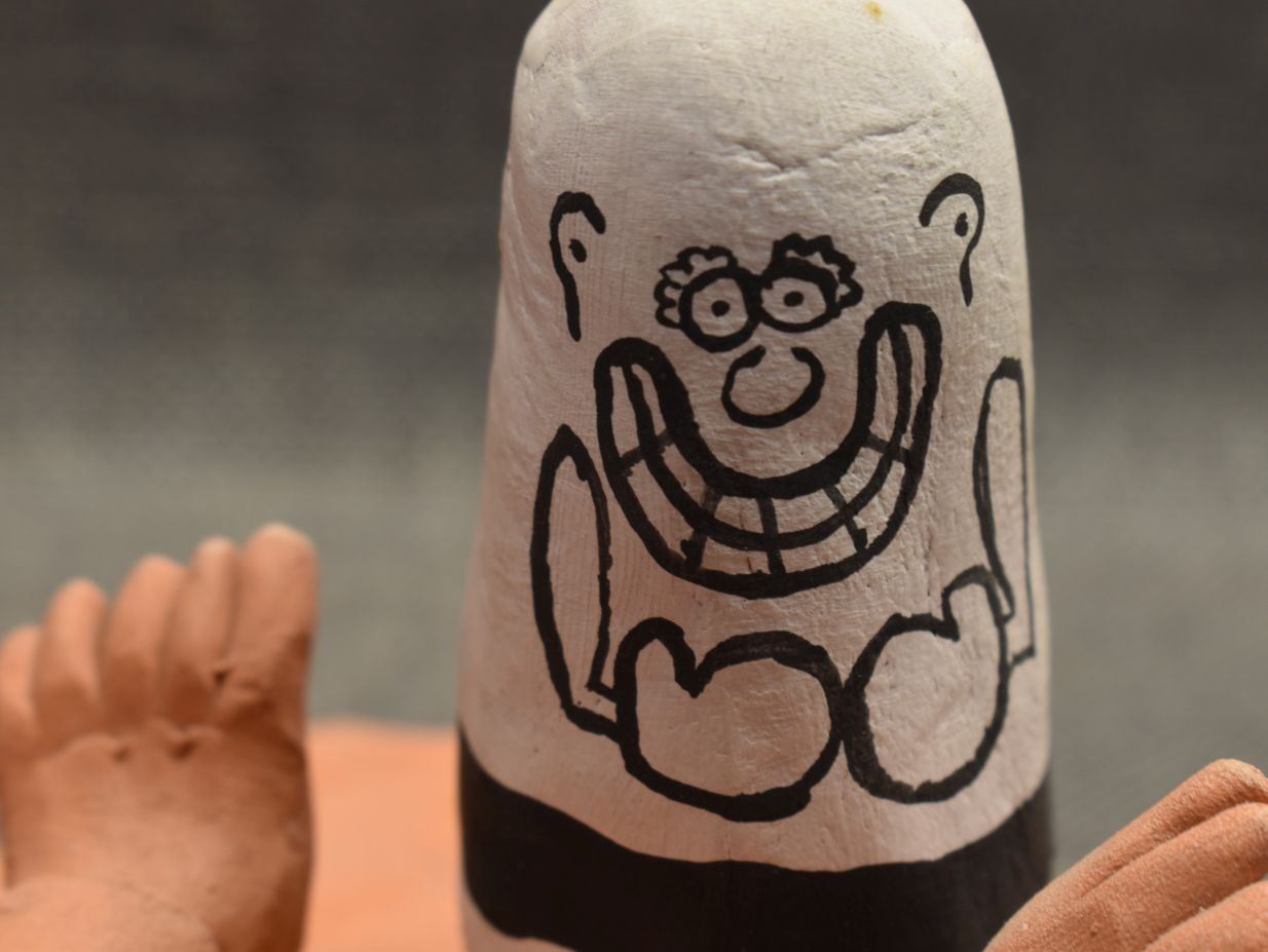 1989 San Juan Indian, hand coiled and painted pottery Halloween scene. Signed Juan Sandoval. 4'' x 10'' x 4.5''