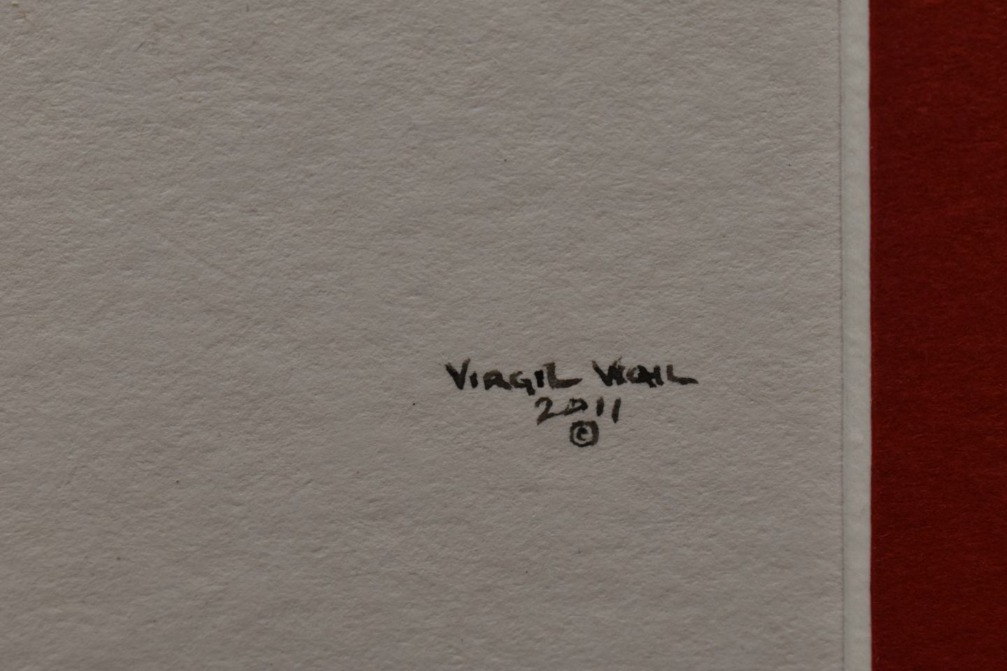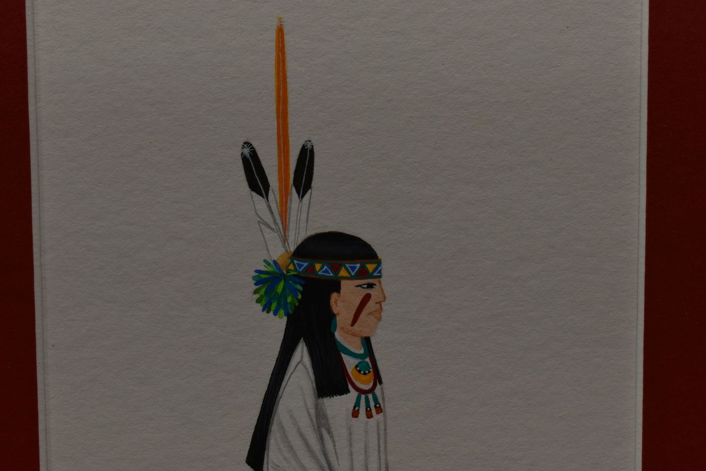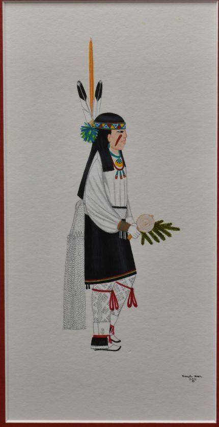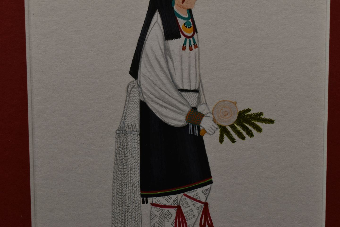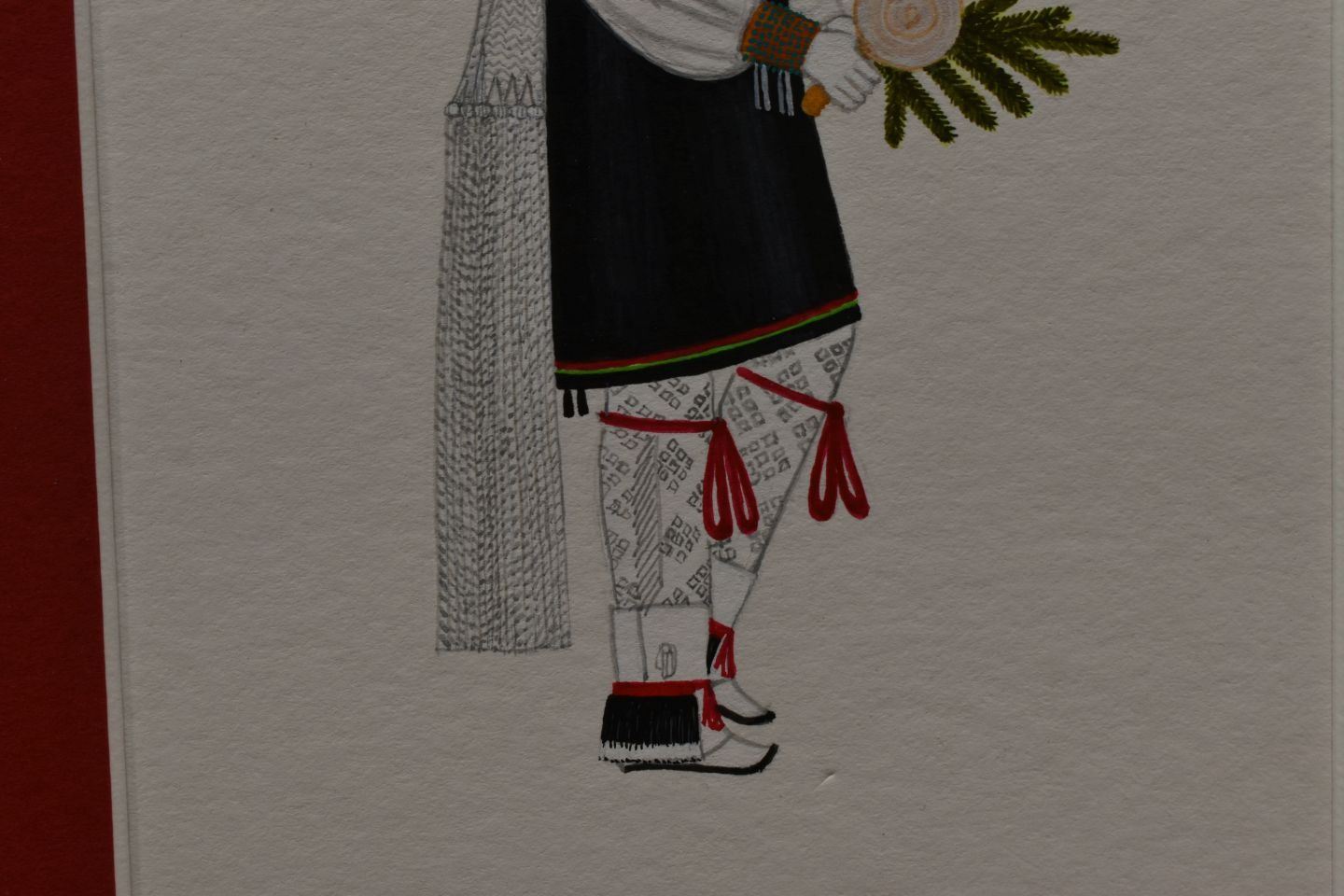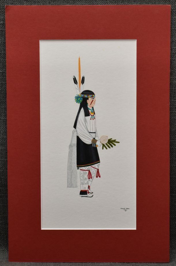 2011 Tesuque, original hand painted on paper depicting pueblo dancer signed Virgil Vigil. 11'' x 5'' matt size 15'' x 9.5''