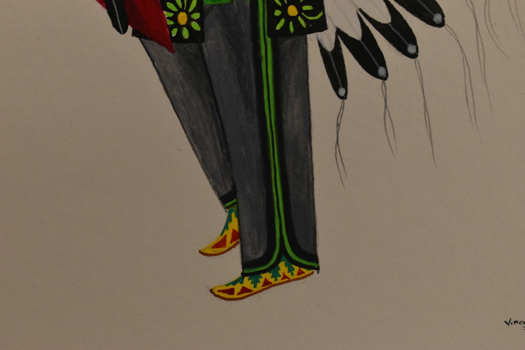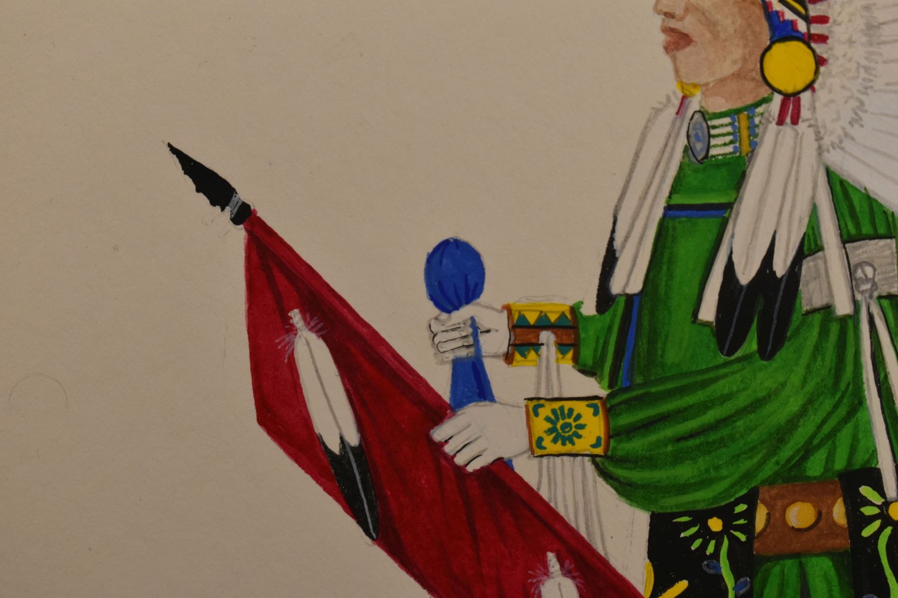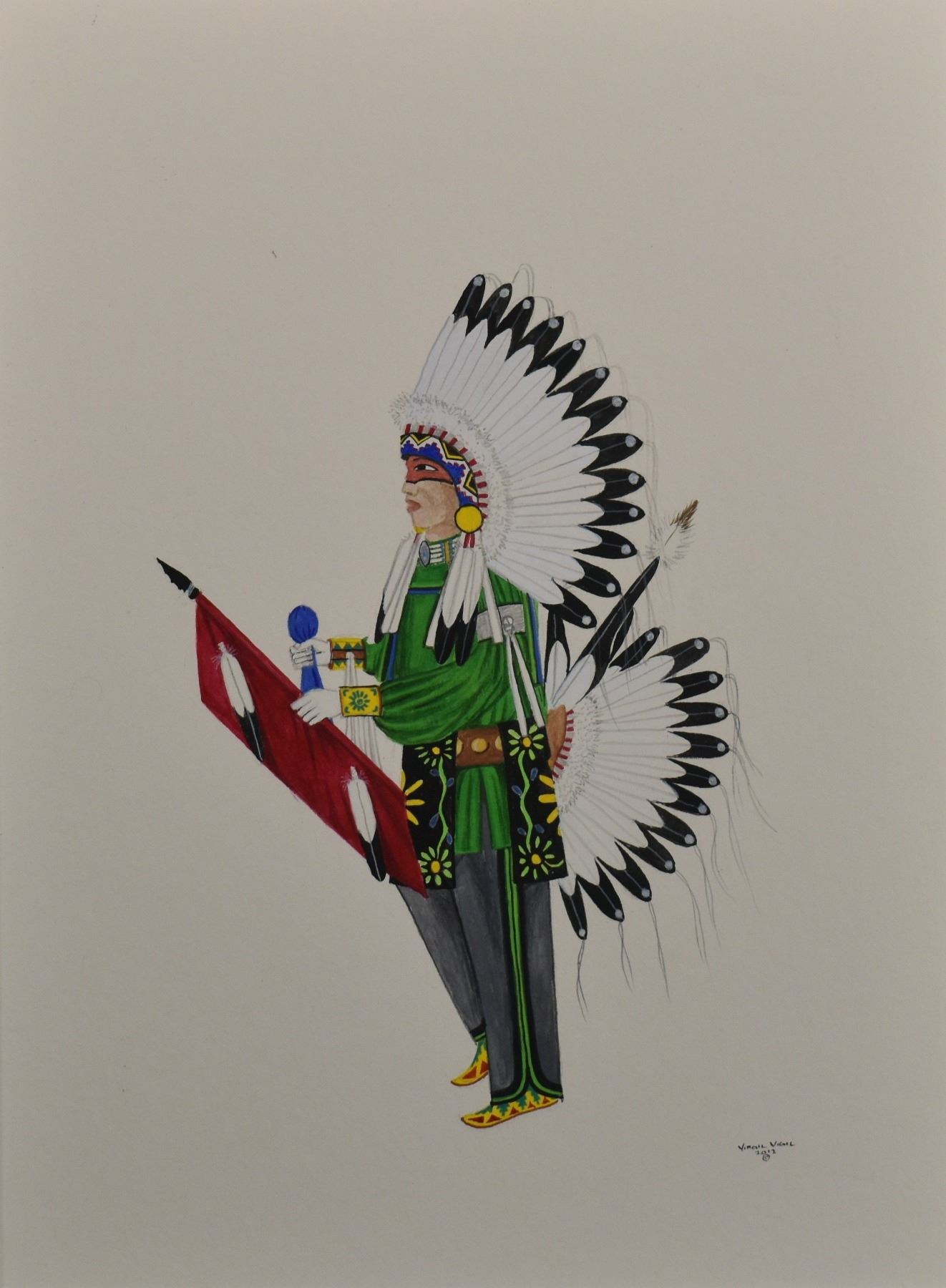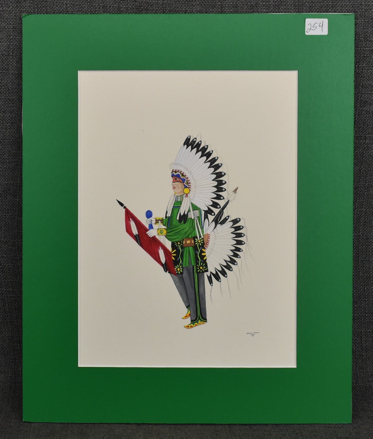 2012 Tesuque, original hand painted on paper depicting Comanche warrior by Virgil Vigil. 11.5" x 8.5" matted to 16" x 13"