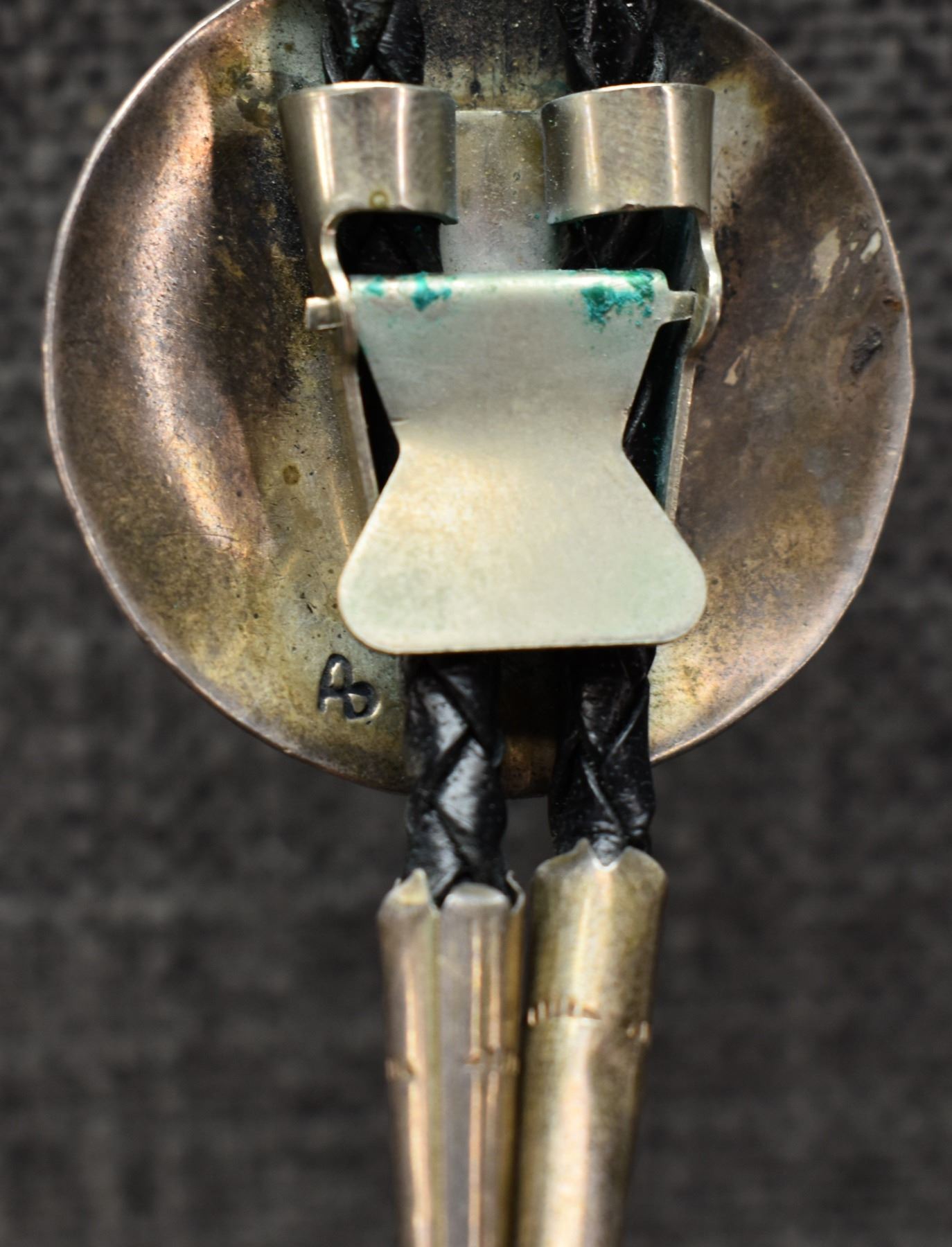 1980-90's Zuni, sterling silver inlaid thunderbird design 1" x 1". Navajo sterling silver stamped design, signed with hallmark 1.5" diameter. Navajo beaded wedding basket design on leather 2" diameter