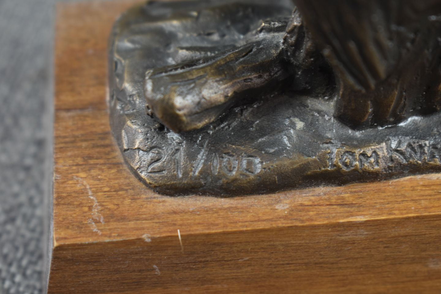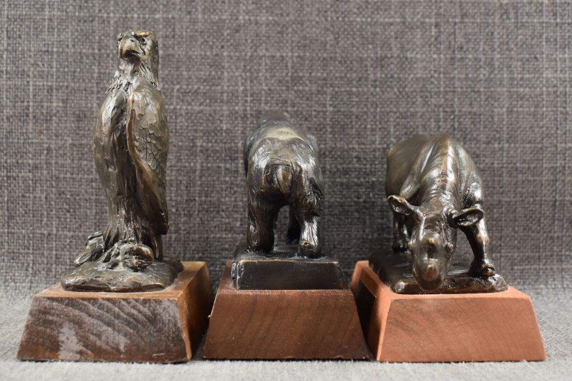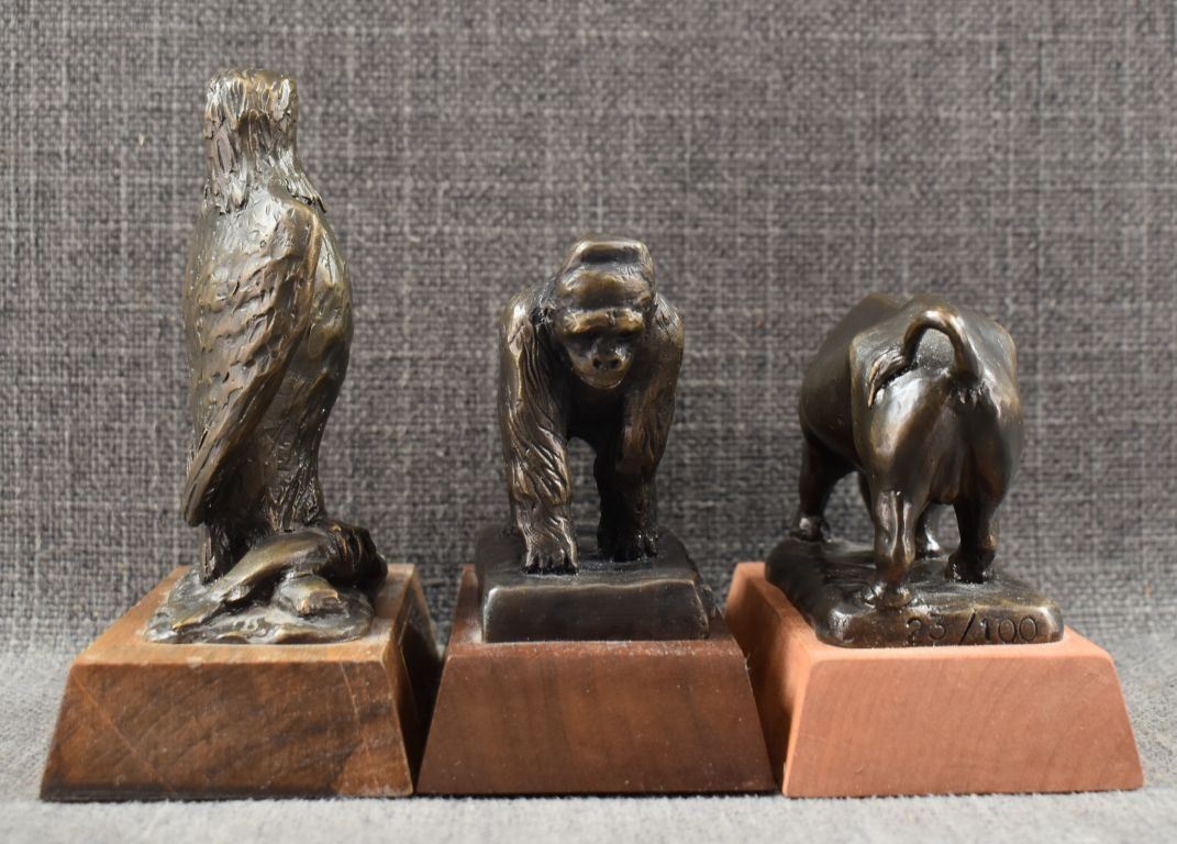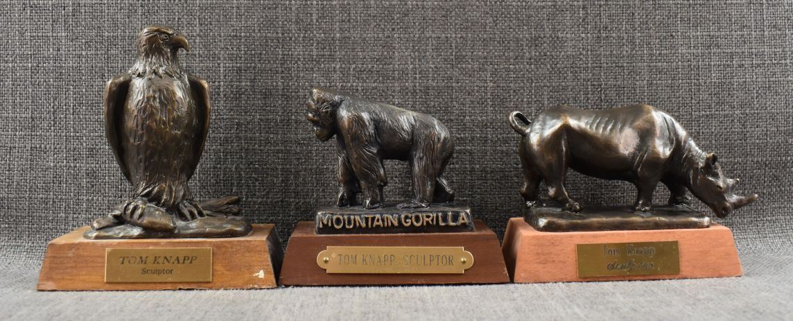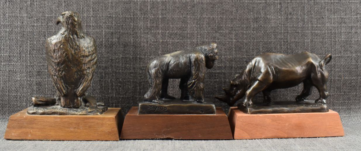 Three bronzes by tom Knapp. Gorilla 22/100 2009, Hawk 21/100 2007, Rhinoceros 1986 23/100. tallest excluding base 4.25" x 3"