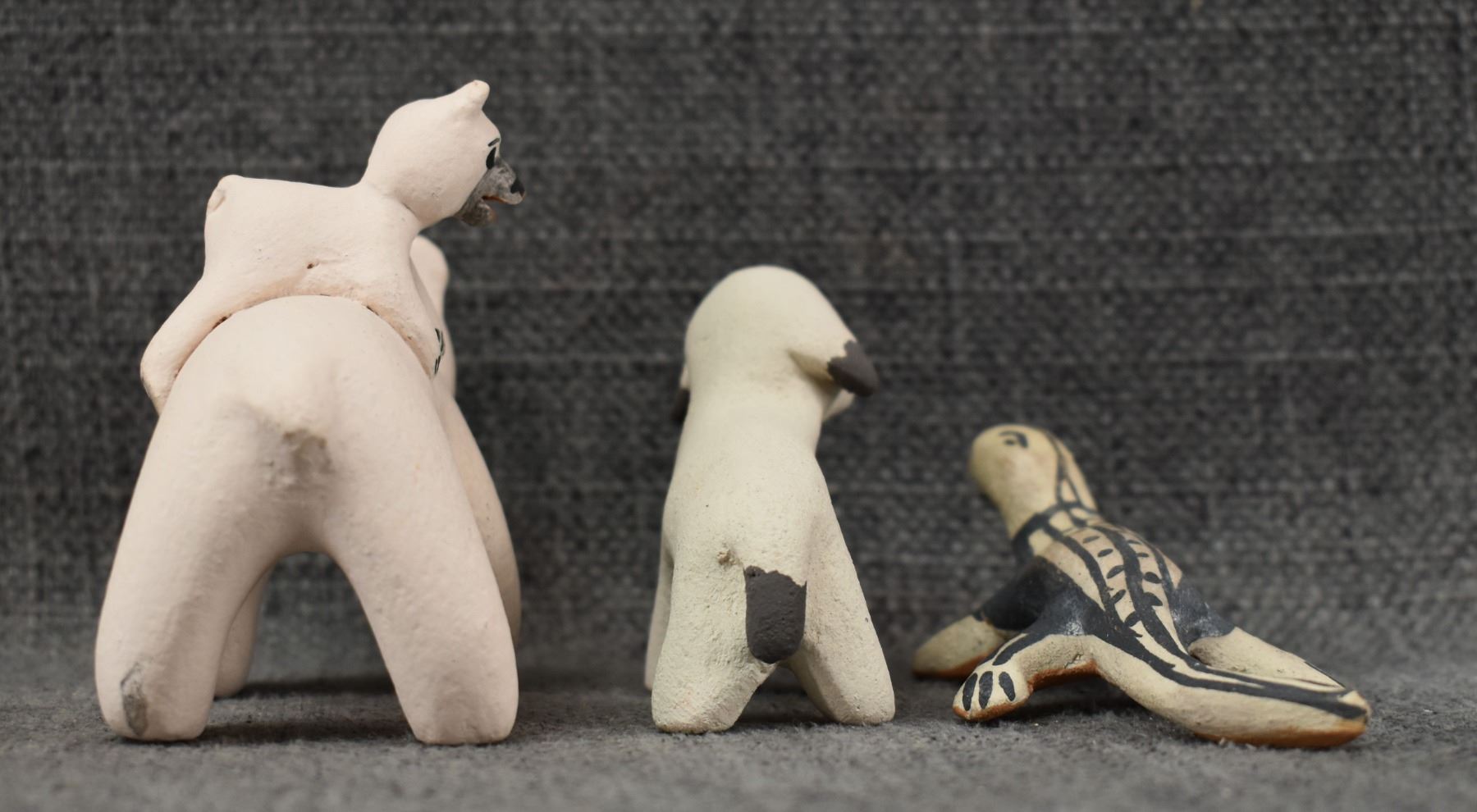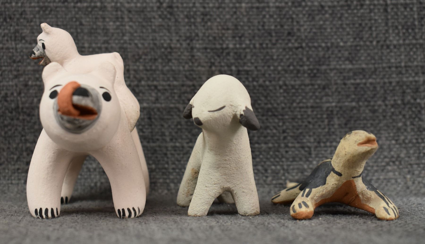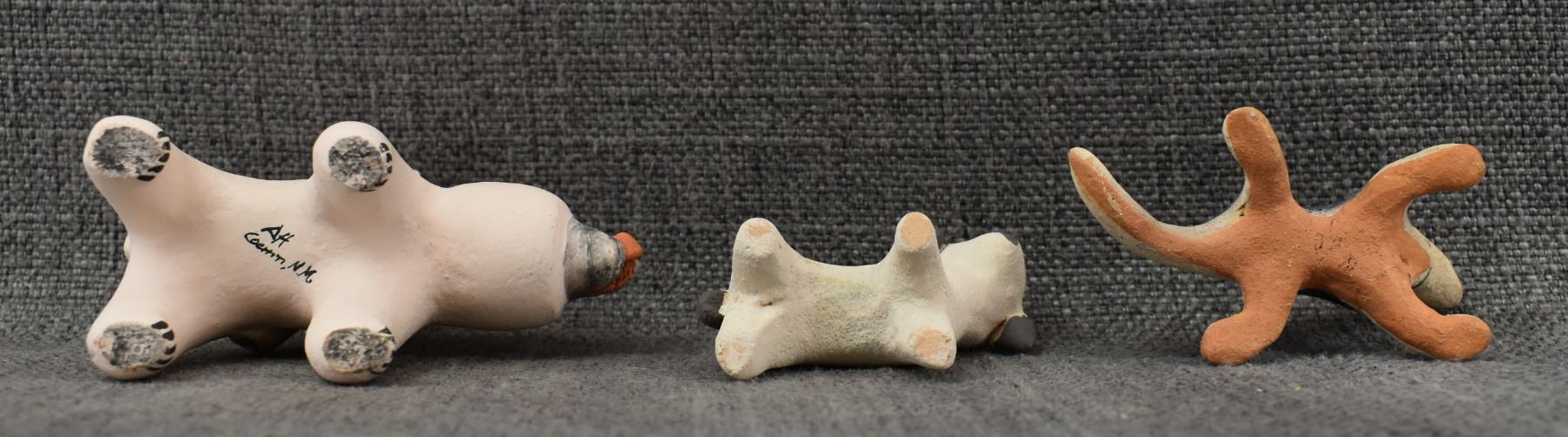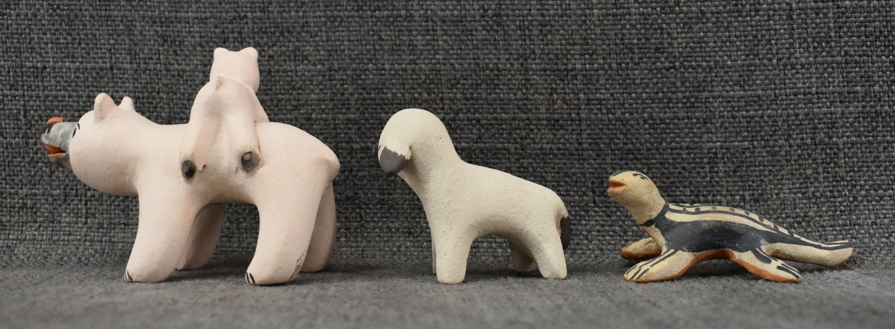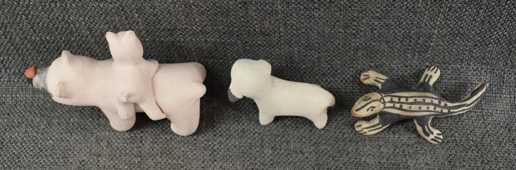 three Cochiti pottery animals, depicting bears signed A. H., sheep un signed, lizard has been broken and glued unsigned 2.75" x 4"