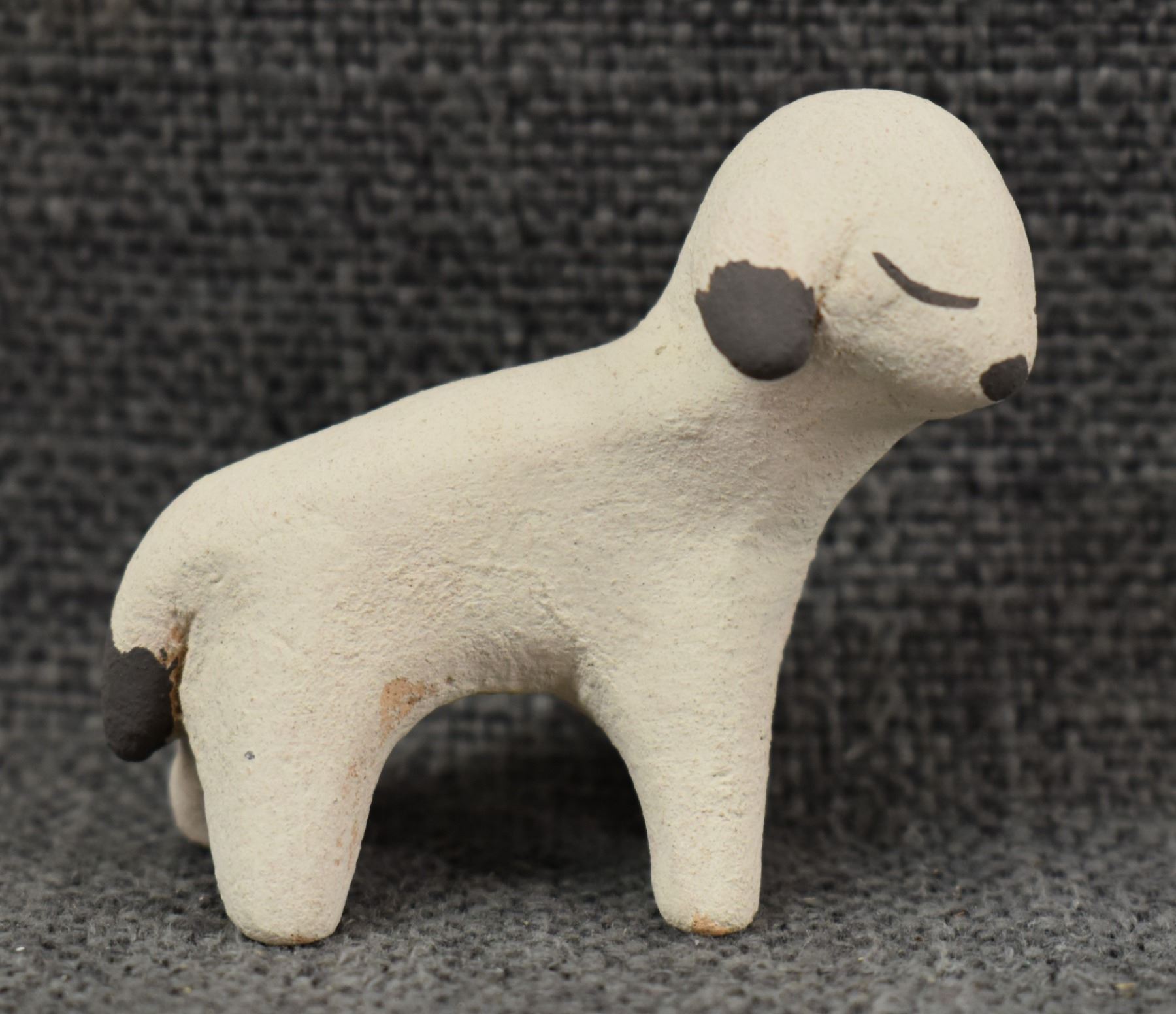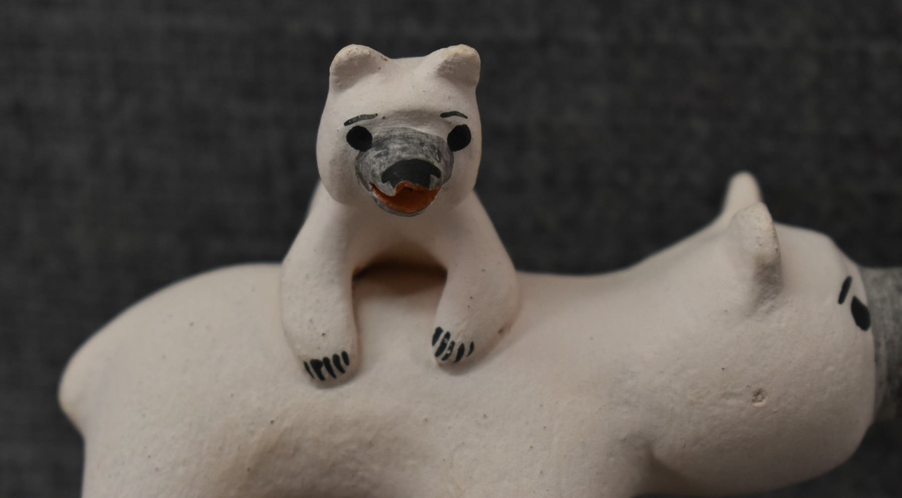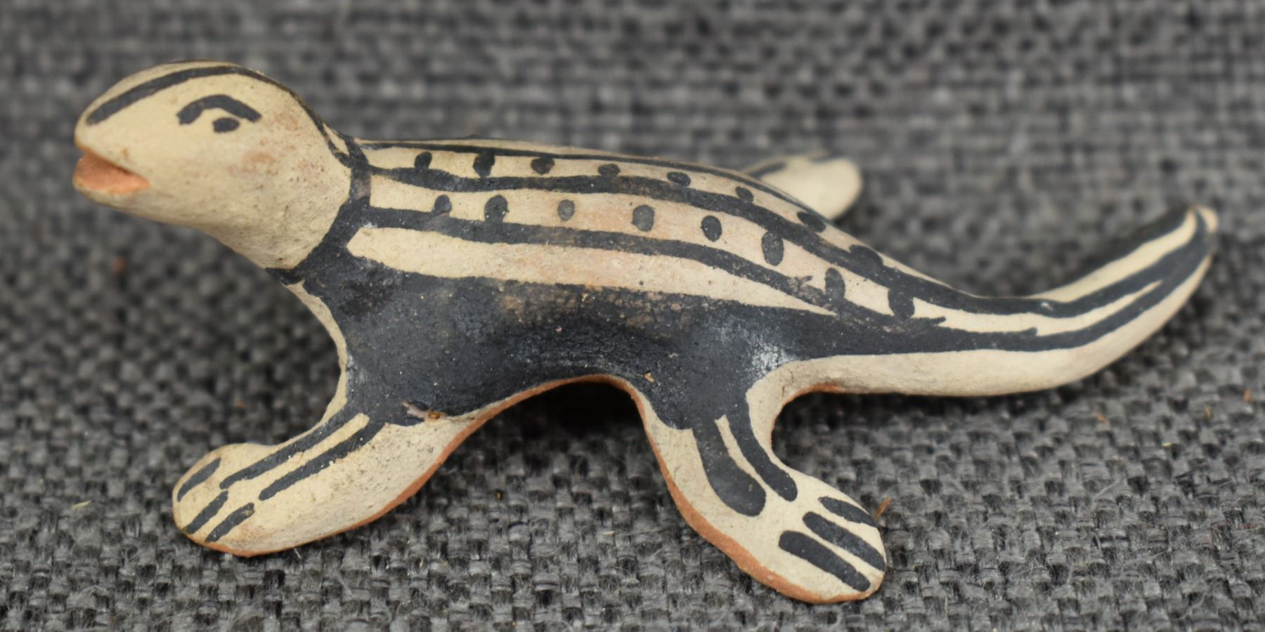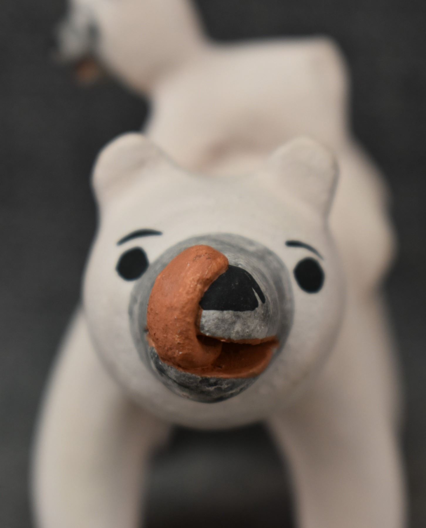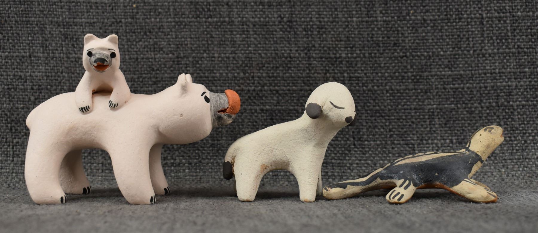 three Cochiti pottery animals, depicting bears signed A. H., sheep un signed, lizard has been broken and glued unsigned 2.75" x 4"