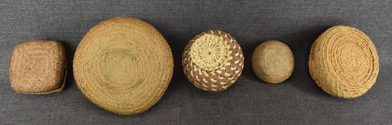 Three decorative baskets two containers one bowl. Two Tarahumara baskets, One olla, one nesting basket with 10 baskets. Largest 3.5" x 6"