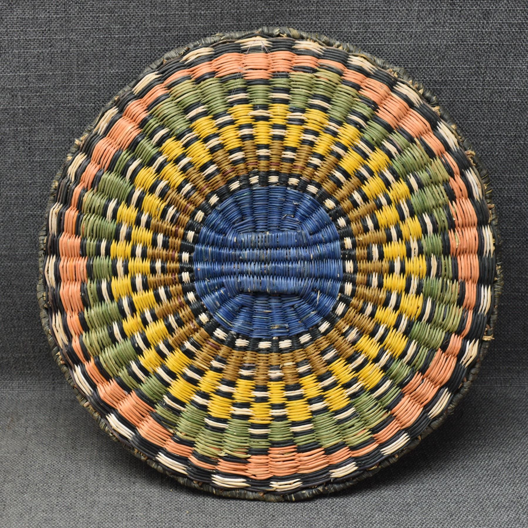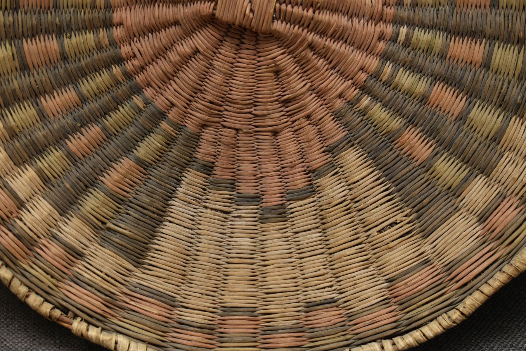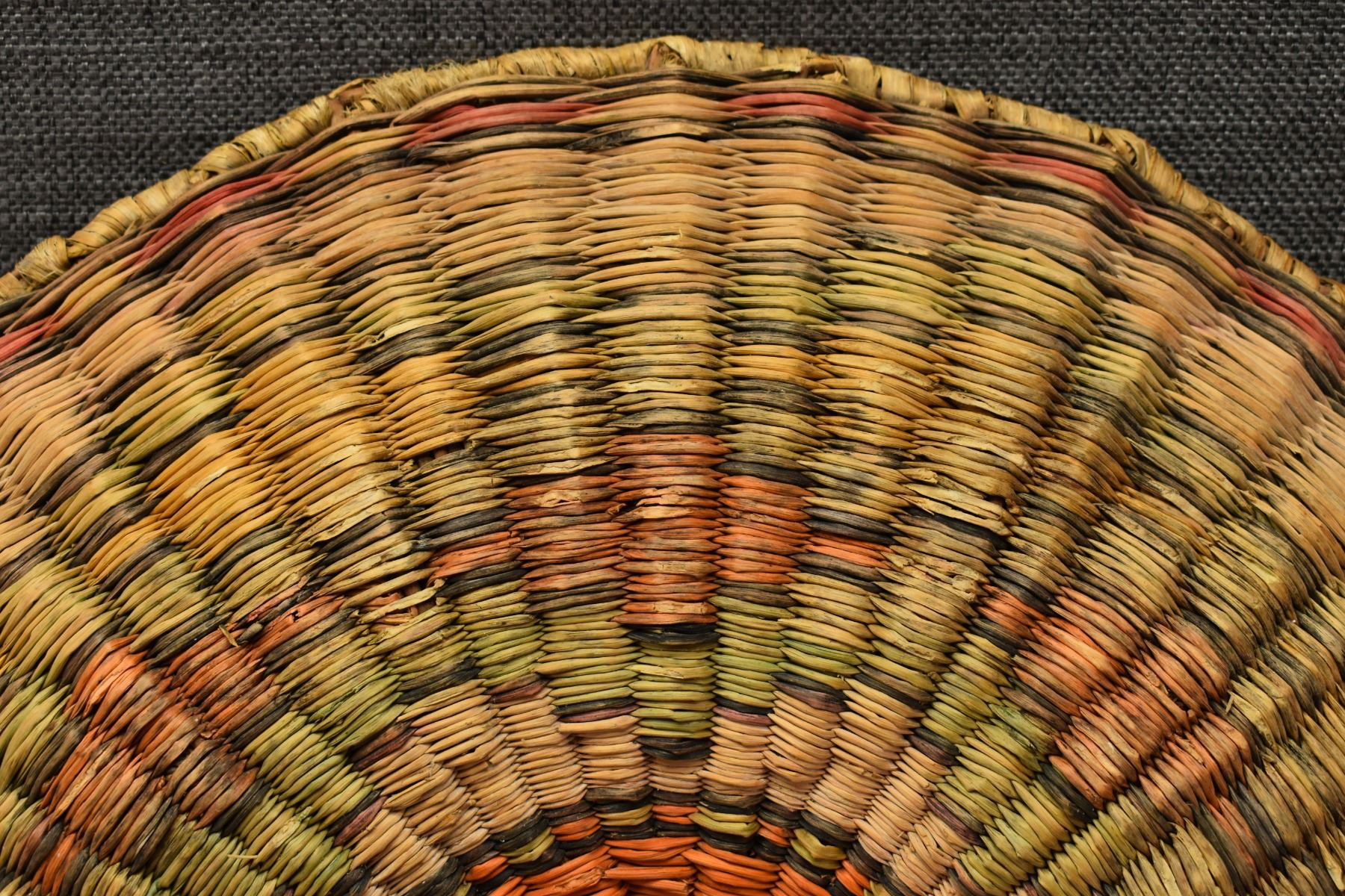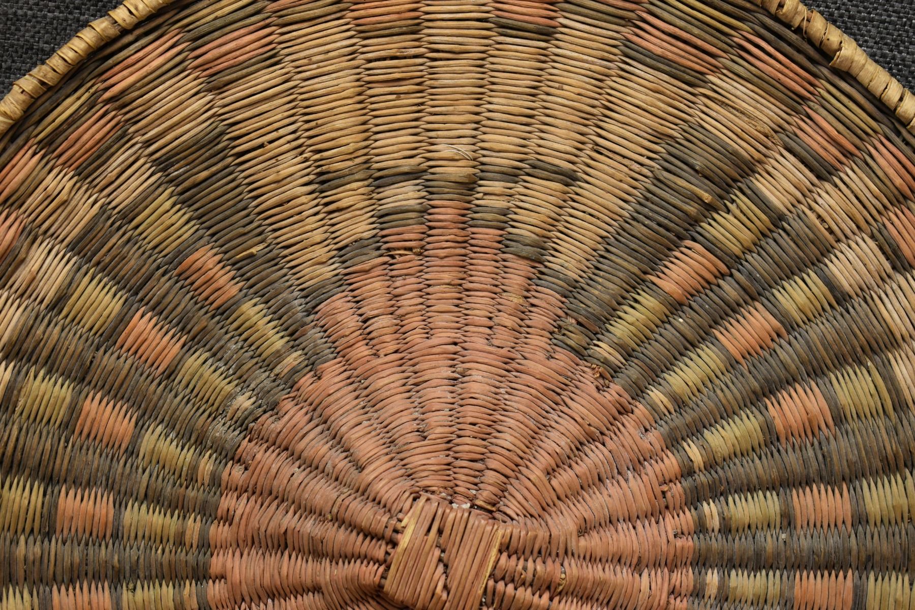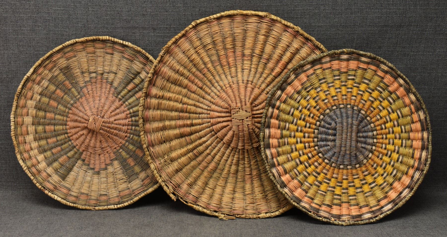 1930's Hopi. Hand woven polychrome design third mesa wicker basketry plaques. Largest is 2'' x 17''