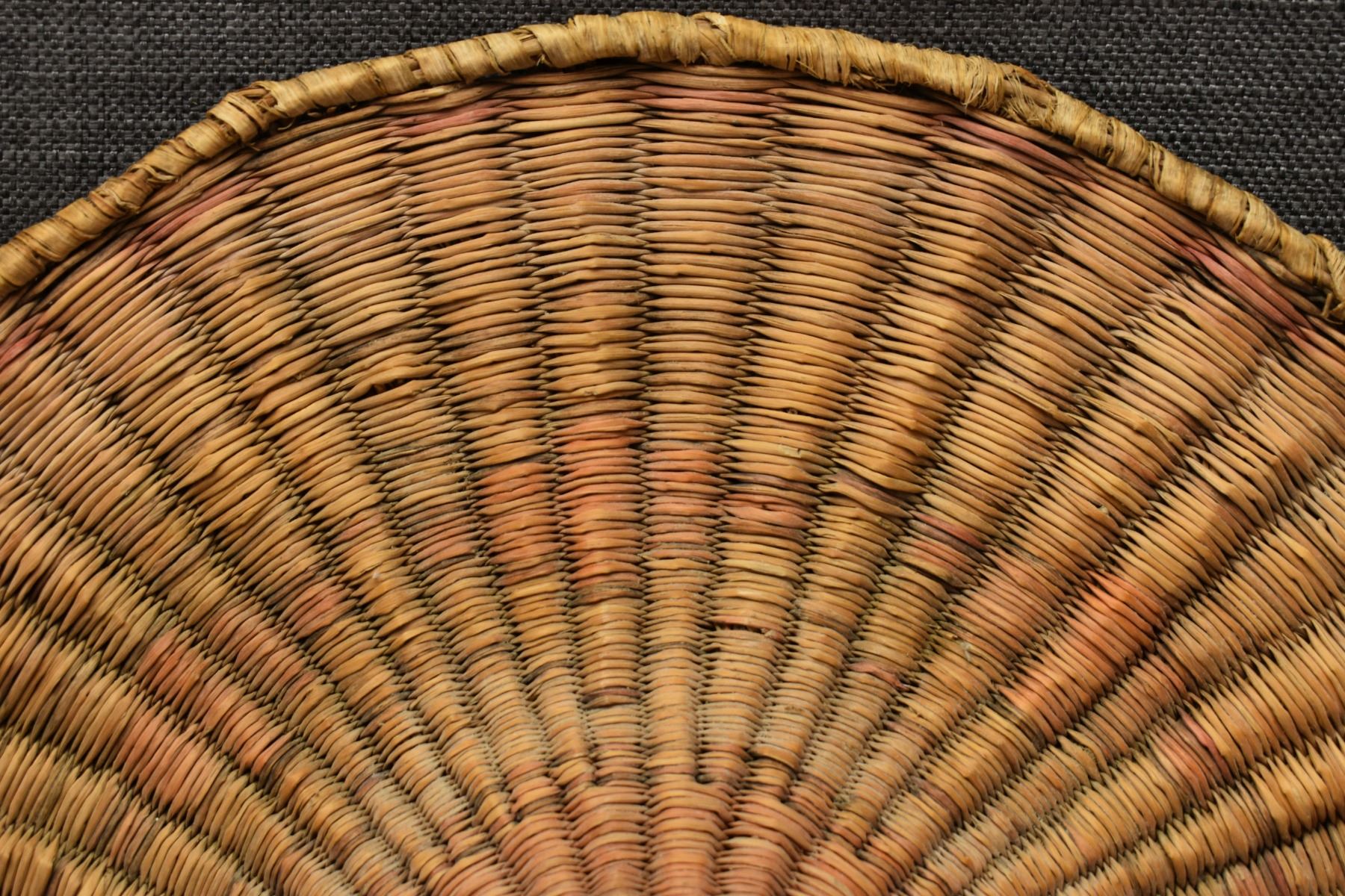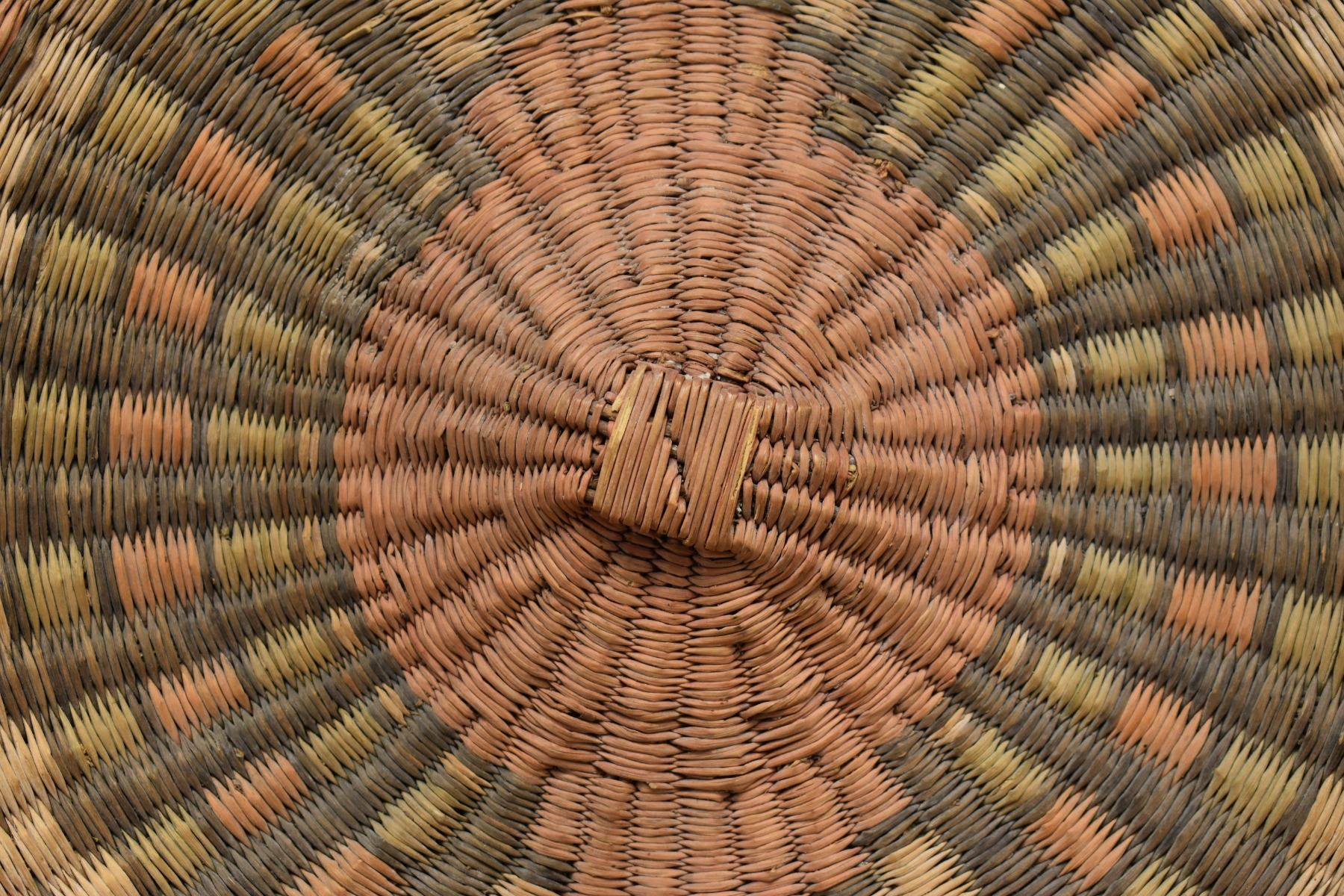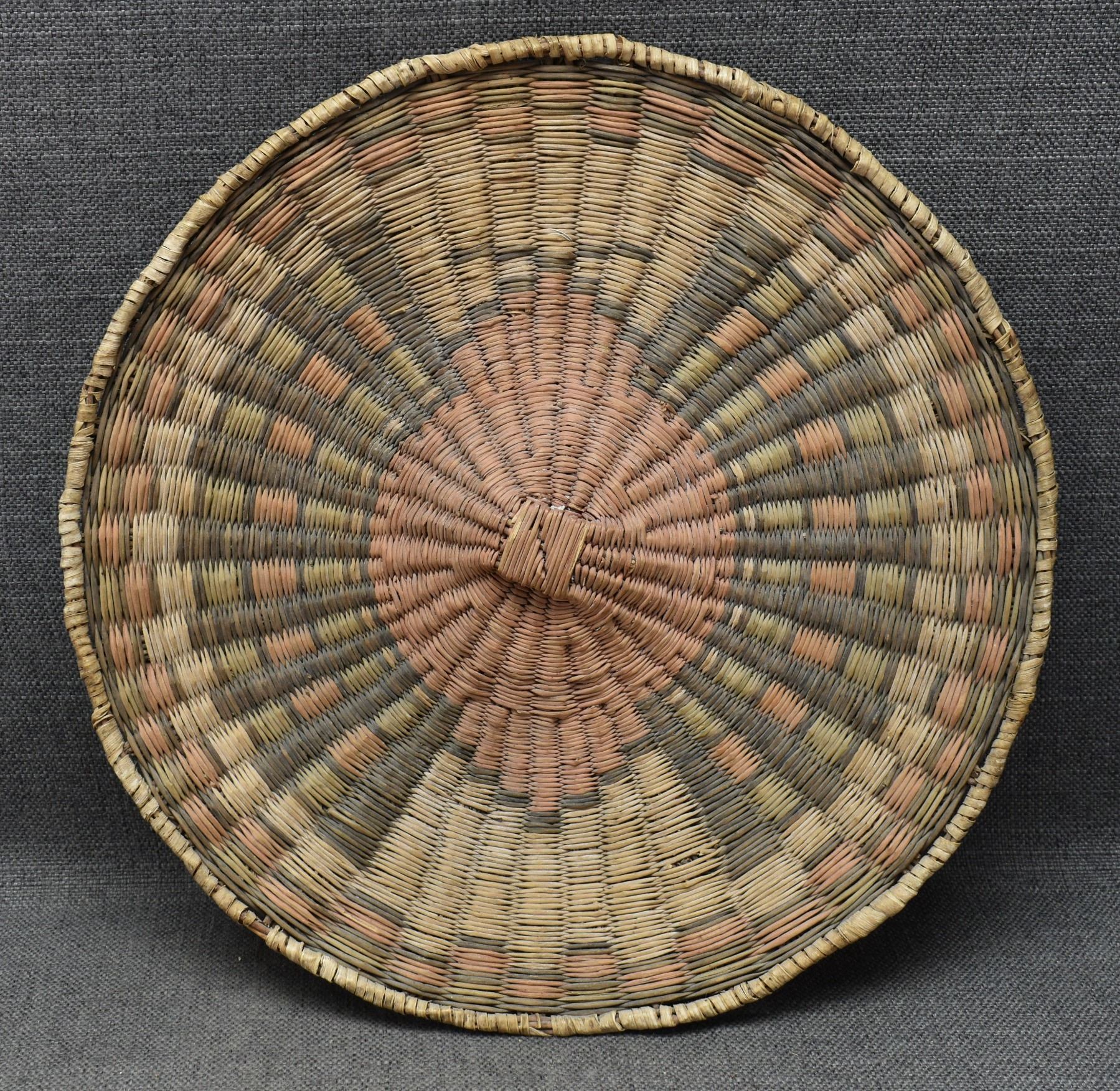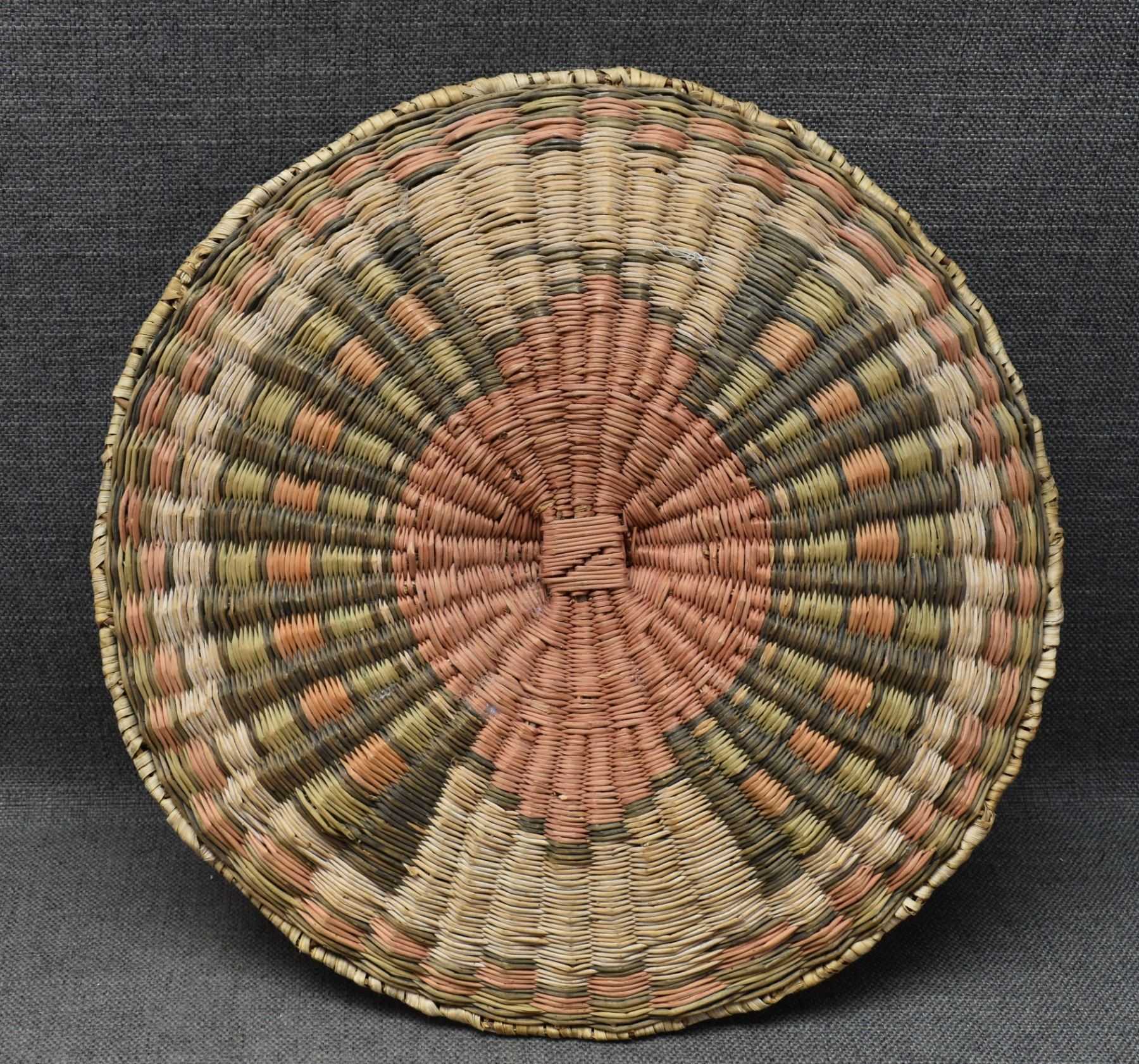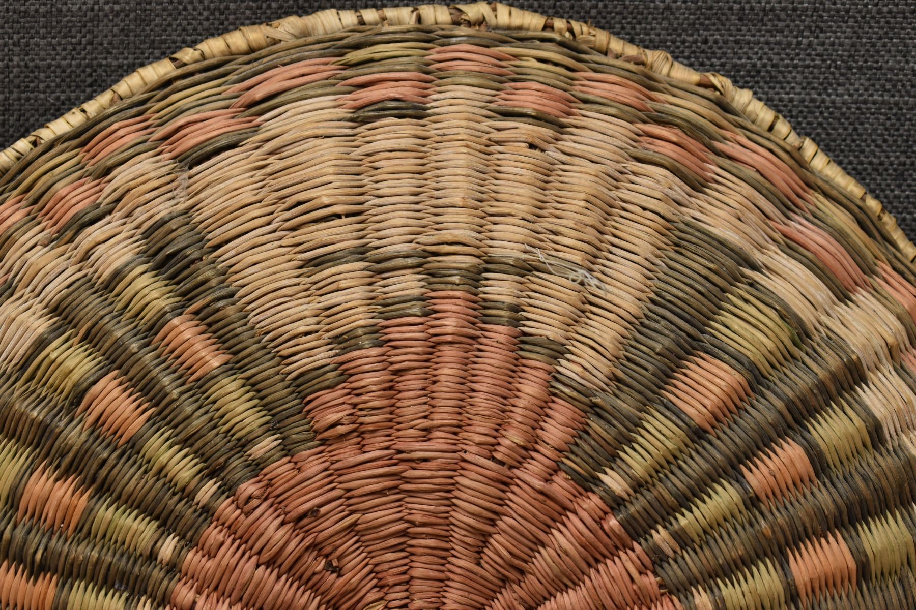 1930's Hopi. Hand woven polychrome design third mesa wicker basketry plaques. Largest is 2'' x 17''