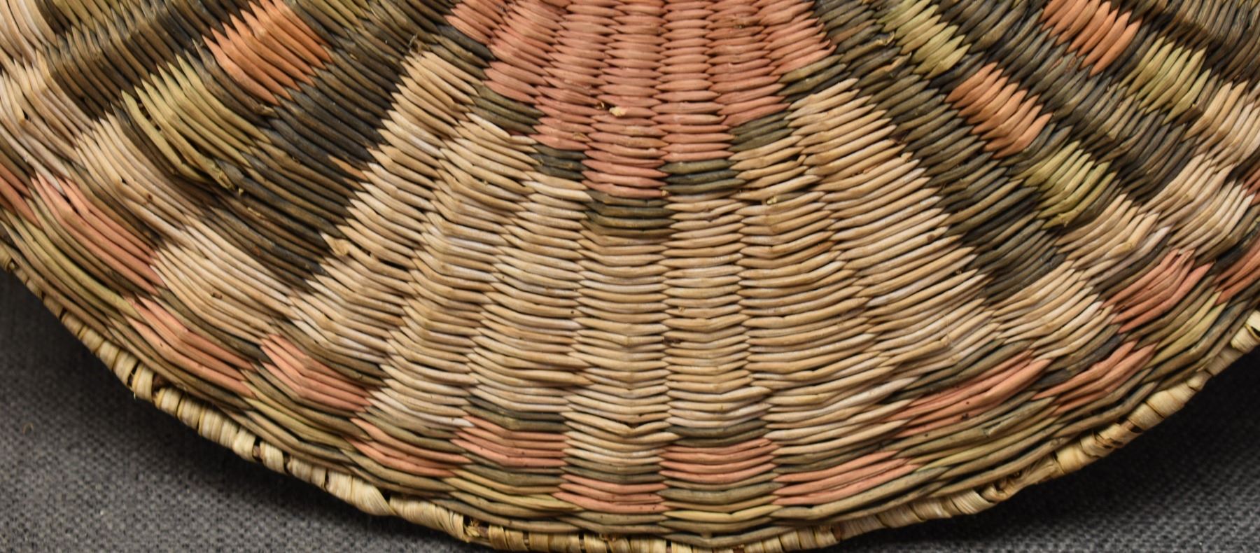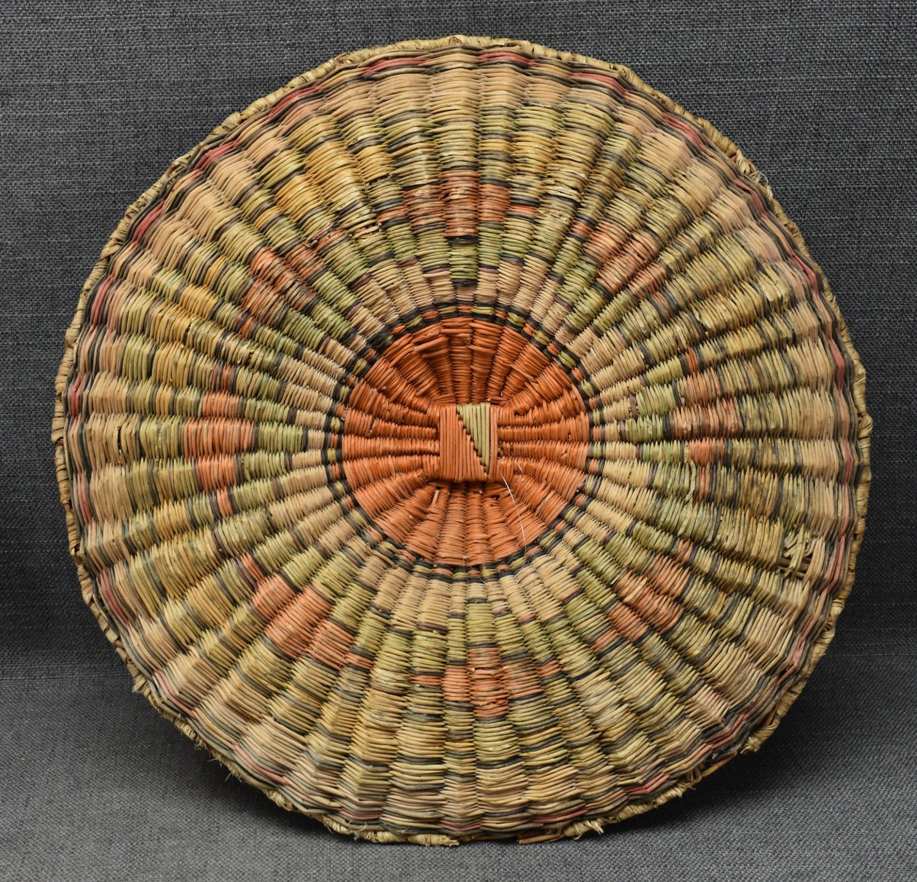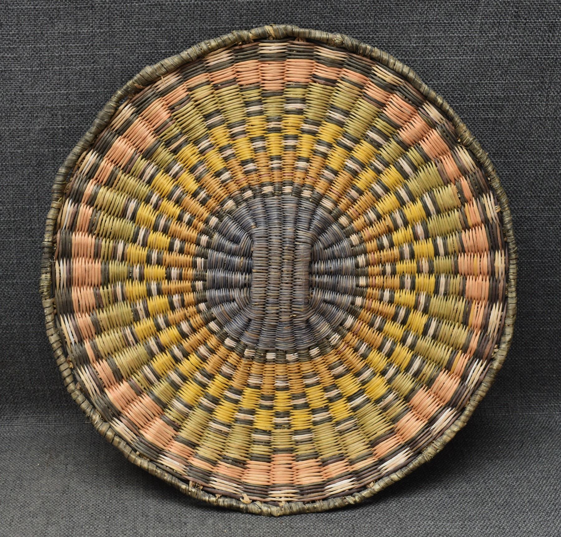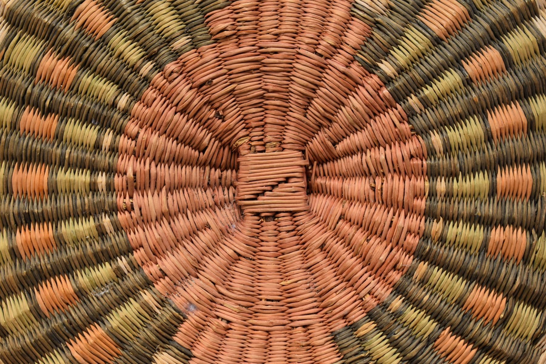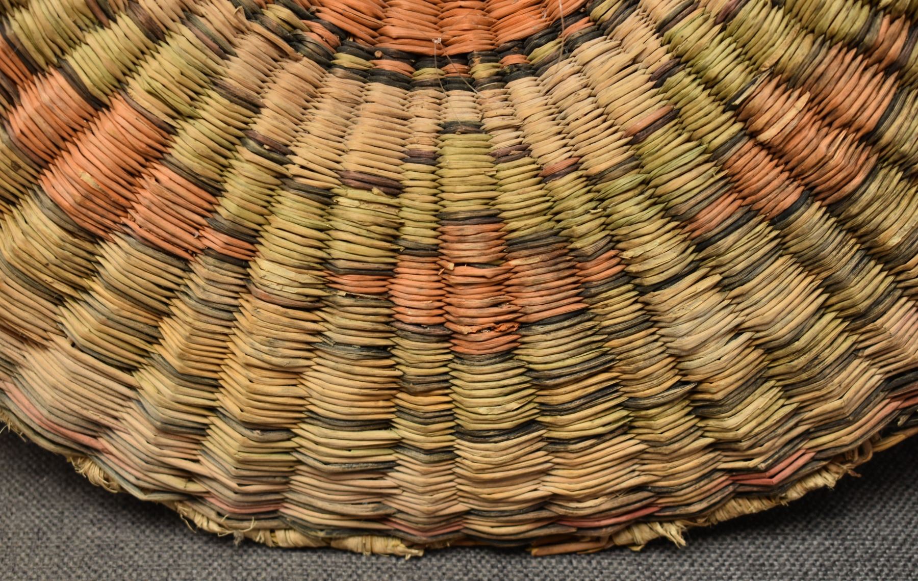 1930's Hopi. Hand woven polychrome design third mesa wicker basketry plaques. Largest is 2'' x 17''