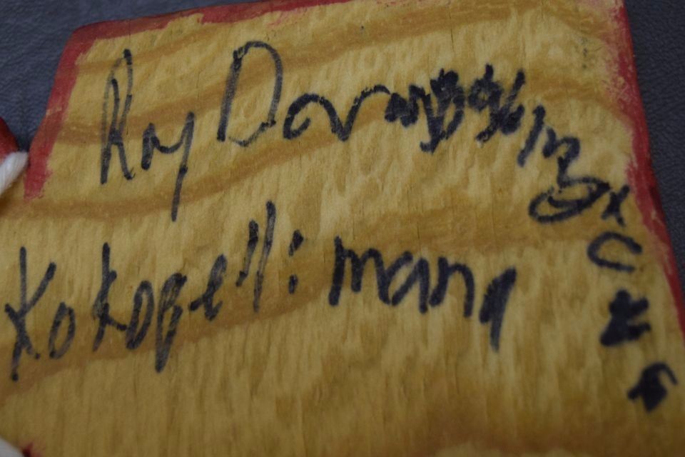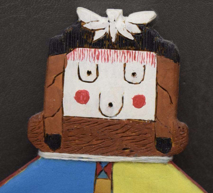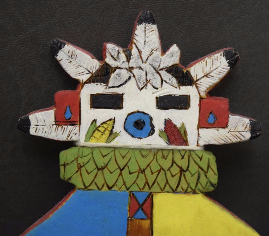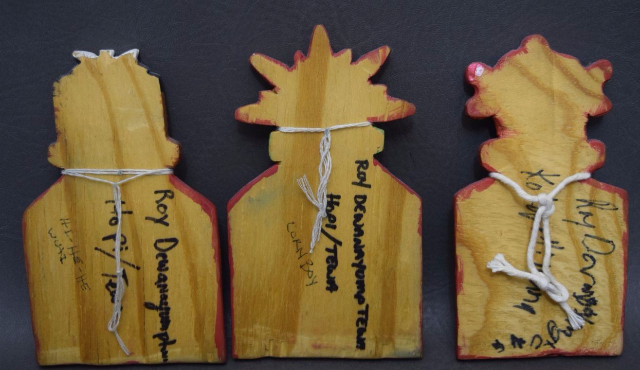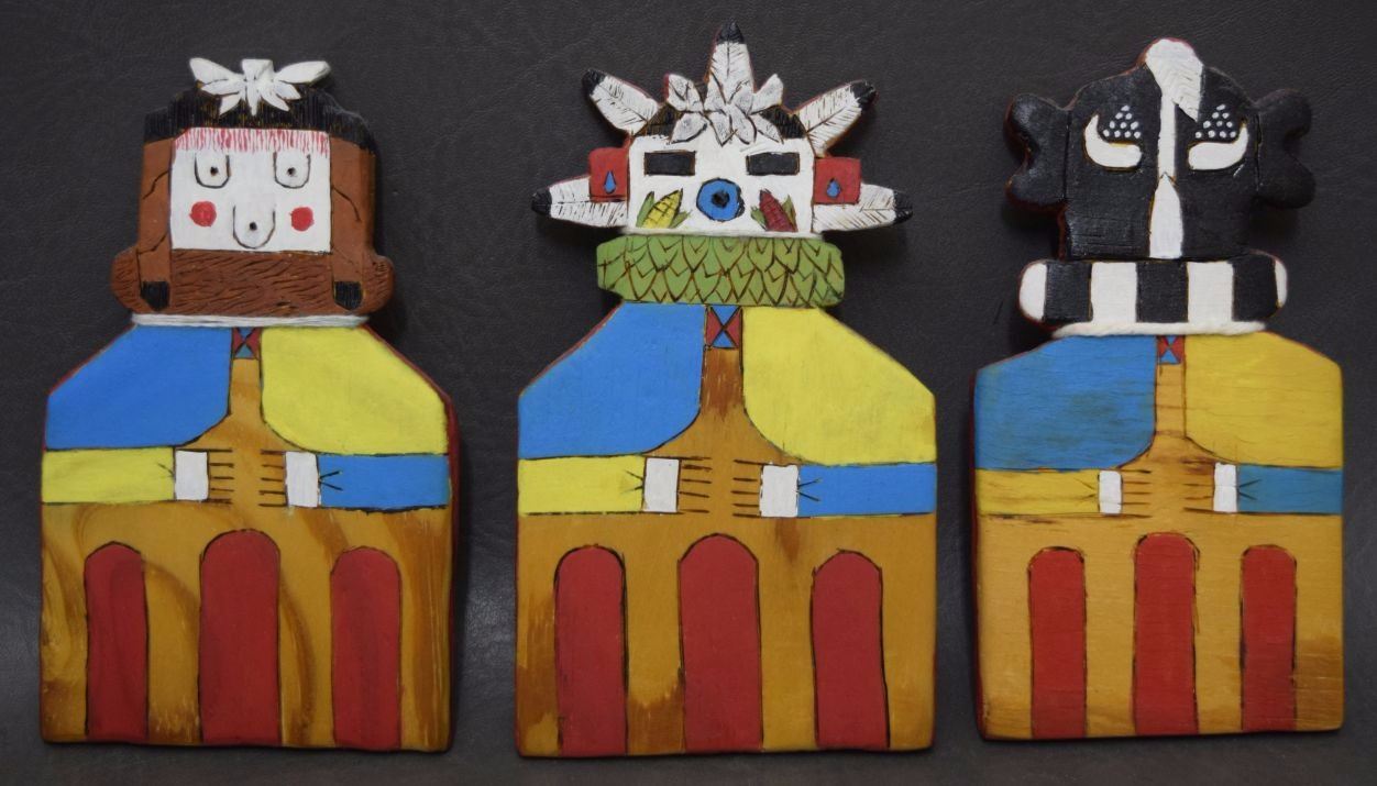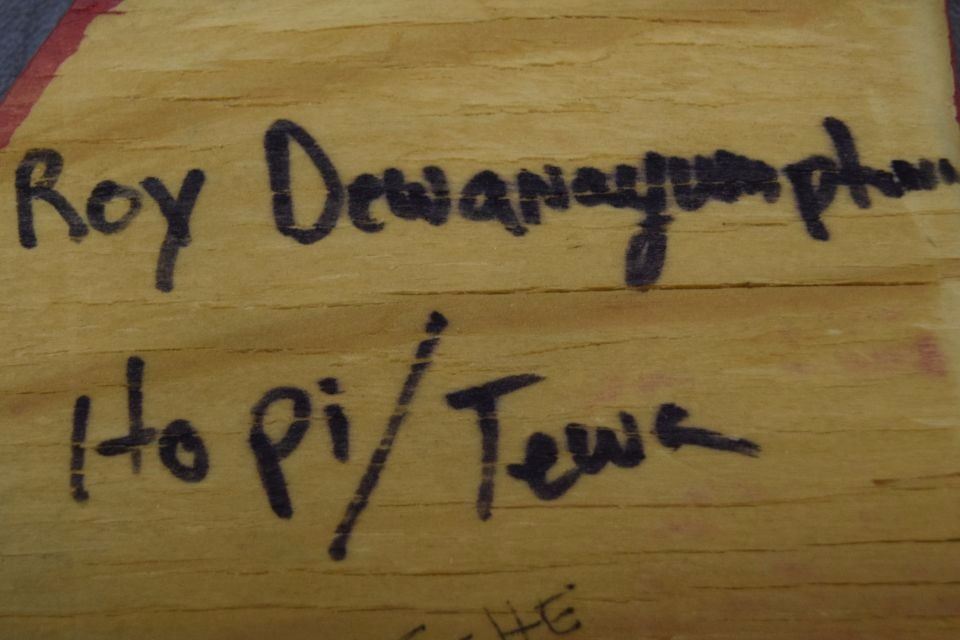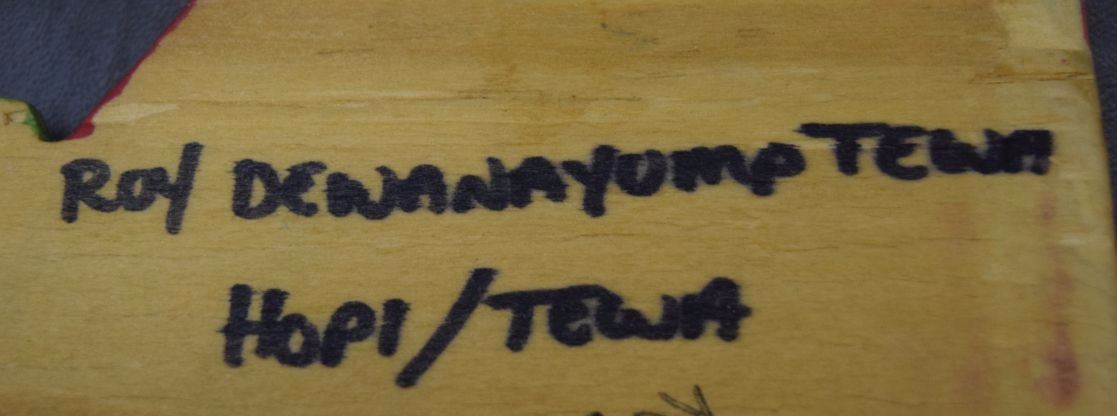 1980's hand painted deign on plywood signed Roy Dewanayumptewa. Largest 3.5'' x 6''