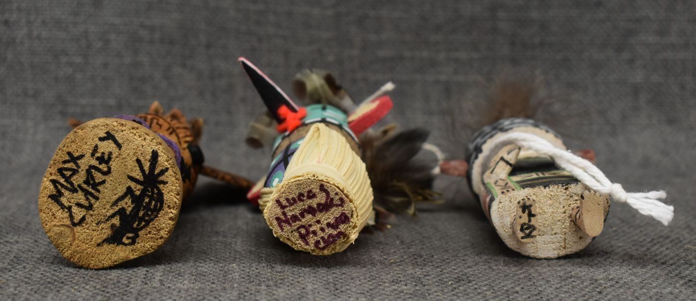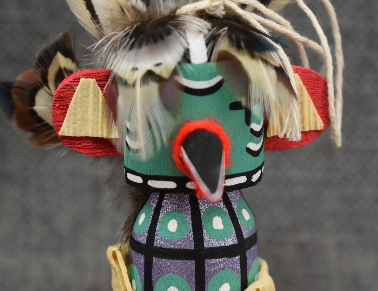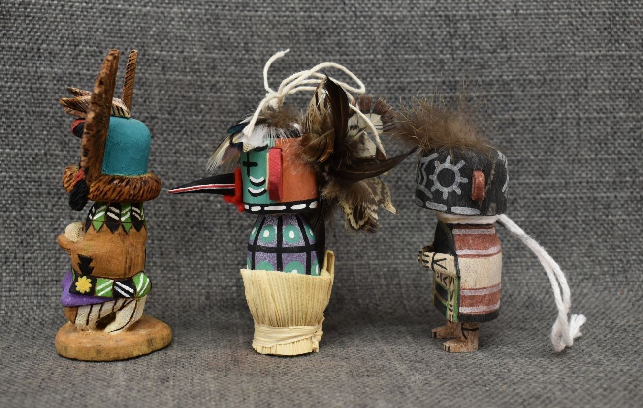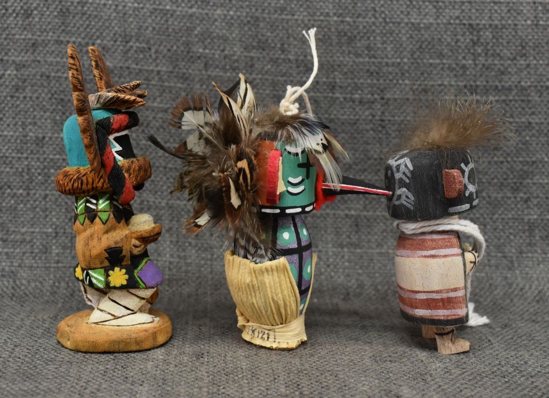 1990-2000's Hopi carved and painted cottonwood crow mother signed Max Curley, corn hummingbird signed Luca Namoki, traditional ogre design signed. Largest 4.25" tall