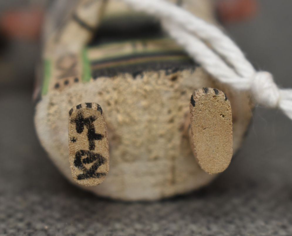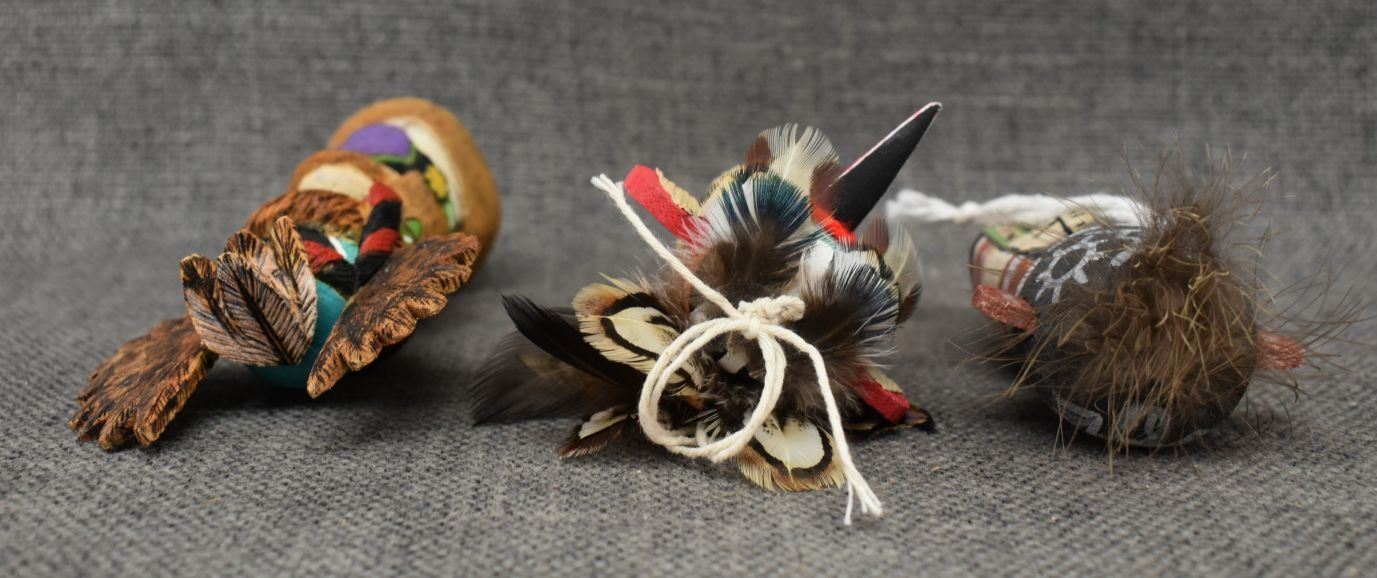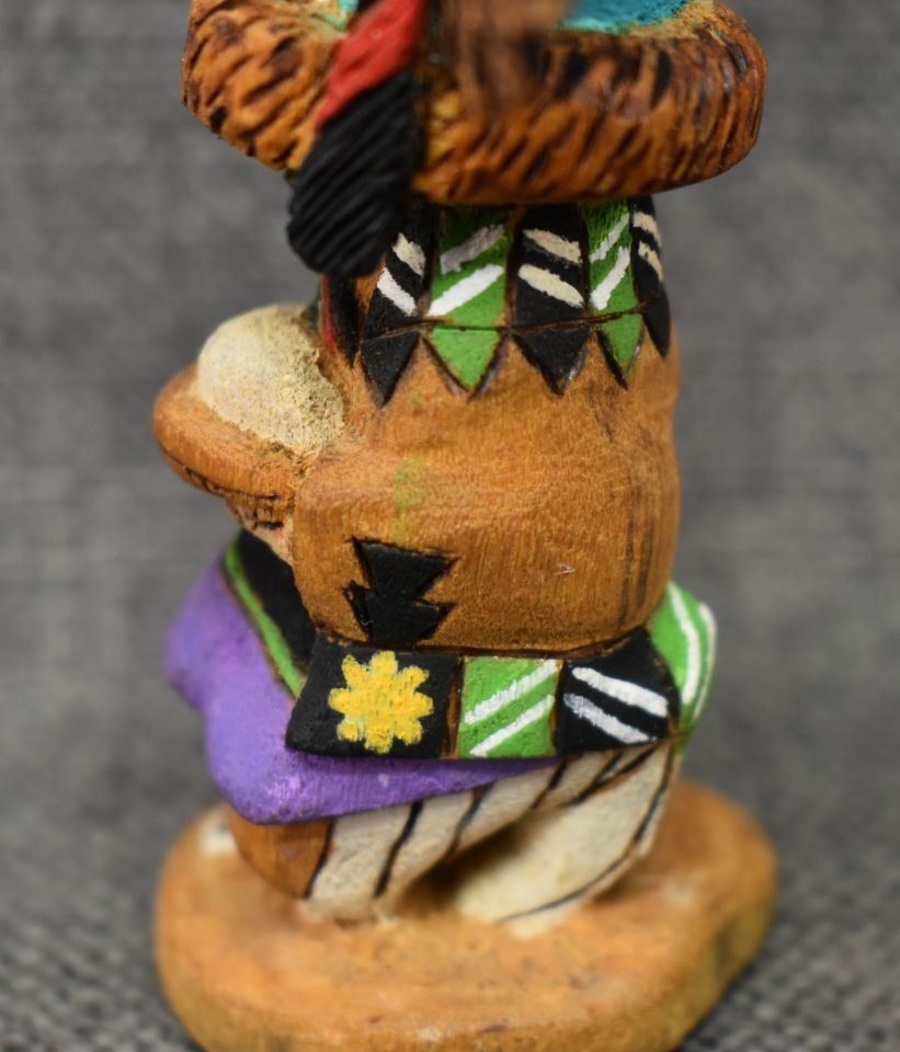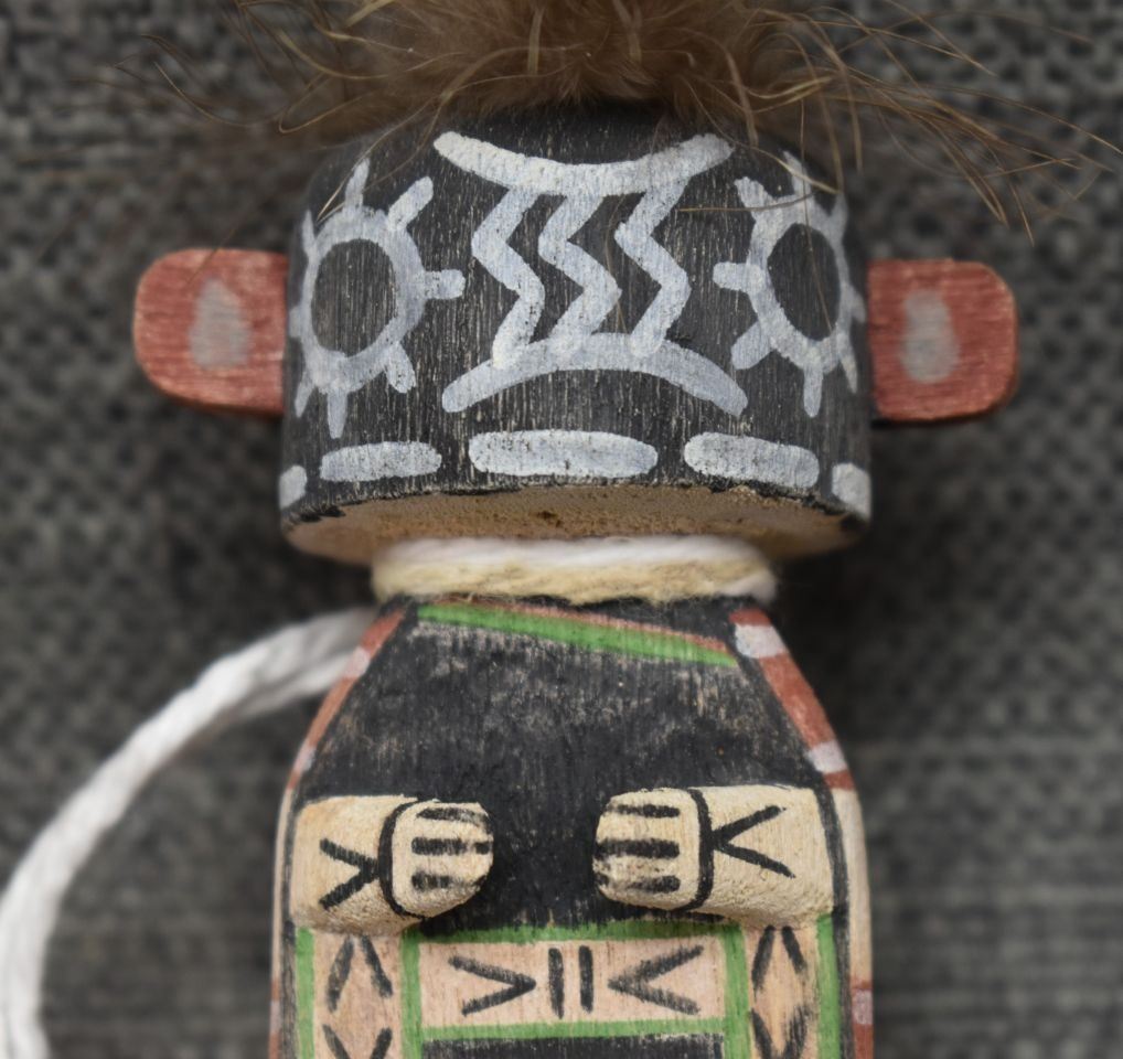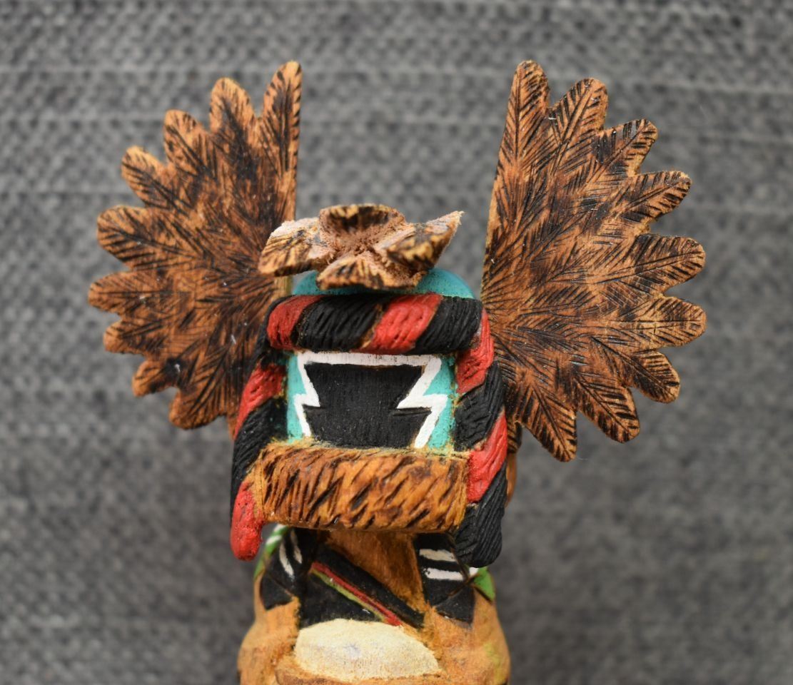 1990-2000's Hopi carved and painted cottonwood crow mother signed Max Curley, corn hummingbird signed Luca Namoki, traditional ogre design signed. Largest 4.25" tall