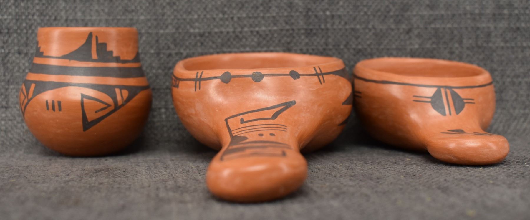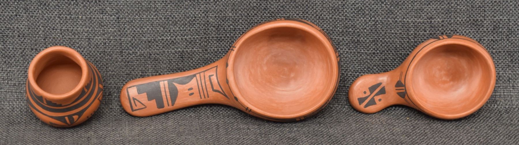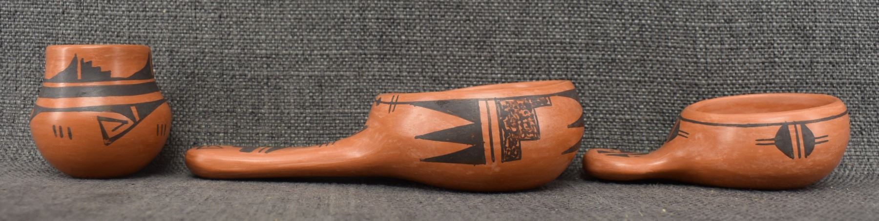 1990's Hopi. Pottery ladles 6'' x 1.5'' x 3'' , 4'' x 1.5'' x 2.5'' vase 2.25'' x 2.25'' all are signed B. Nampeyo