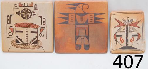 ca. 1960-70’S smallest by Darlene Nampeyo, 2nd by Sadie Adams, 3rd kachina face design by Lorna Lomakema, 3.25” x 2,75, 4” x 4” & 4” x 4”.