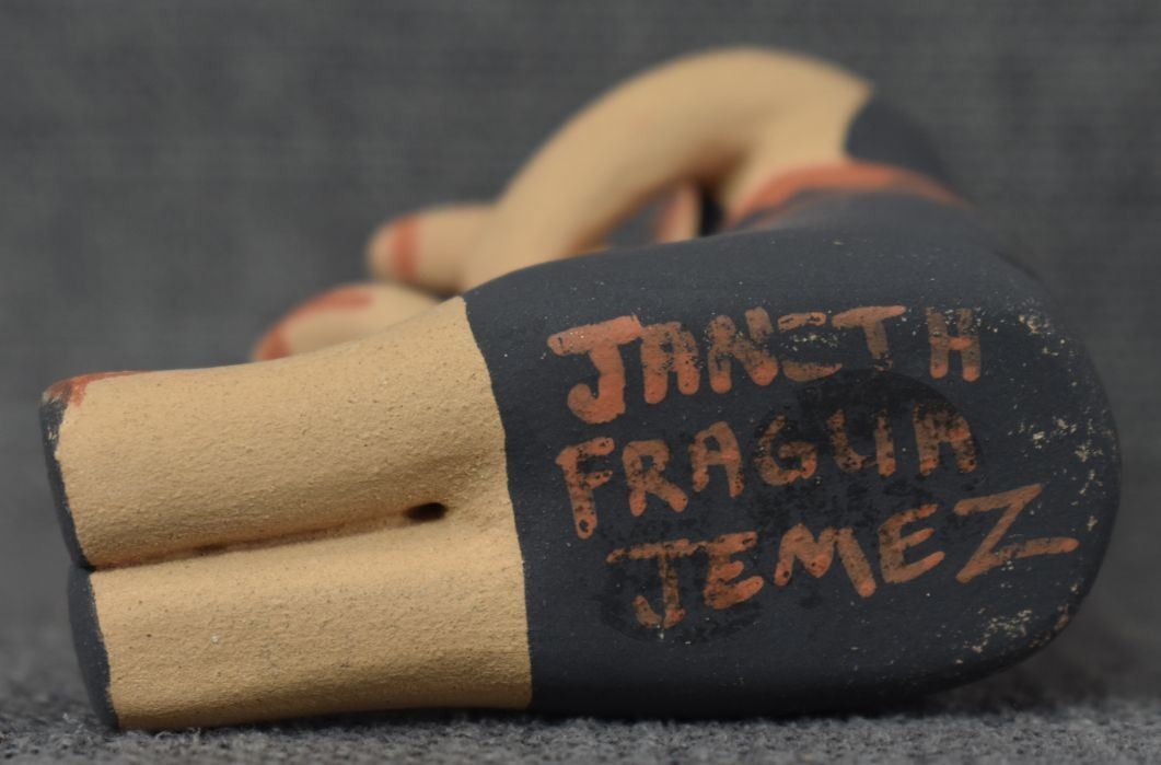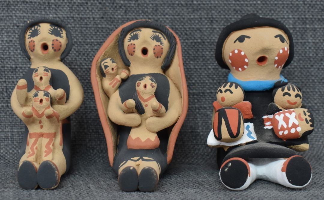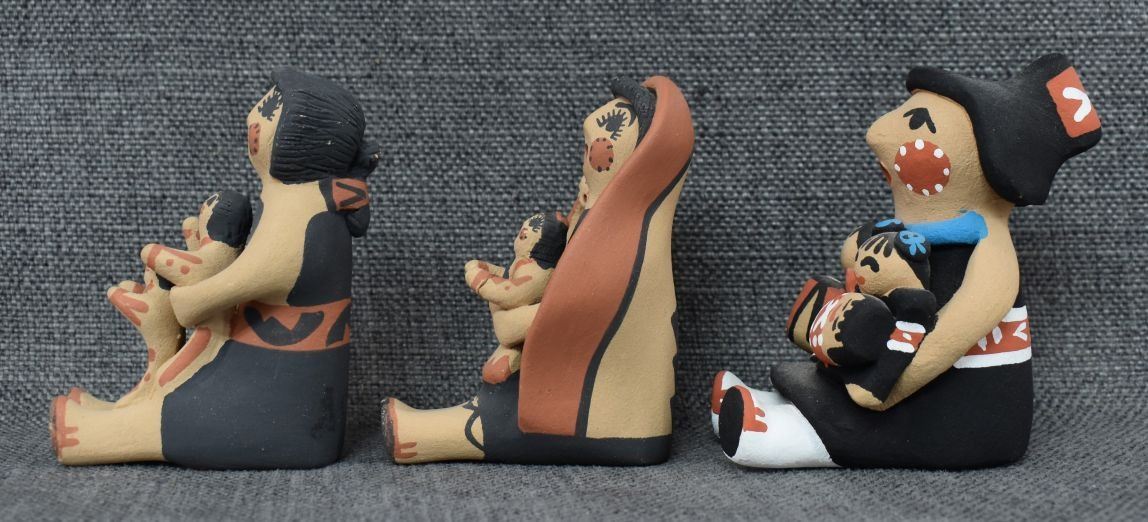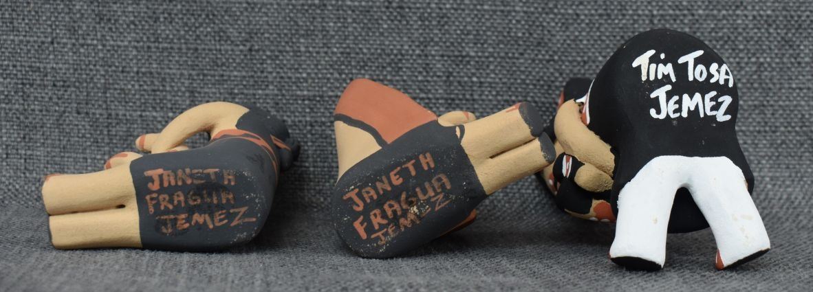 Three Jemez pottery story tellers two by Janeth Fragua, one by Tim Tosa. Largest 3.75" x 2.5" x 3"
