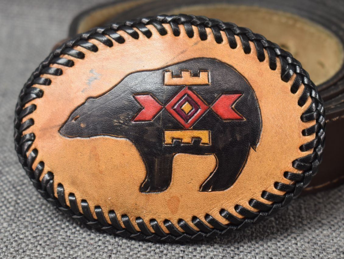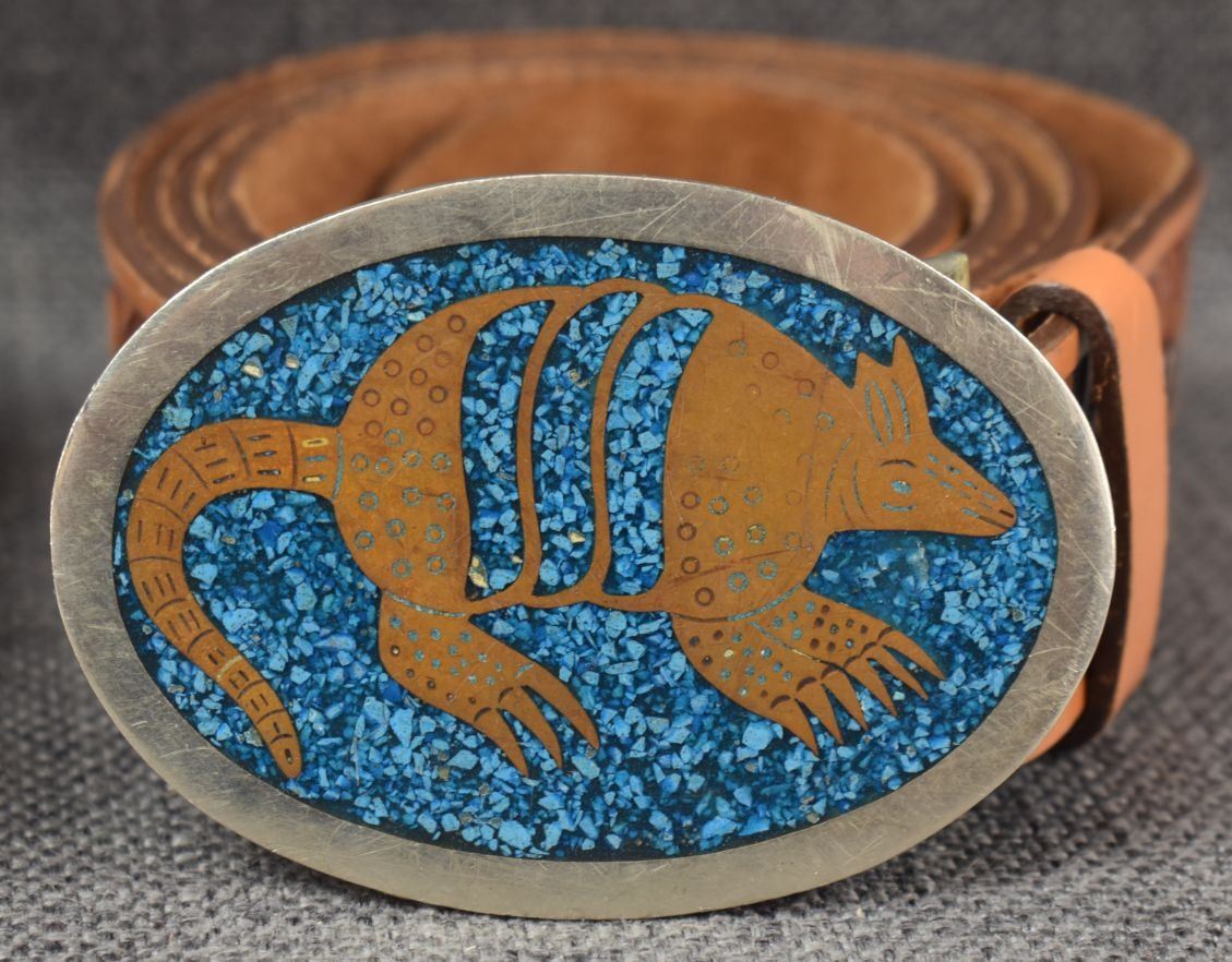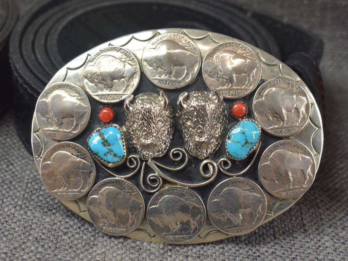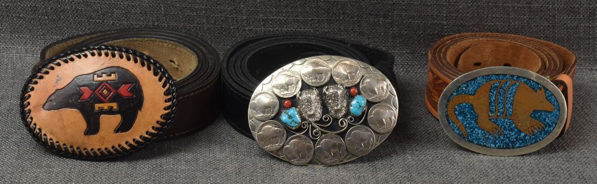 German silver with buffalo nickels turquoise and coral stone 3.25" x 4.25" leather with bear design 3.25" x 4.25" Mexican German silver with crushed turquoise and brass armadillo design 2.5" x 3.5" all leather belts approximately 48" long