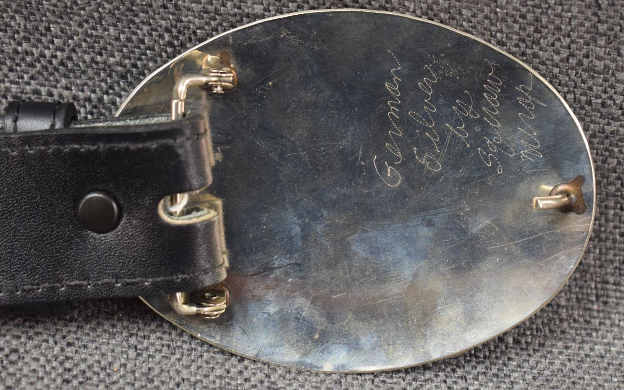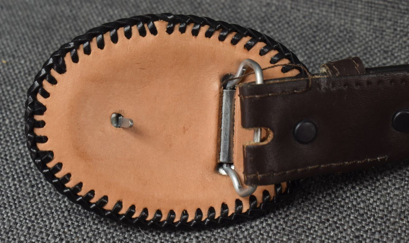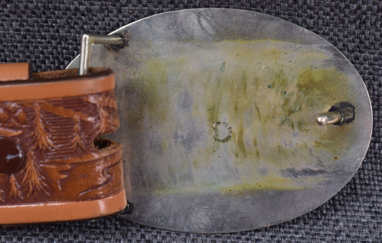 German silver with buffalo nickels turquoise and coral stone 3.25" x 4.25" leather with bear design 3.25" x 4.25" Mexican German silver with crushed turquoise and brass armadillo design 2.5" x 3.5" all leather belts approximately 48" long