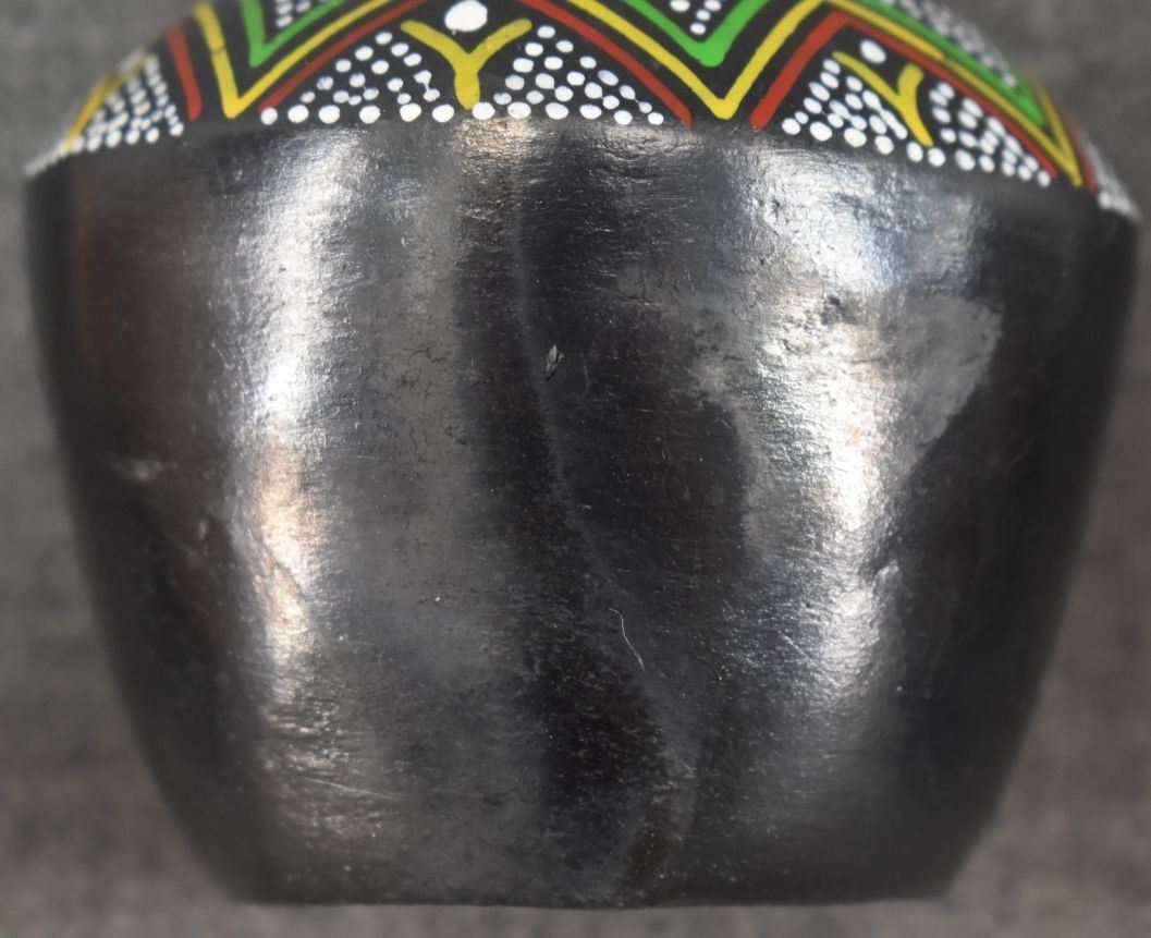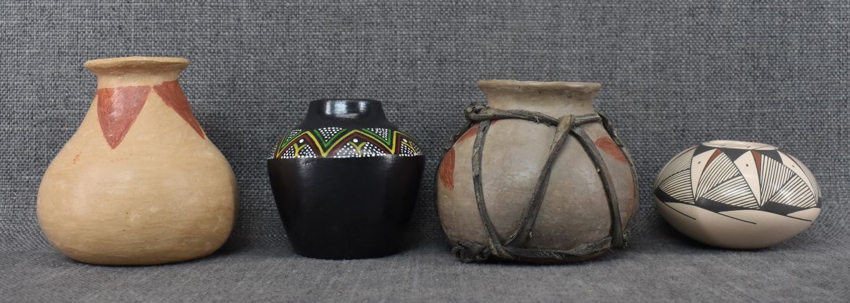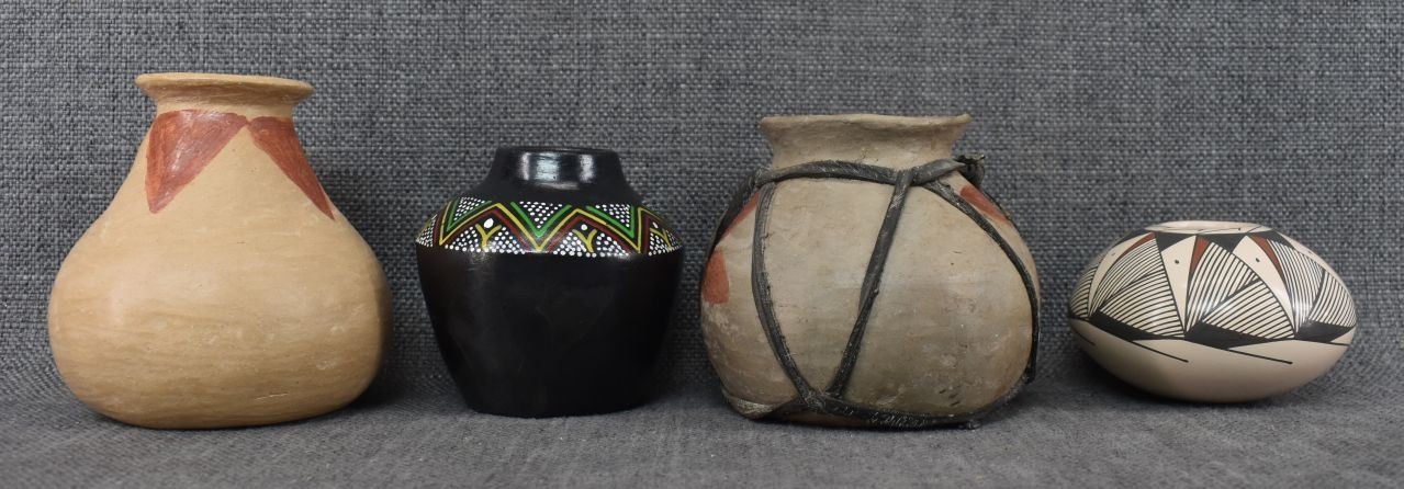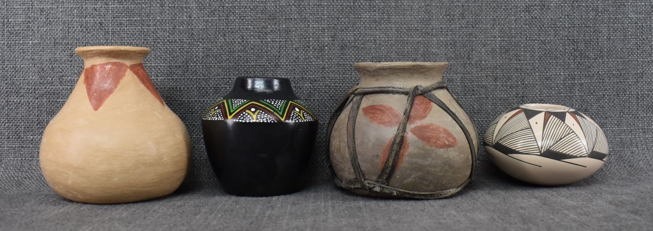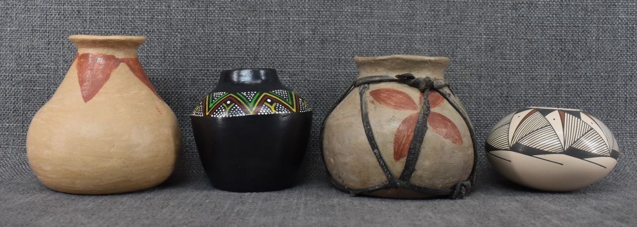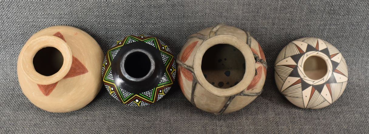 Three Mexican pottery items. Two Tarahumara pottery ollas with painted designed, one Mata Ortiz pottery polychrome bowl Miguel A. One decorative polychrome Olla unsigned largest 4.25" x 4.5"