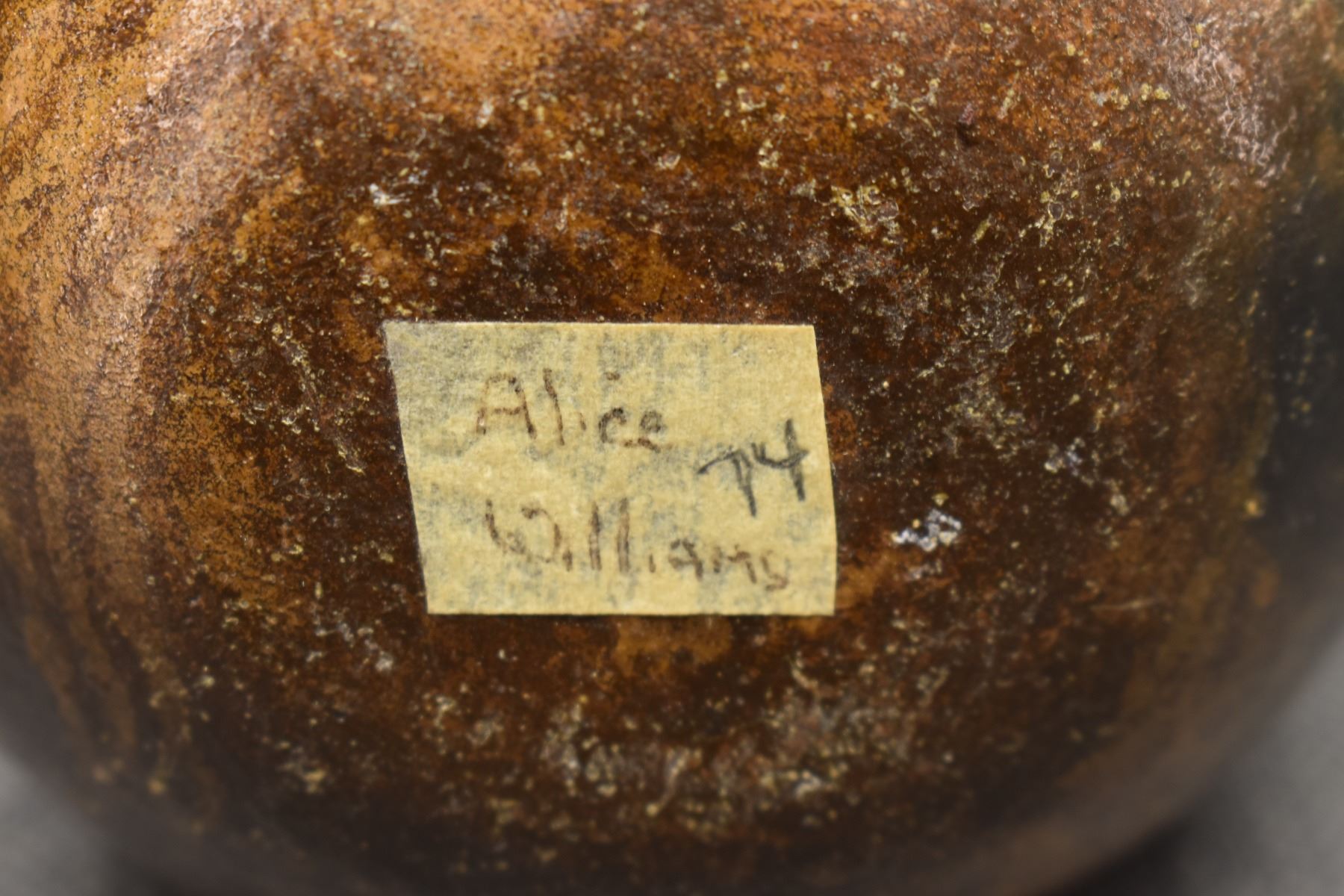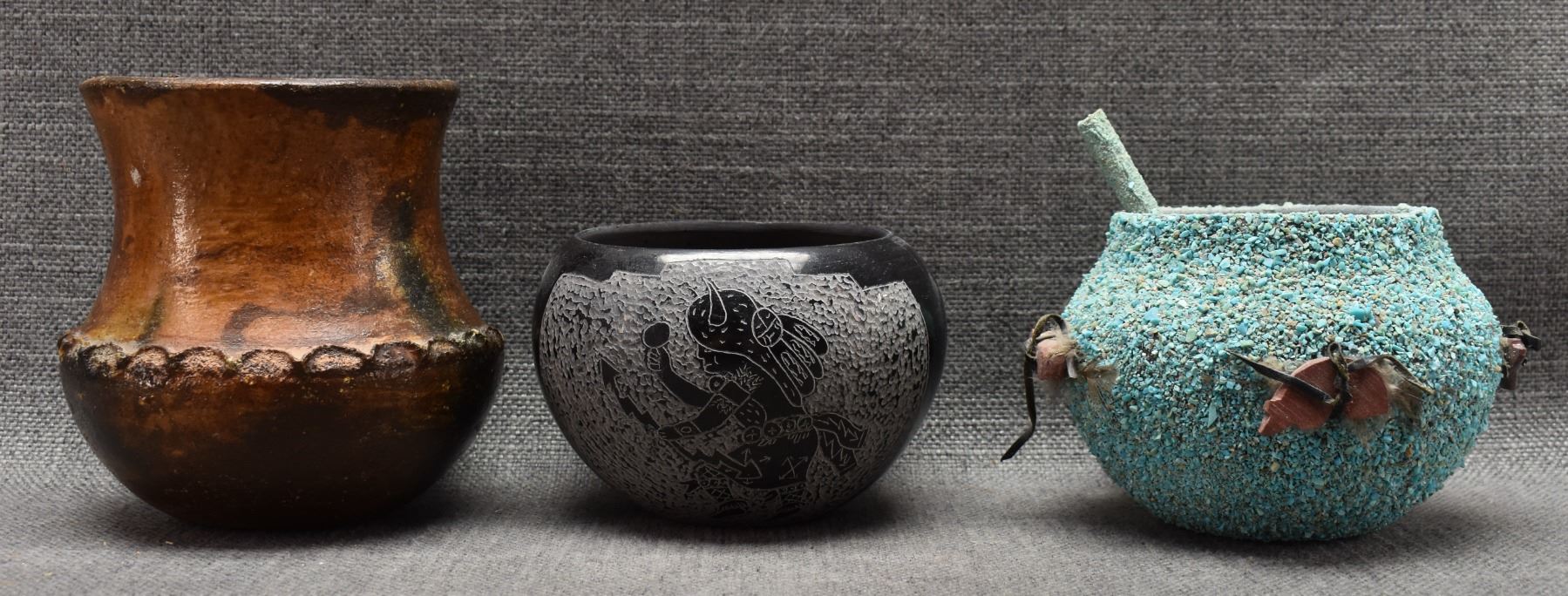 Native American pottery items, Zuni 90's hand coiled Fetish pot, Navajo 1970's pottery jar attributed to Alice Williams, Santa Clara 200's-10's sgraffito bowl signed Dan Tafoya. Largest 4.75"x 4.75"
