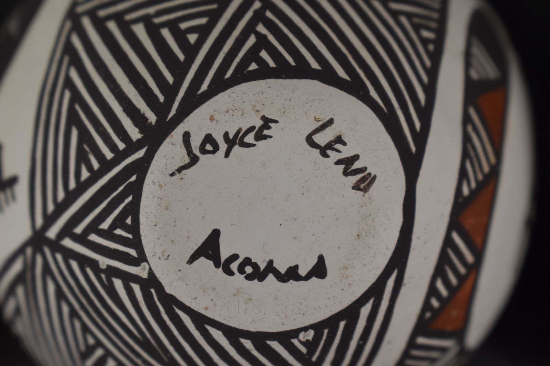 Three Native American pottery items. One Santa Clara jar signed Christine Nieto, one Acoma seed jar signed Joyce Lemu, One Hopi olla signed H. Jim with kiva hallmark