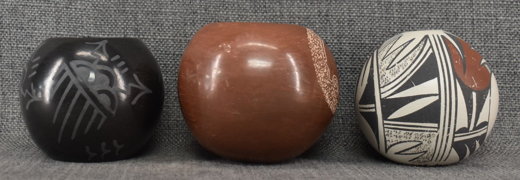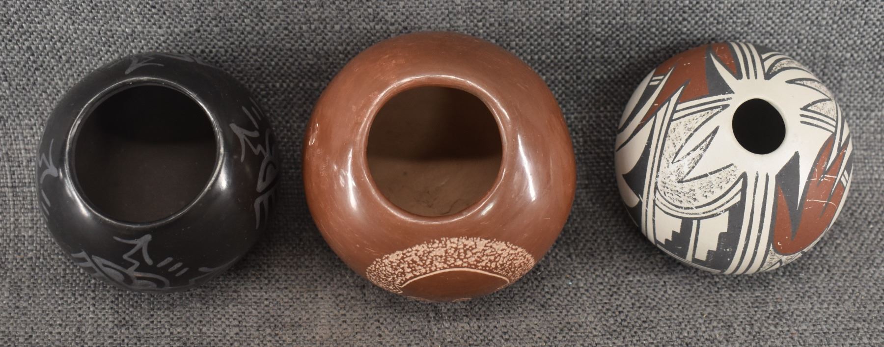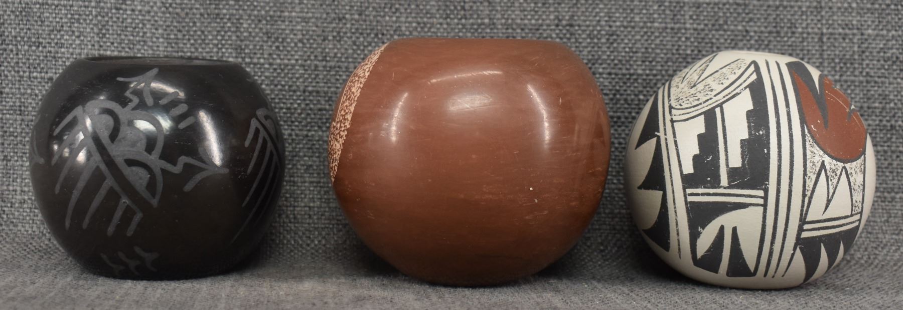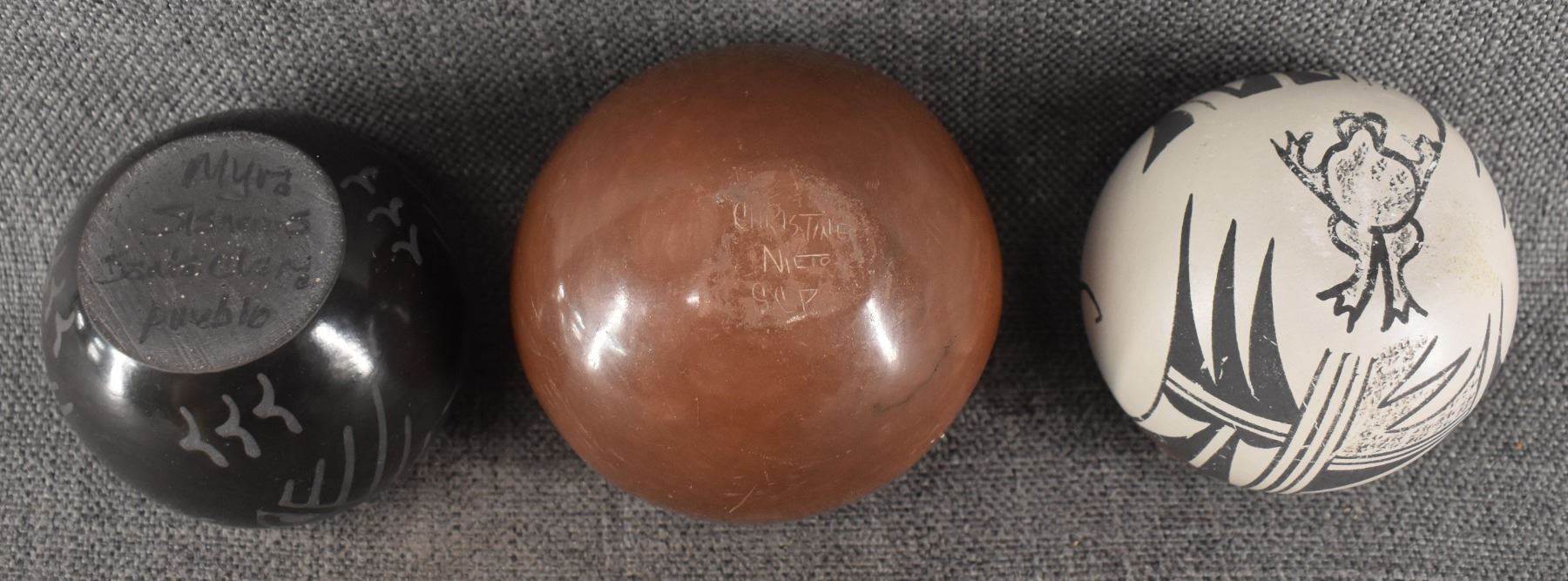 three hand coiled Native American pottery jars. One Hopi polychrome pottery seed jar signed with frog hallmark for Joy Navasie, one Santa Clara sgraffito pottery jar signed Christine Nieto, one Matt on black Santa Clara signed Myra Sisneros.largest3" x 4"