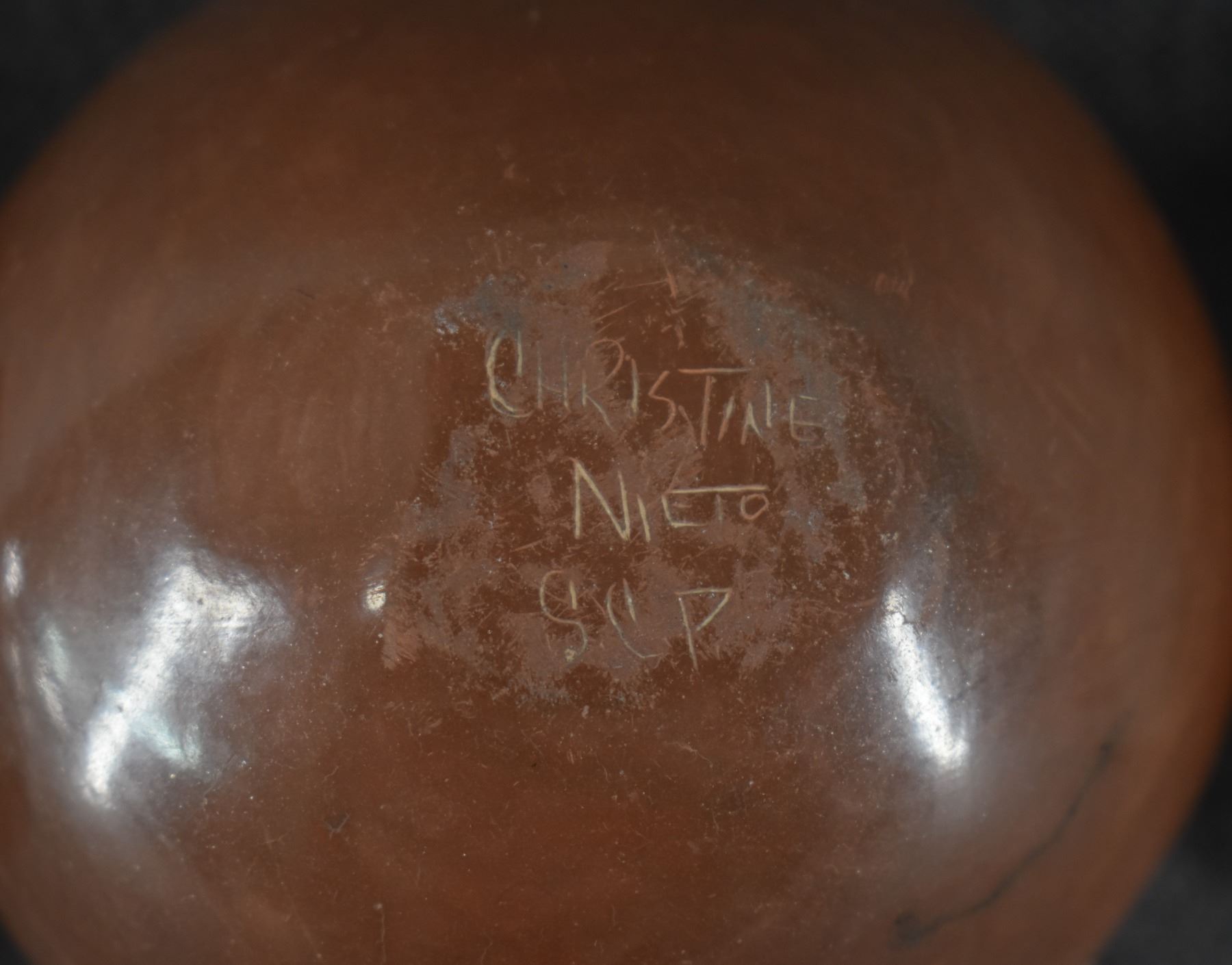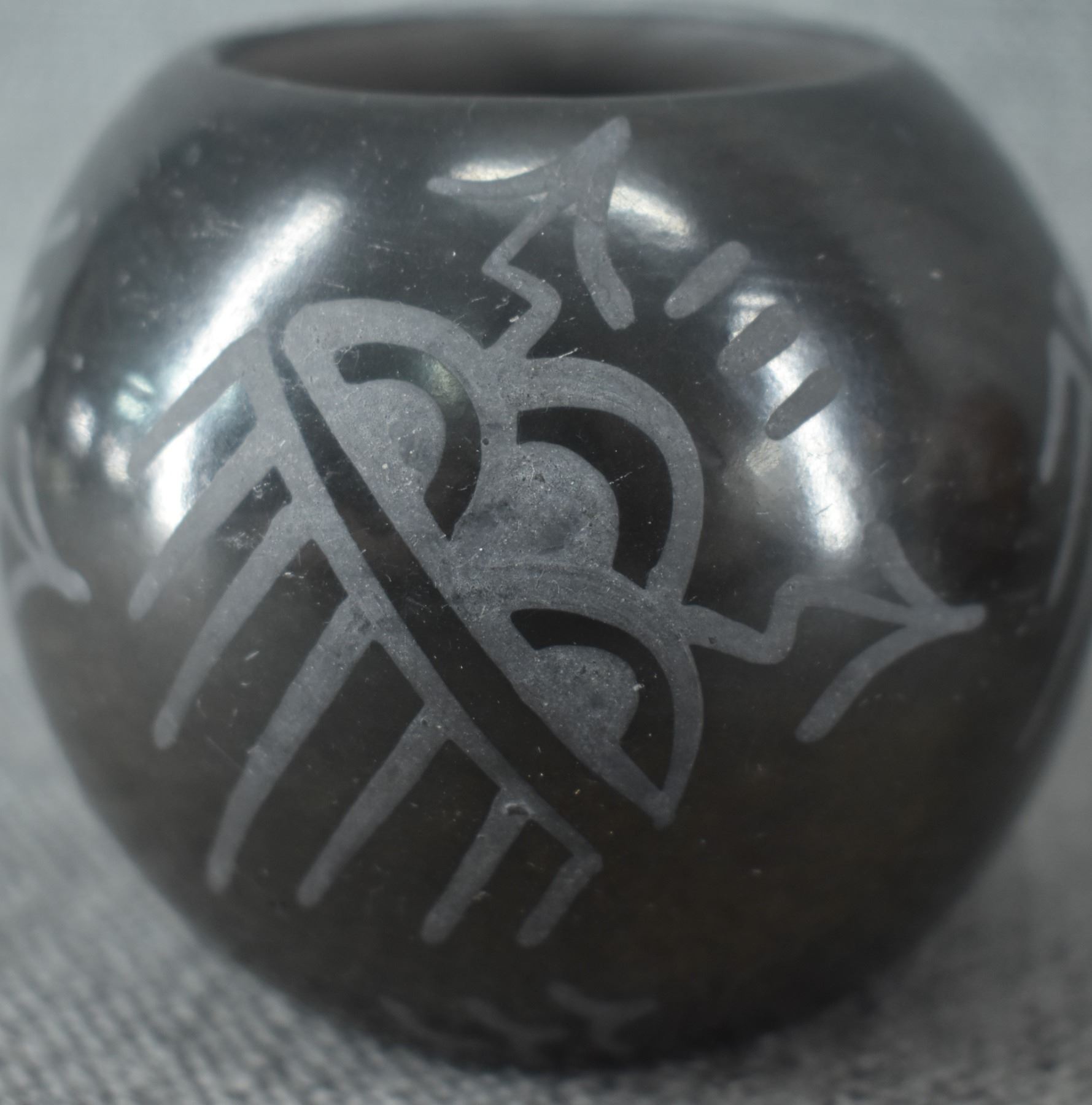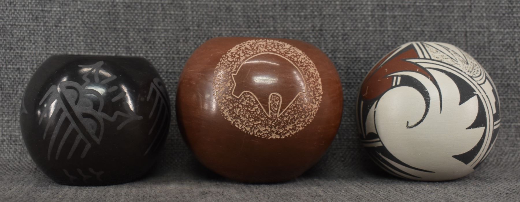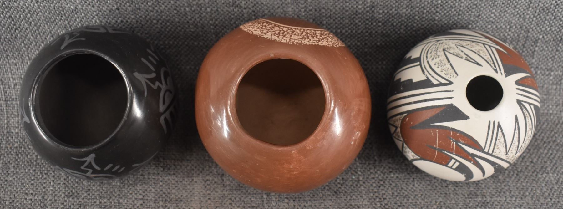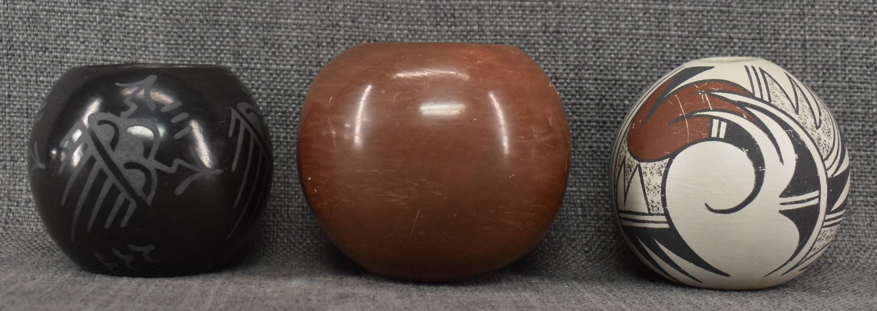 three hand coiled Native American pottery jars. One Hopi polychrome pottery seed jar signed with frog hallmark for Joy Navasie, one Santa Clara sgraffito pottery jar signed Christine Nieto, one Matt on black Santa Clara signed Myra Sisneros.largest3" x 4"