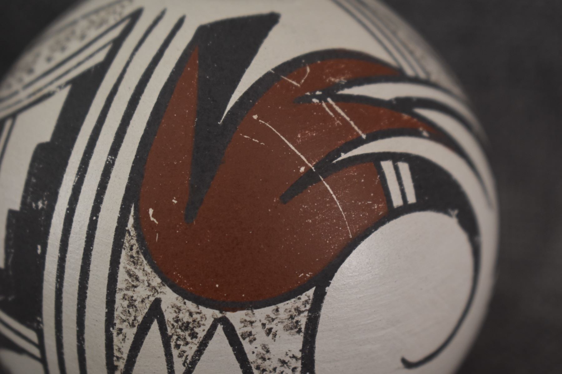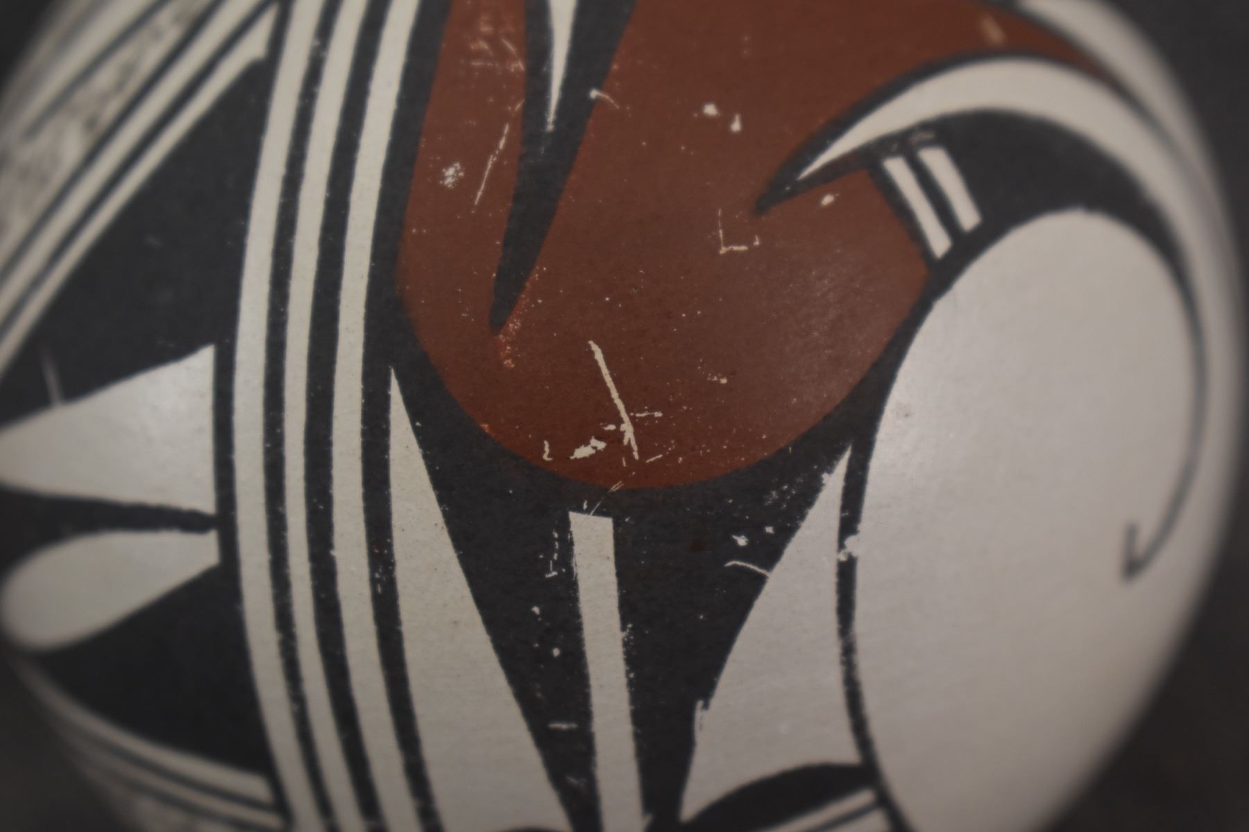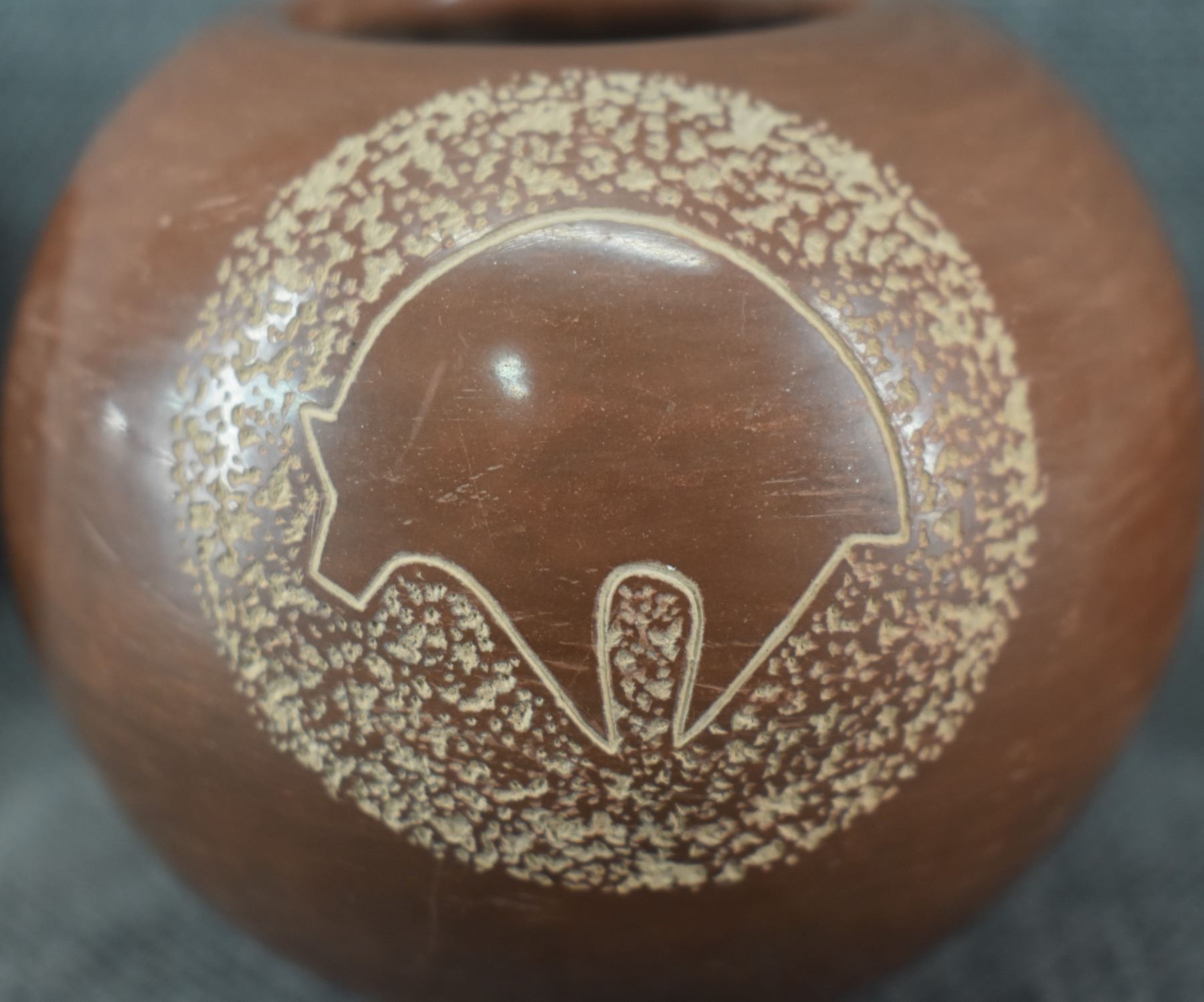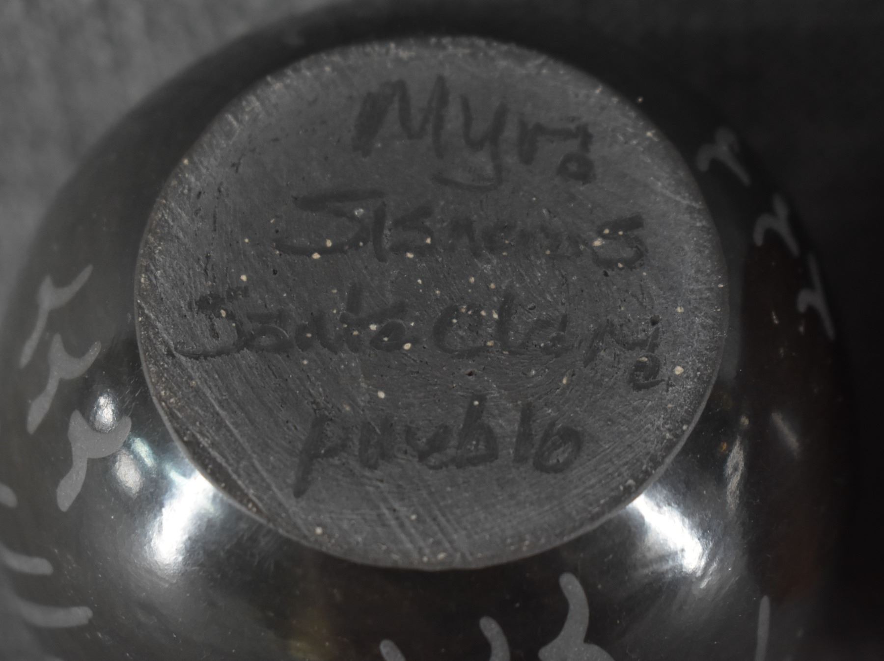 three hand coiled Native American pottery jars. One Hopi polychrome pottery seed jar signed with frog hallmark for Joy Navasie, one Santa Clara sgraffito pottery jar signed Christine Nieto, one Matt on black Santa Clara signed Myra Sisneros.largest3" x 4"