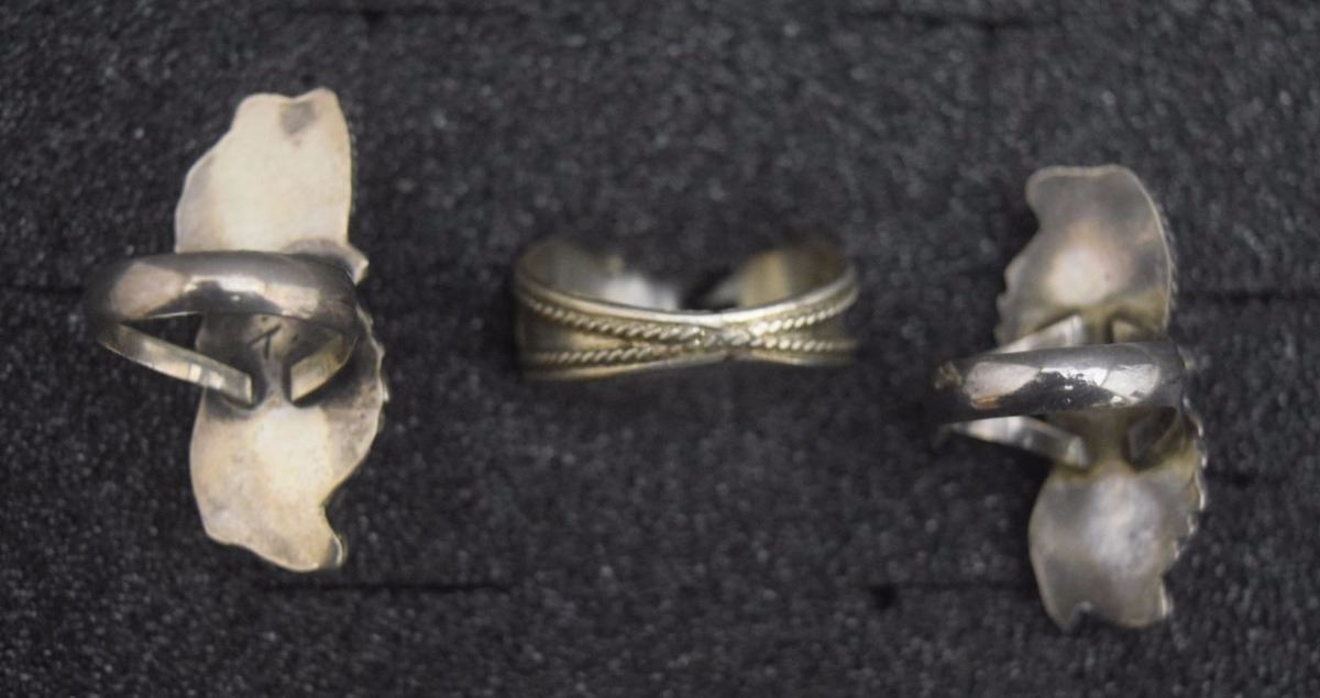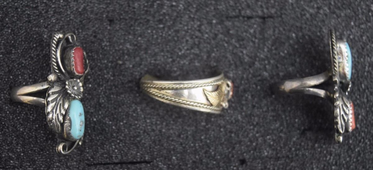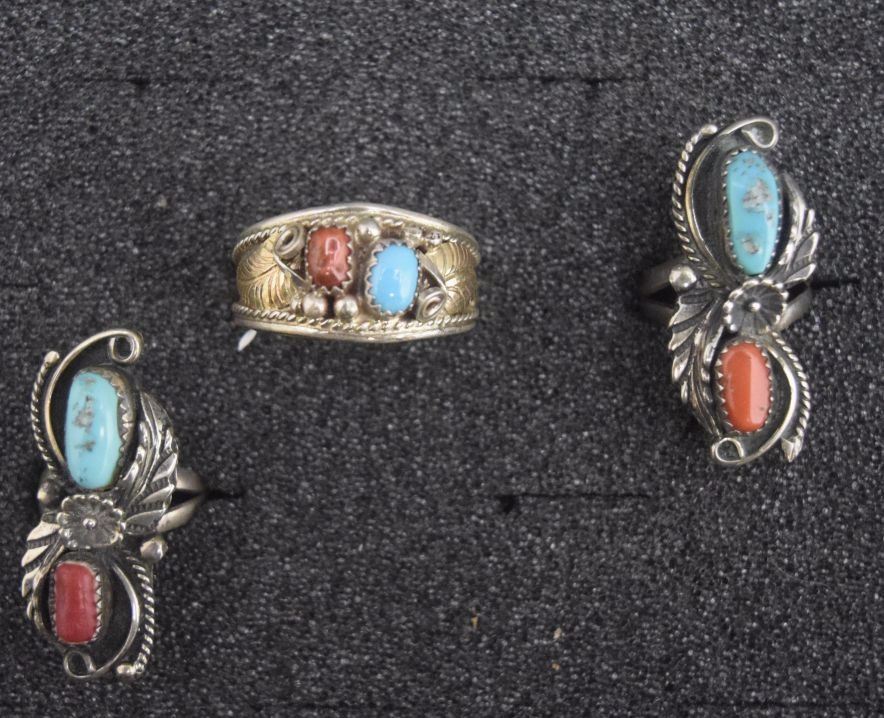 1970's sterling silver turquoise and coral 2 are size 5 other size 13. 19 grams total weight
