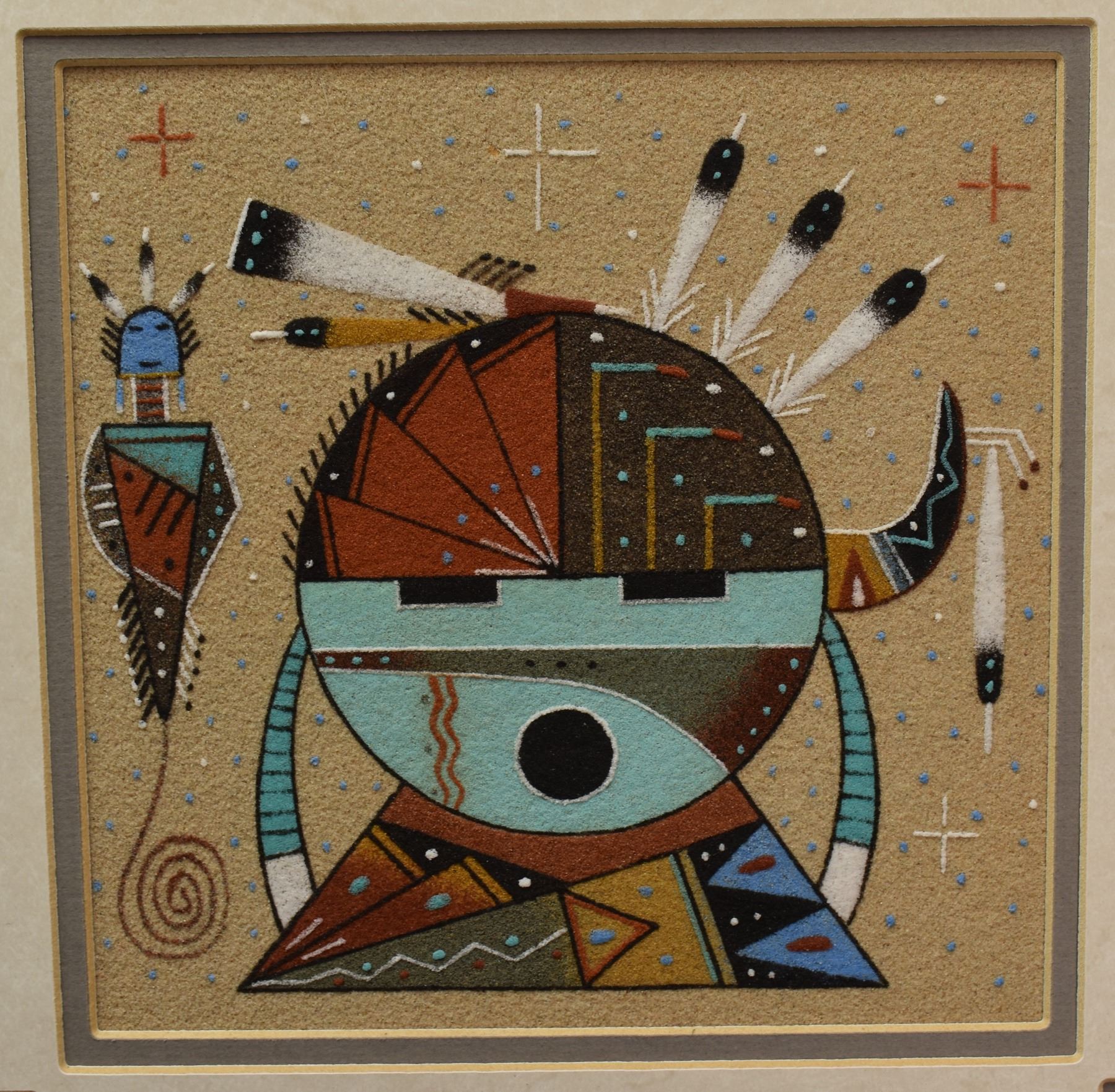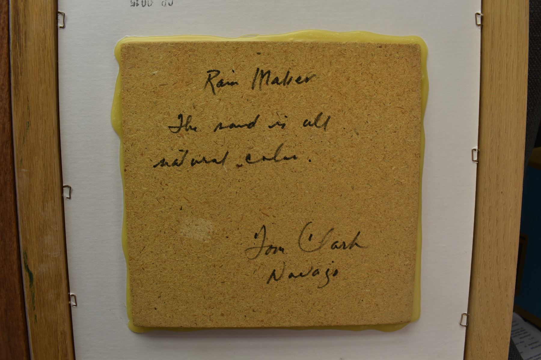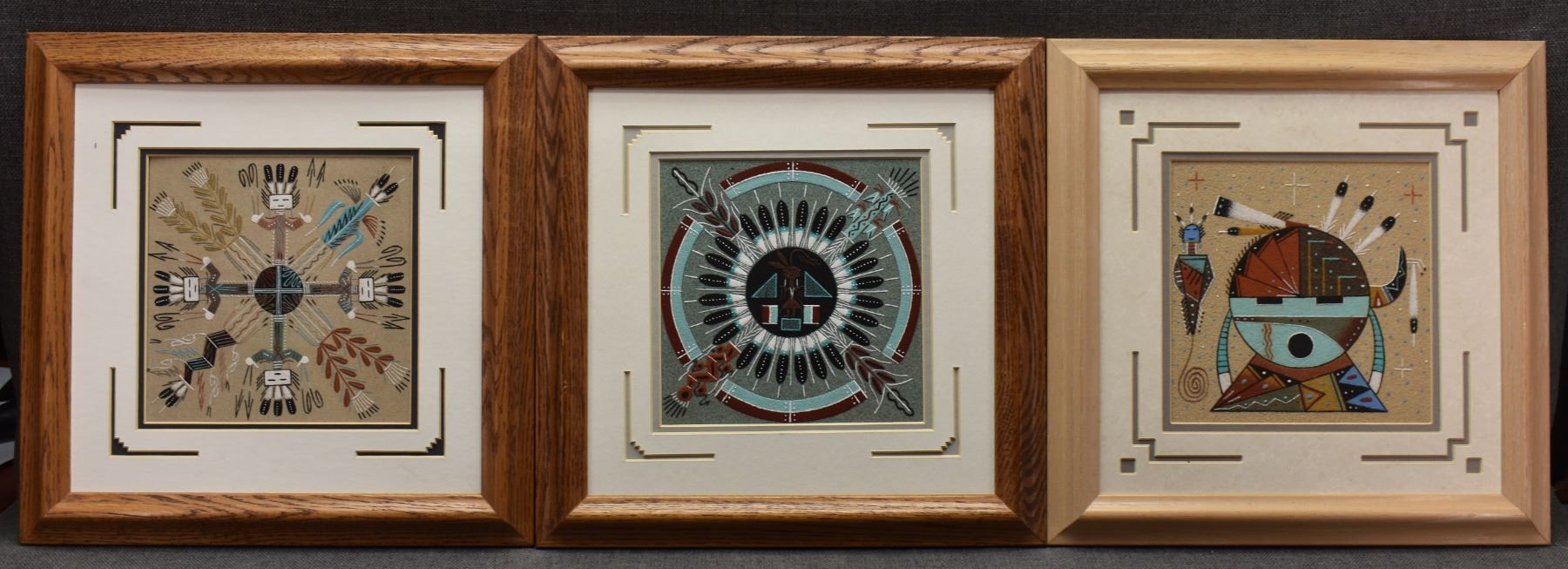 three Navajo sand paintings all signed, 7.5" x 7.5" framed too 14.5" x 14.5"