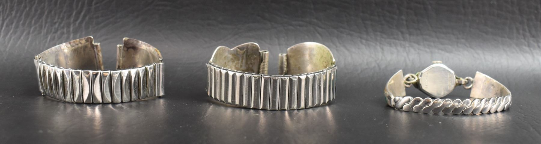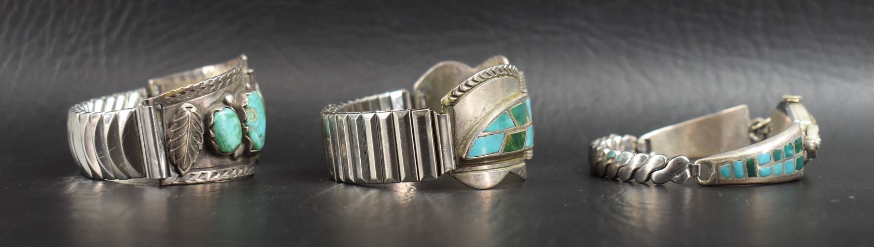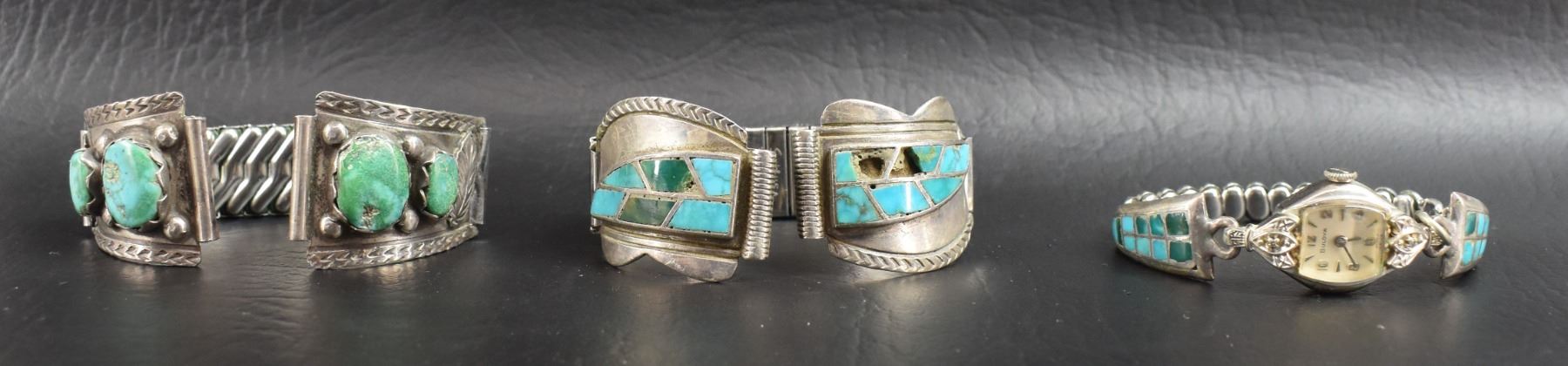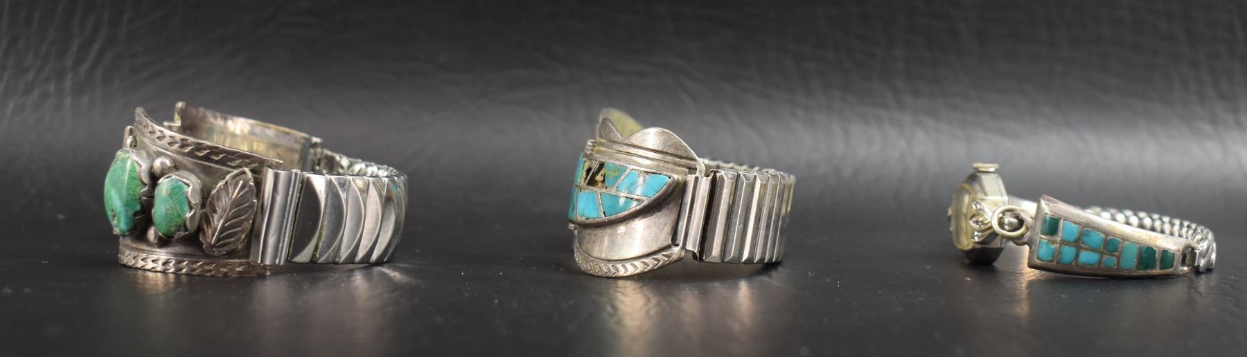 1970's Navajo, sterling silver with turquoise largest 1" x 1.25" all have stretch bands total weight 80 grams