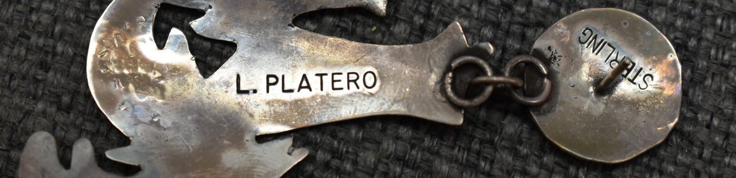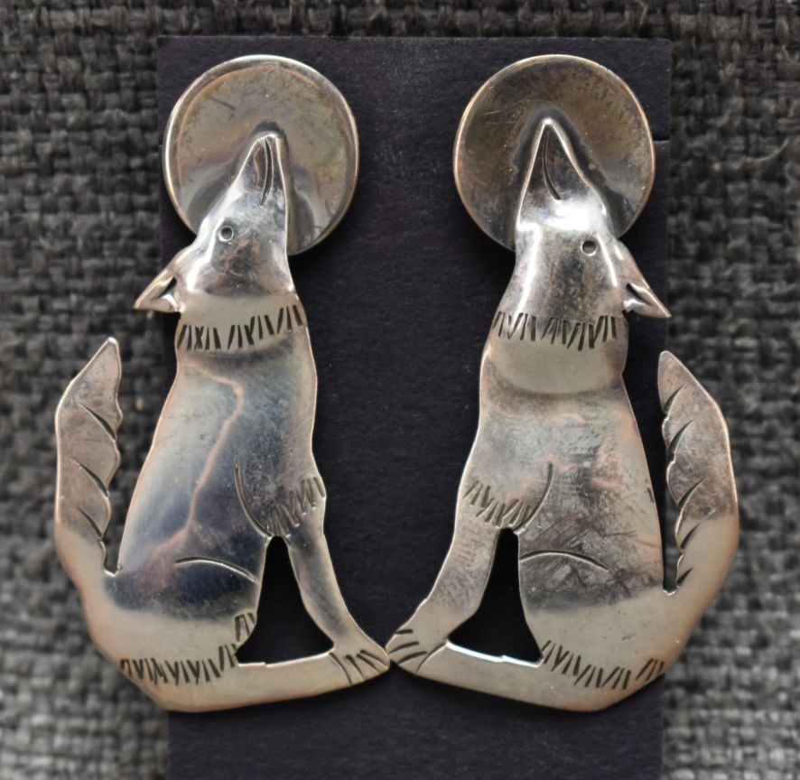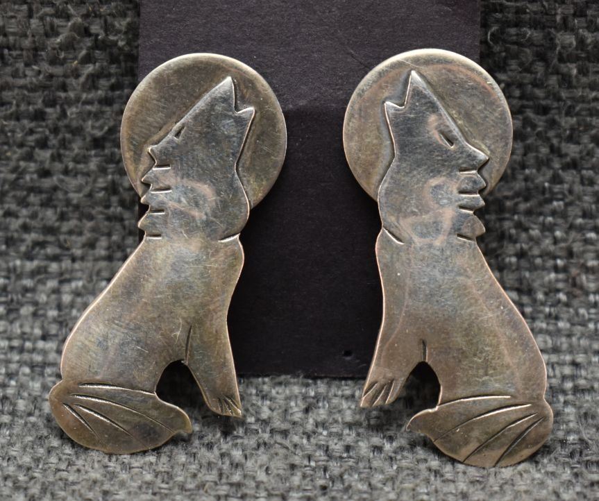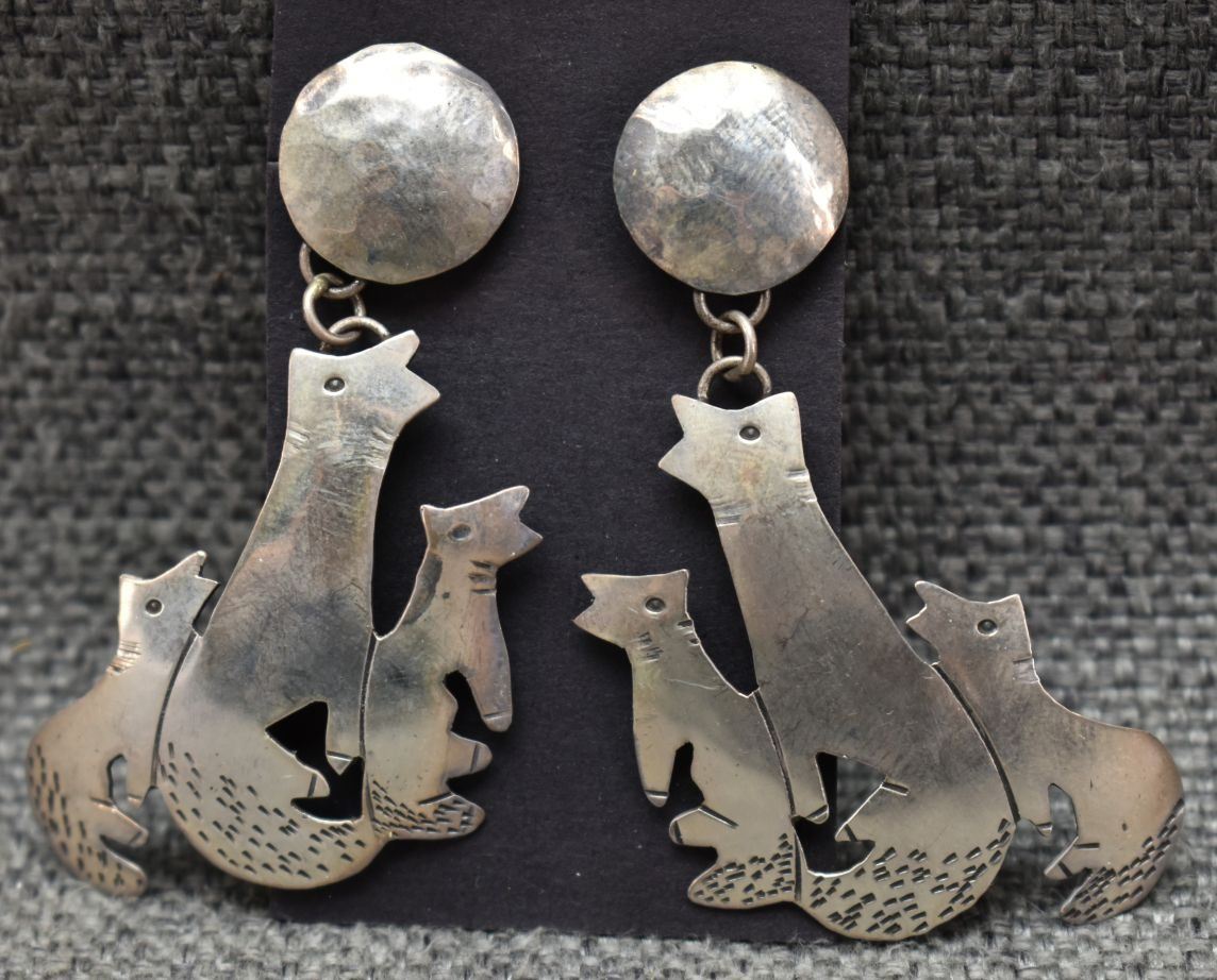 1980's Navajo. three pair sterling silver coyote earrings. Largest pair 2.5'' x 1.5'' signed Platero. 1 unsigned 1Guerro. Total weight 25 grams