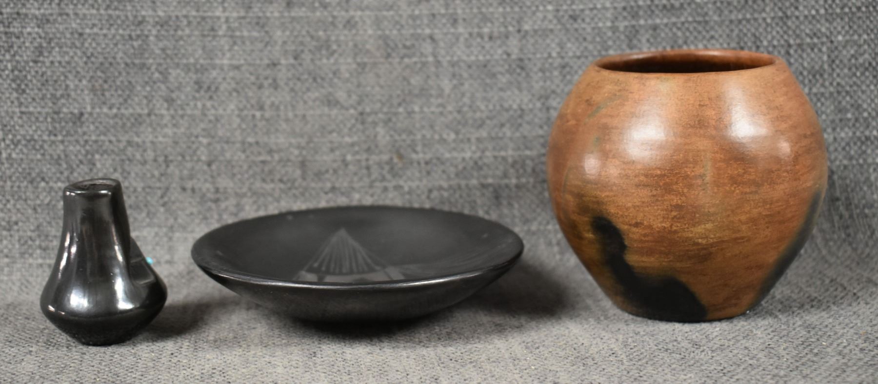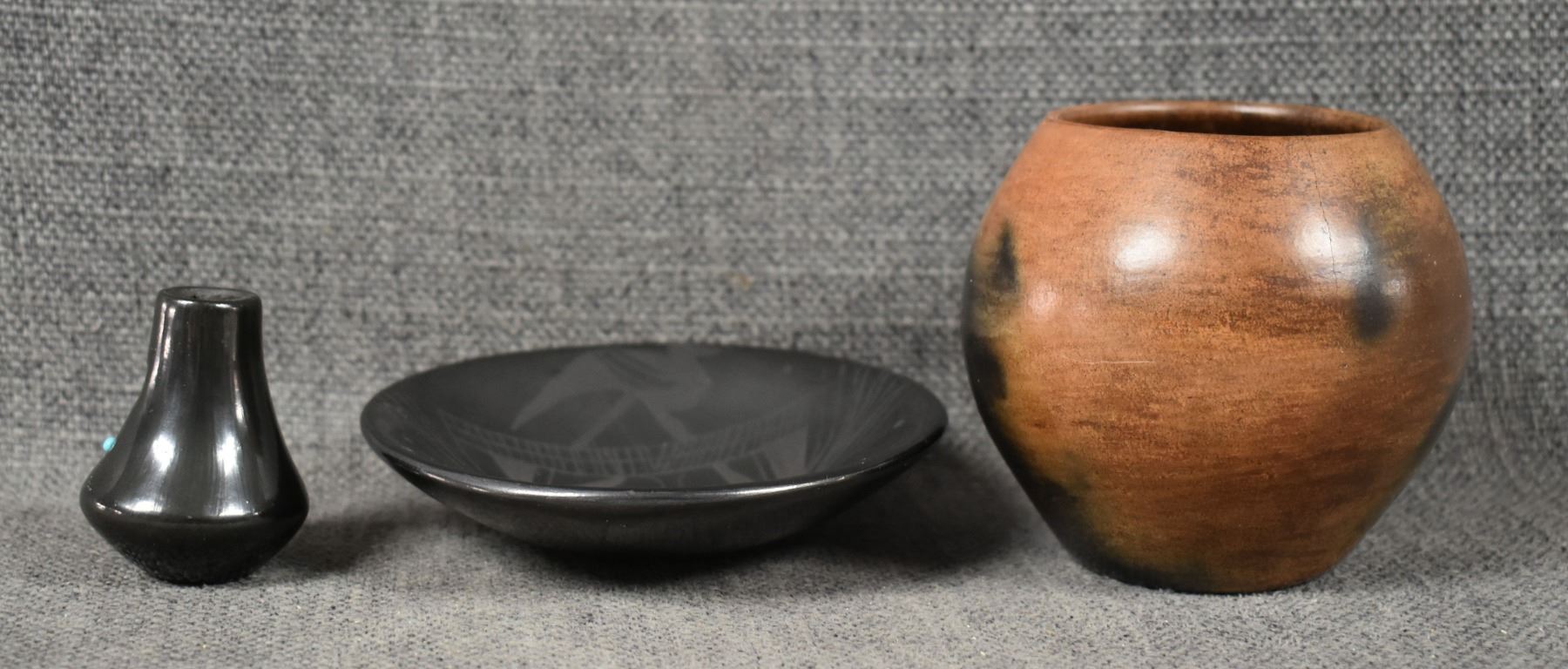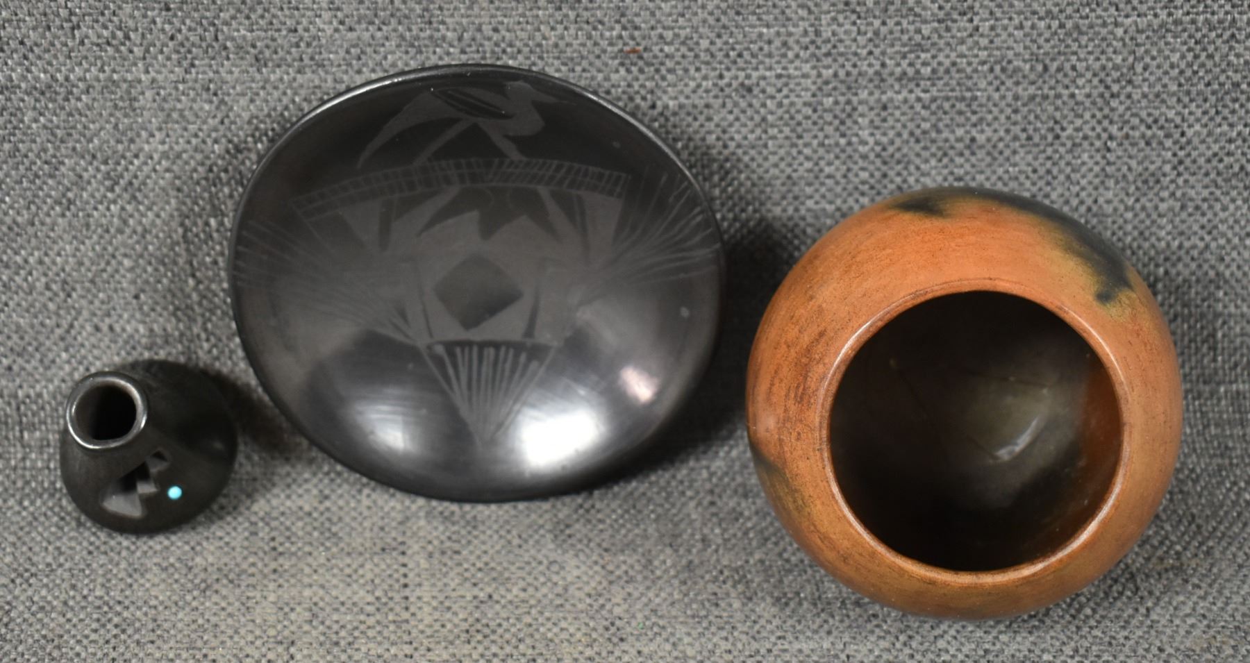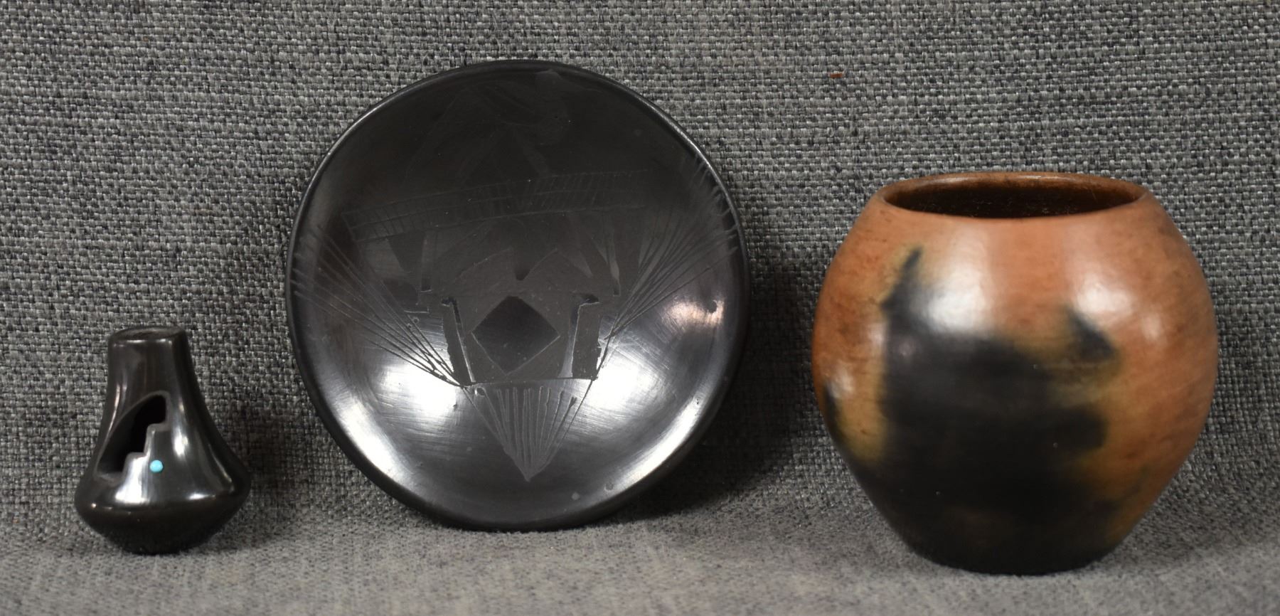 1990's Navajo, hand coiled plain ware signed 3" x 3". 1990's Mata Ortiz plate with painted design 1" x 4". 1990's Santa Clara vase, with cutout design signed Julie Gutierrez, 1.75" x 1.25"