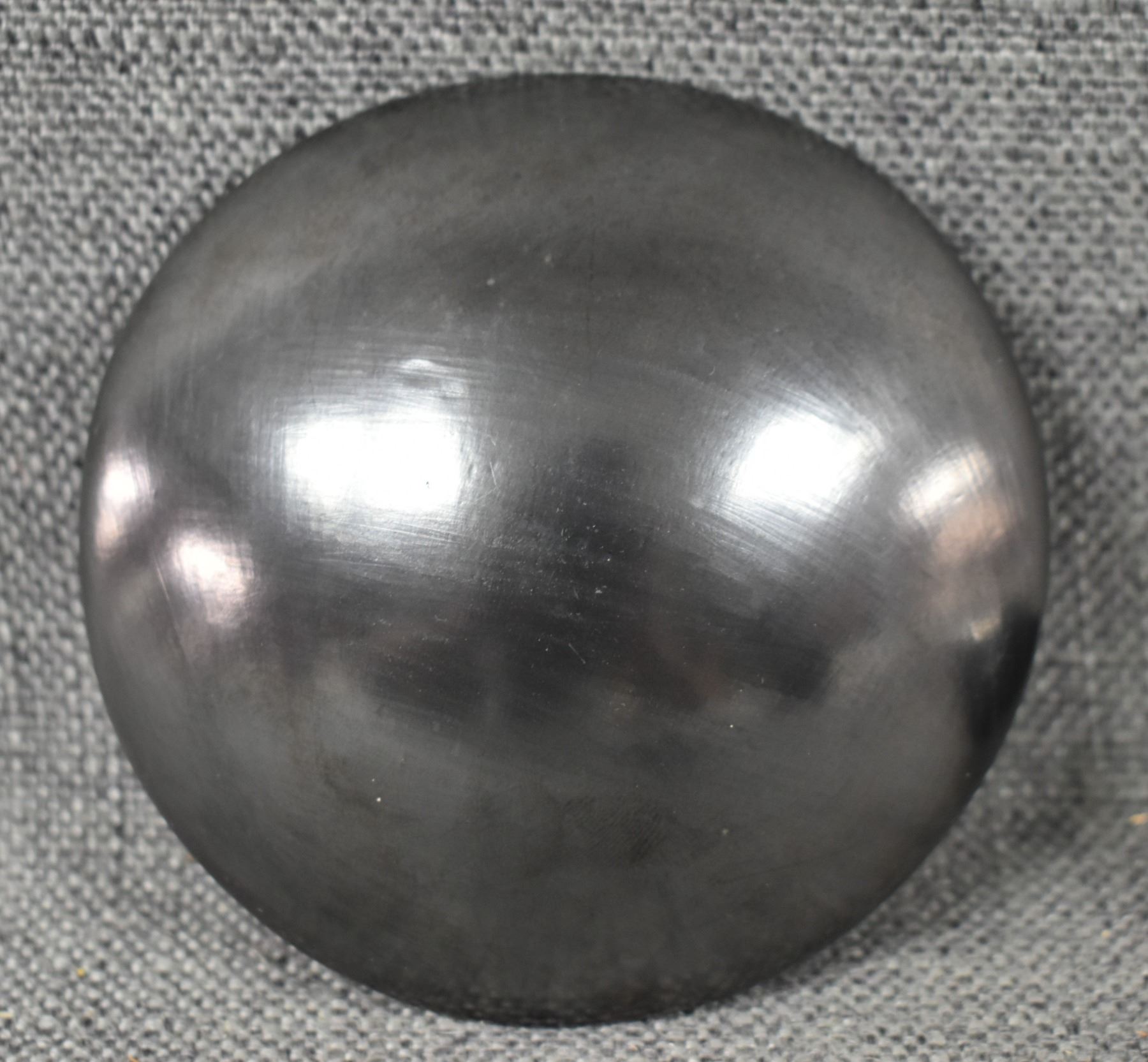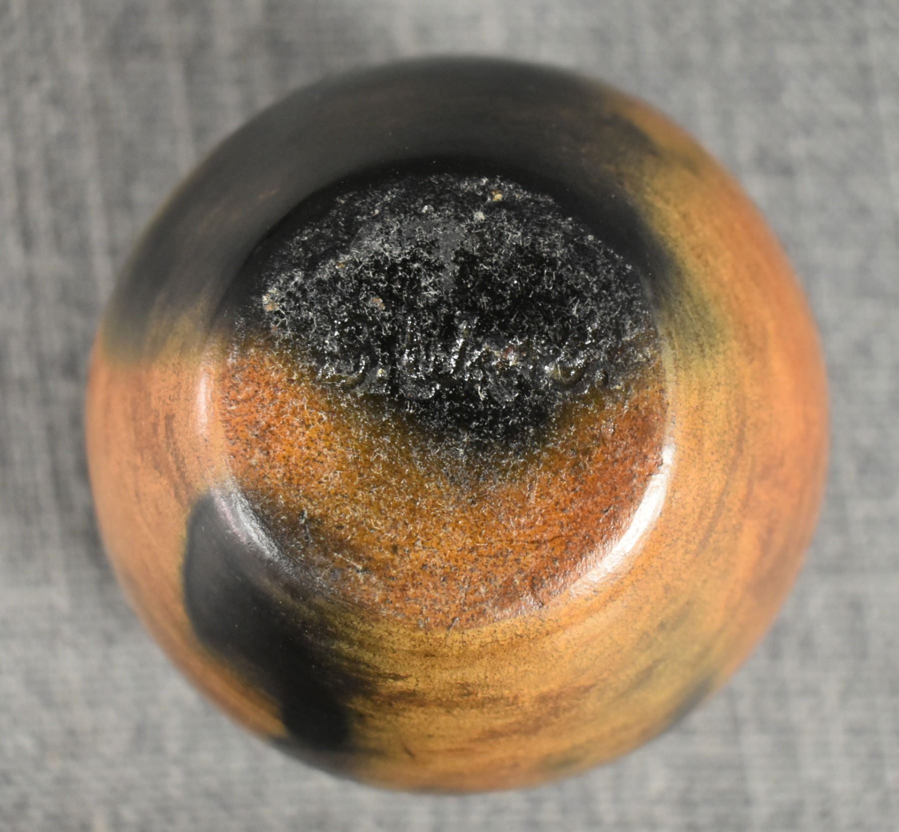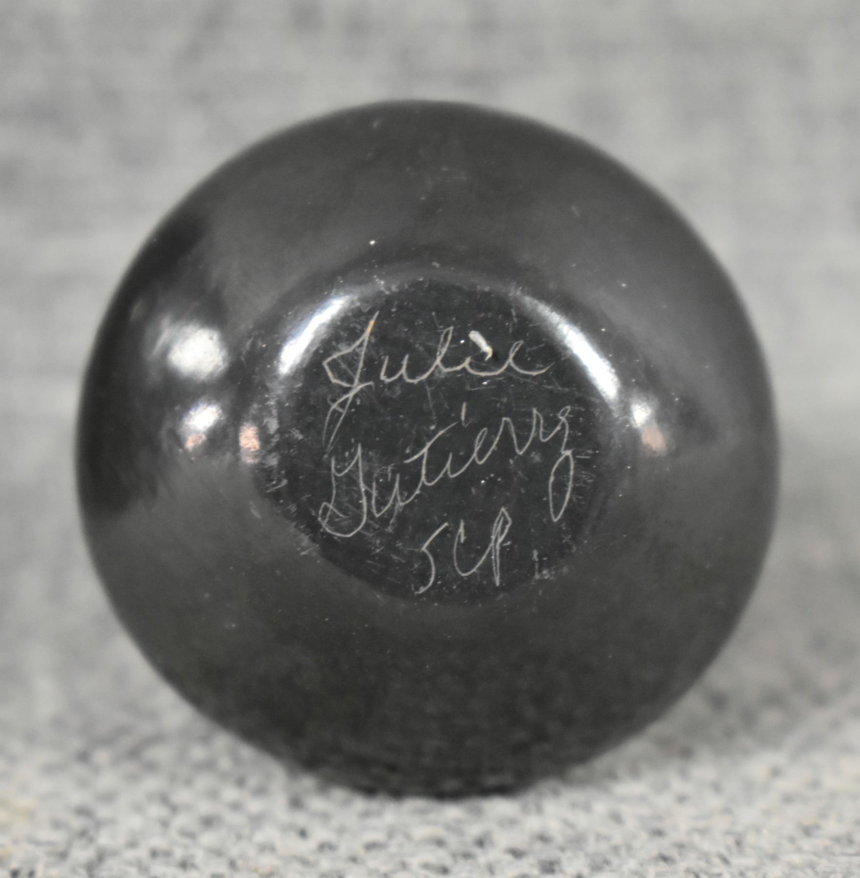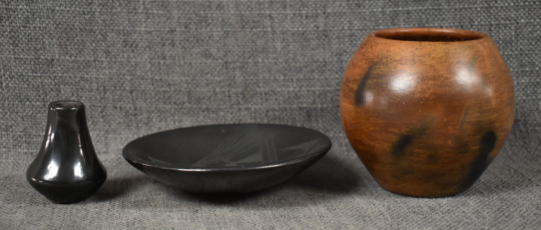 1990's Navajo, hand coiled plain ware signed 3" x 3". 1990's Mata Ortiz plate with painted design 1" x 4". 1990's Santa Clara vase, with cutout design signed Julie Gutierrez, 1.75" x 1.25"