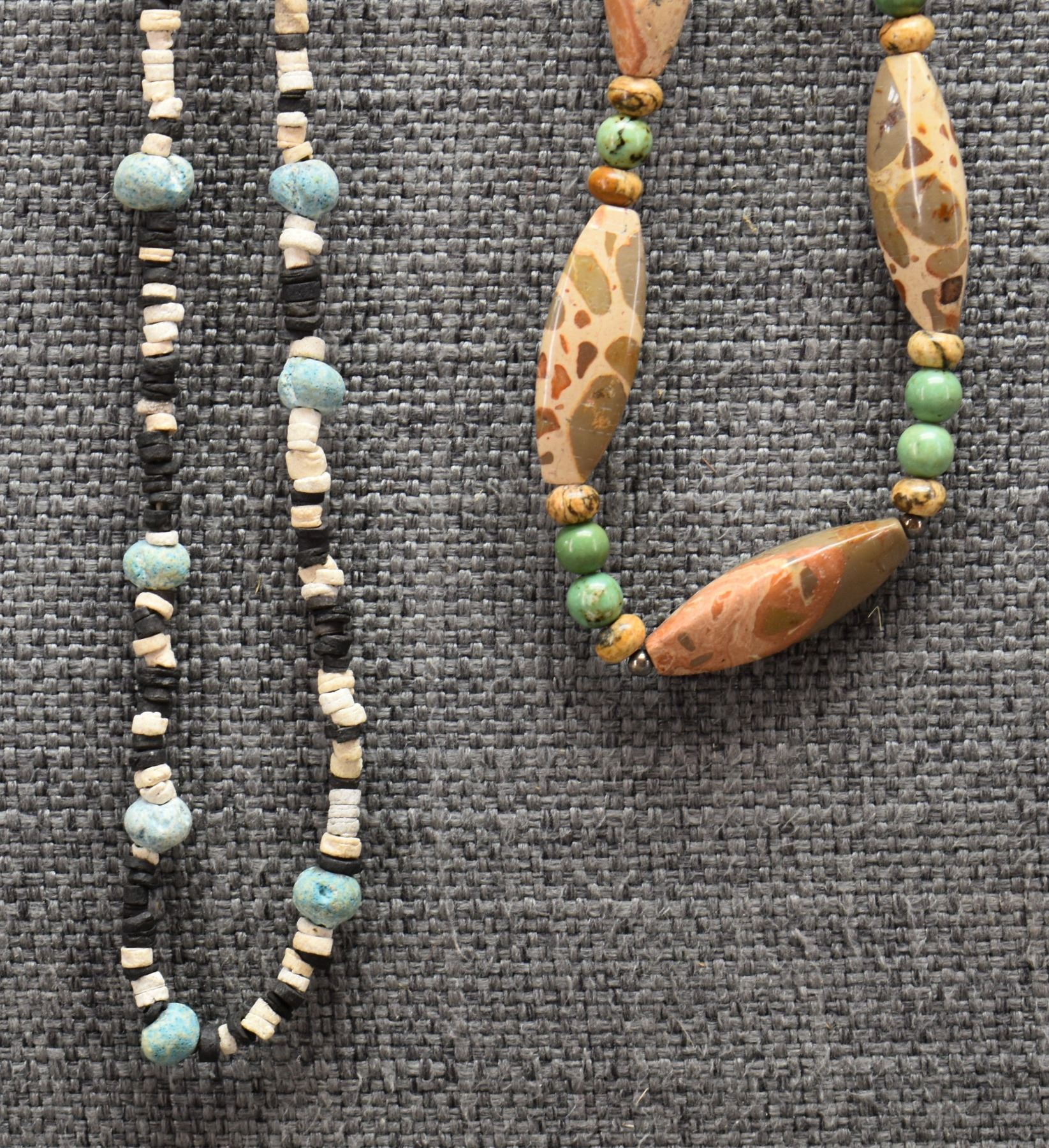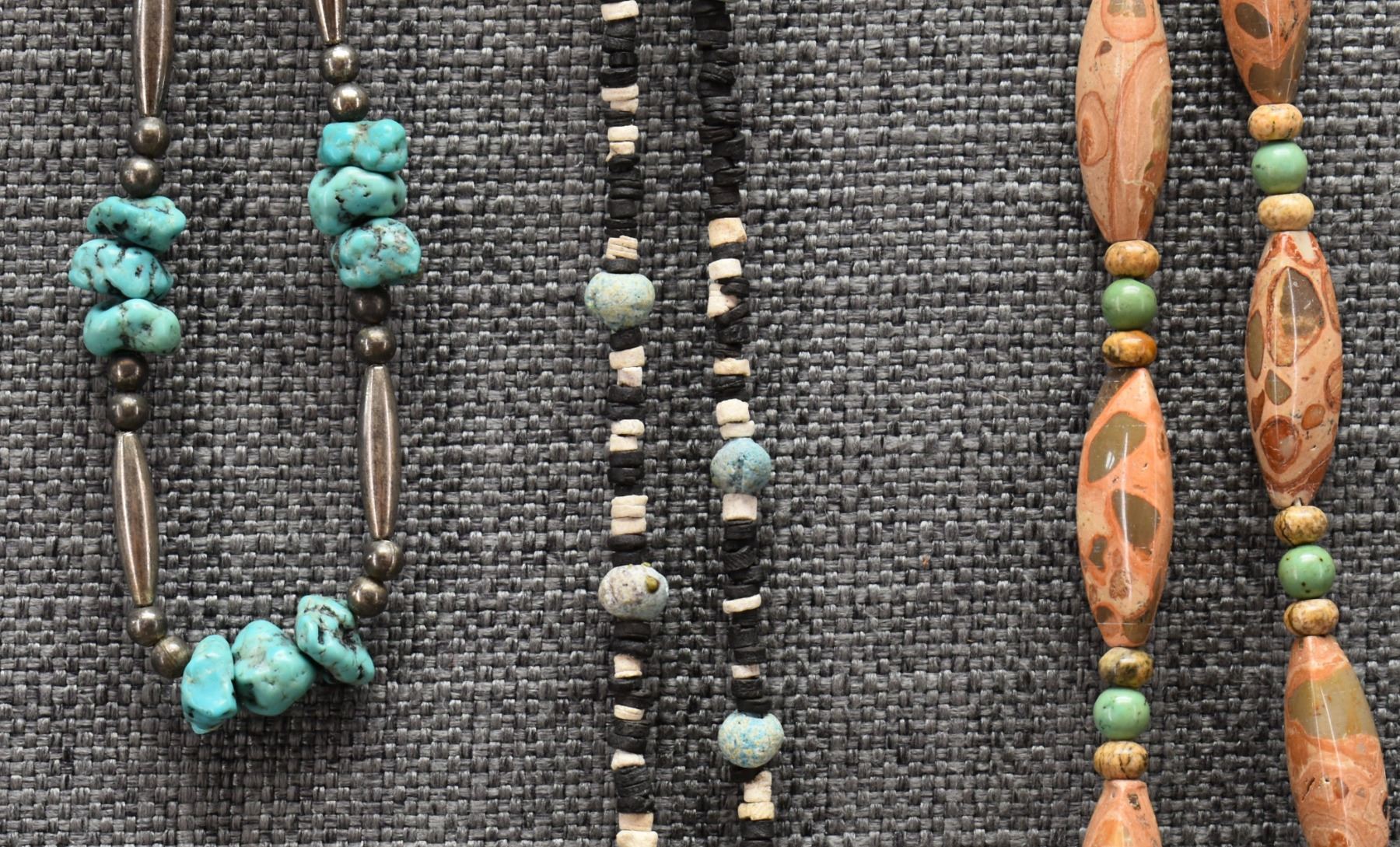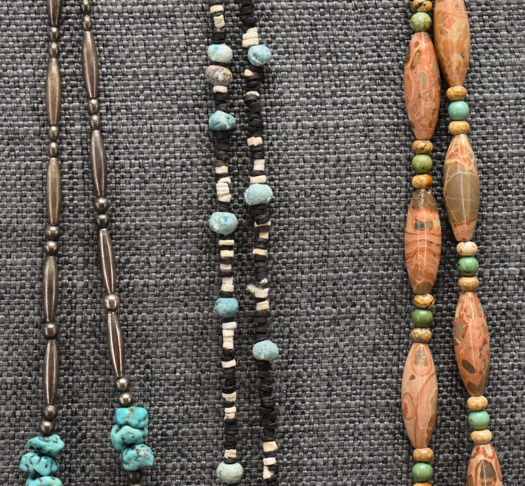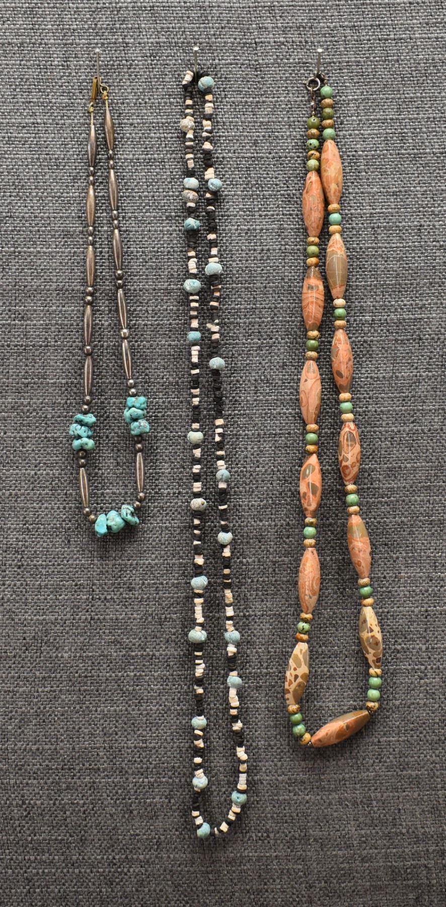 1970's Pueblo. Necklaces turquoise and shell 28'' long. Stone beads 24'' long and sterling silver and turquoise 16'' long