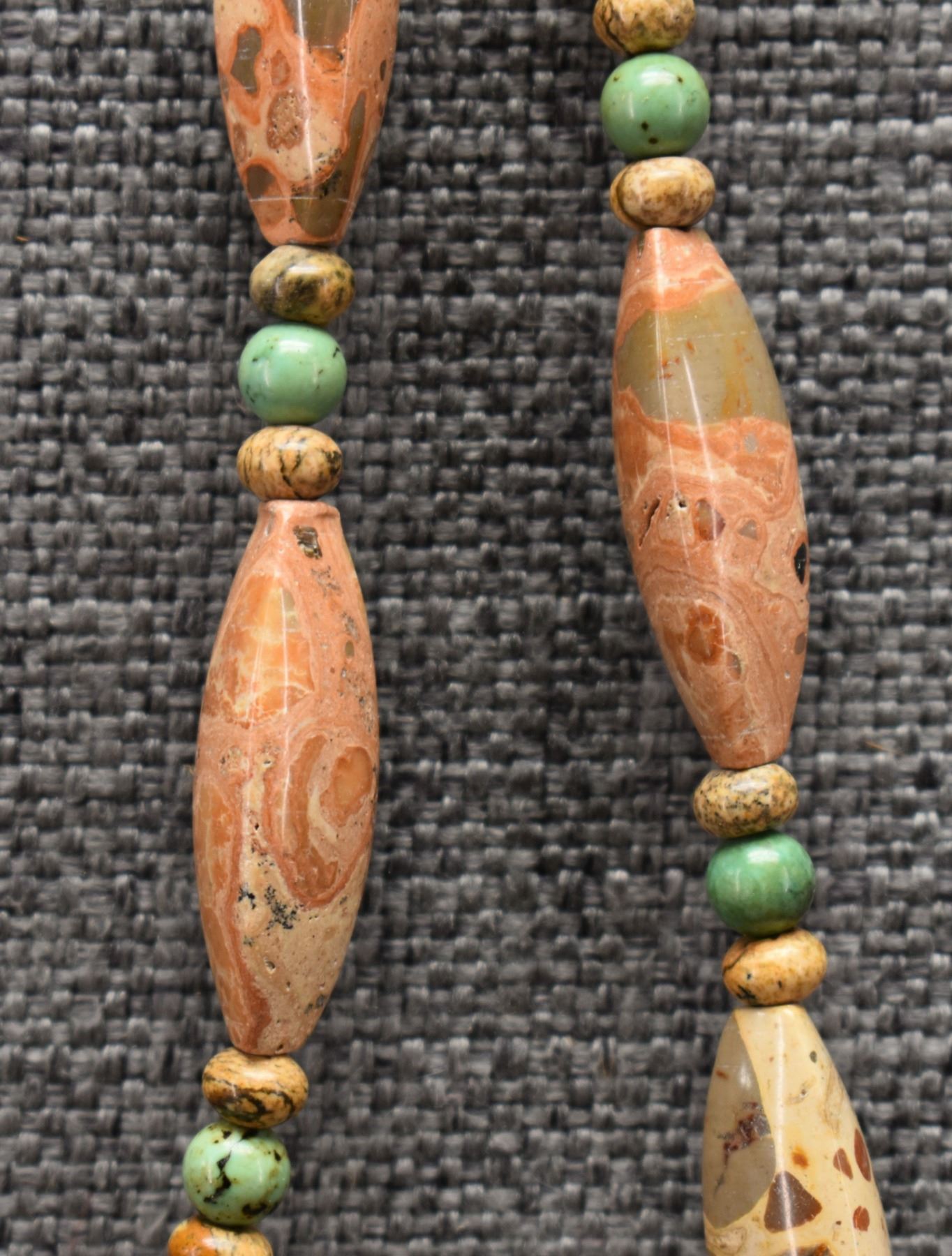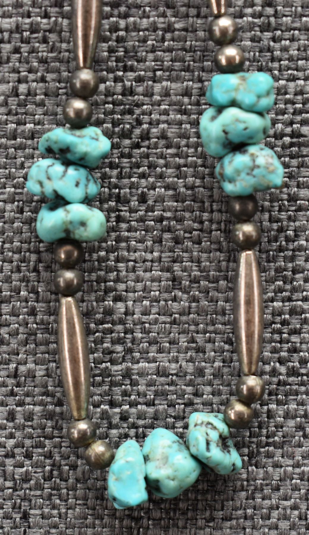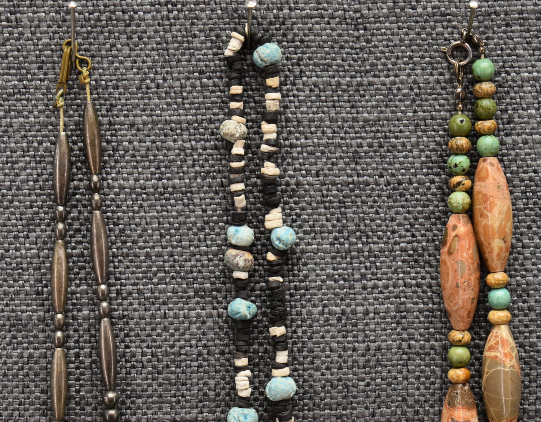 1970's Pueblo. Necklaces turquoise and shell 28'' long. Stone beads 24'' long and sterling silver and turquoise 16'' long