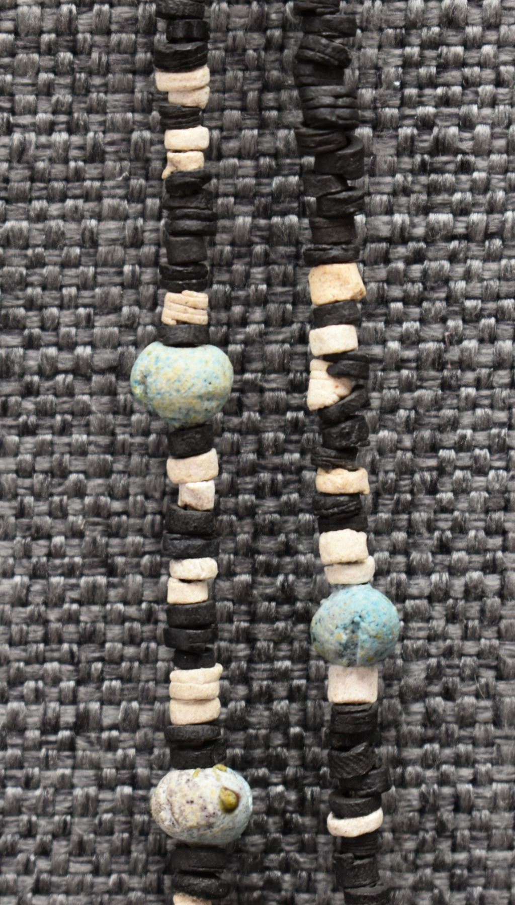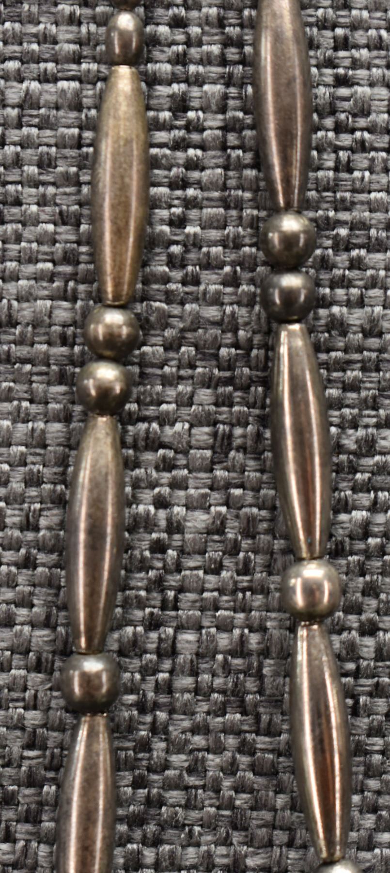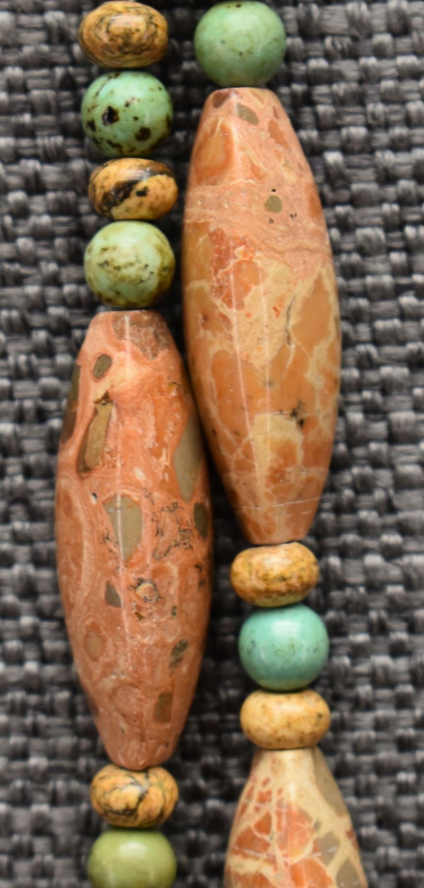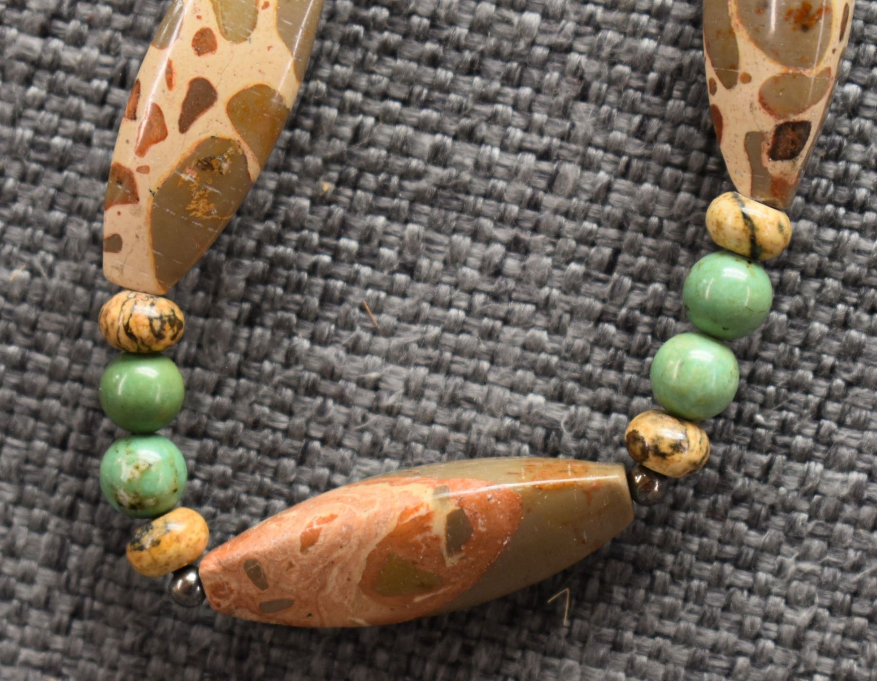 1970's Pueblo. Necklaces turquoise and shell 28'' long. Stone beads 24'' long and sterling silver and turquoise 16'' long