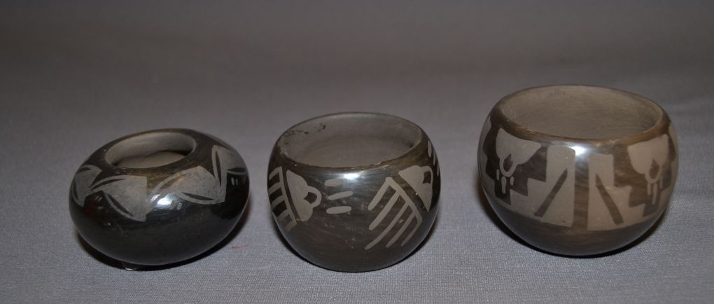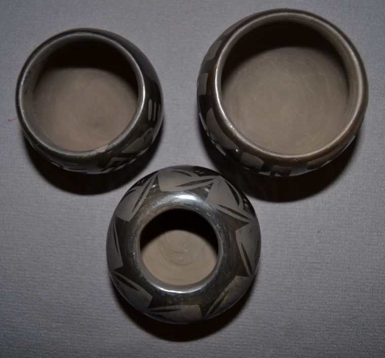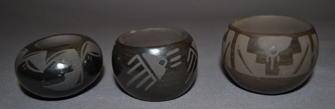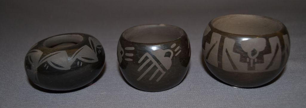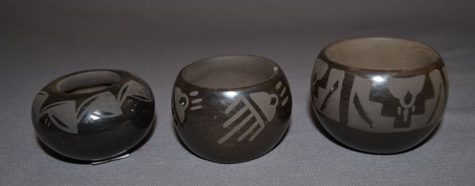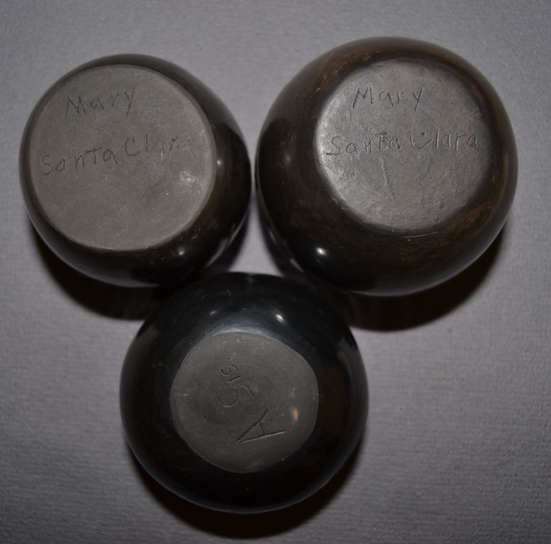 1980s 90s all are matte on black geometric design largest signed Mary 2.25"x3.25" medium signed Mary 2"x2.75" smallest signed A. Sis. 1.75"x3" all have surface rubbing"