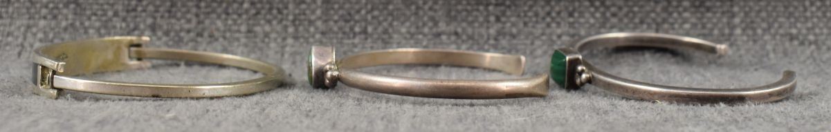 Three sterling silver and stone bracelets. Navajo Stearling and turquoise signed R. Skeets, Navajo sterling silver and Malachite signed, one Mexican bracelet stamped 925 shell and jet inlay. Total weight 44g largest .25" x 6.75" opening 2"