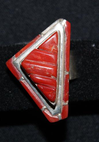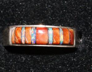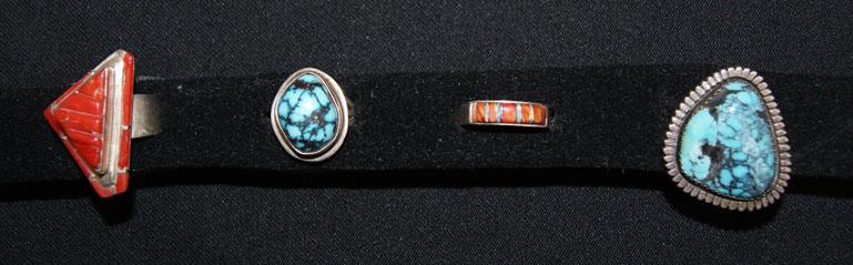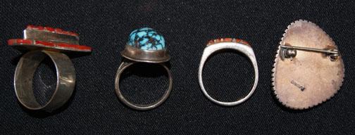 1980-90'S coral rings size 8, signed L. E., channel inlaid opal ring, size 7.5, spiderweb l ring, size 6.5", turquoise pin 1"