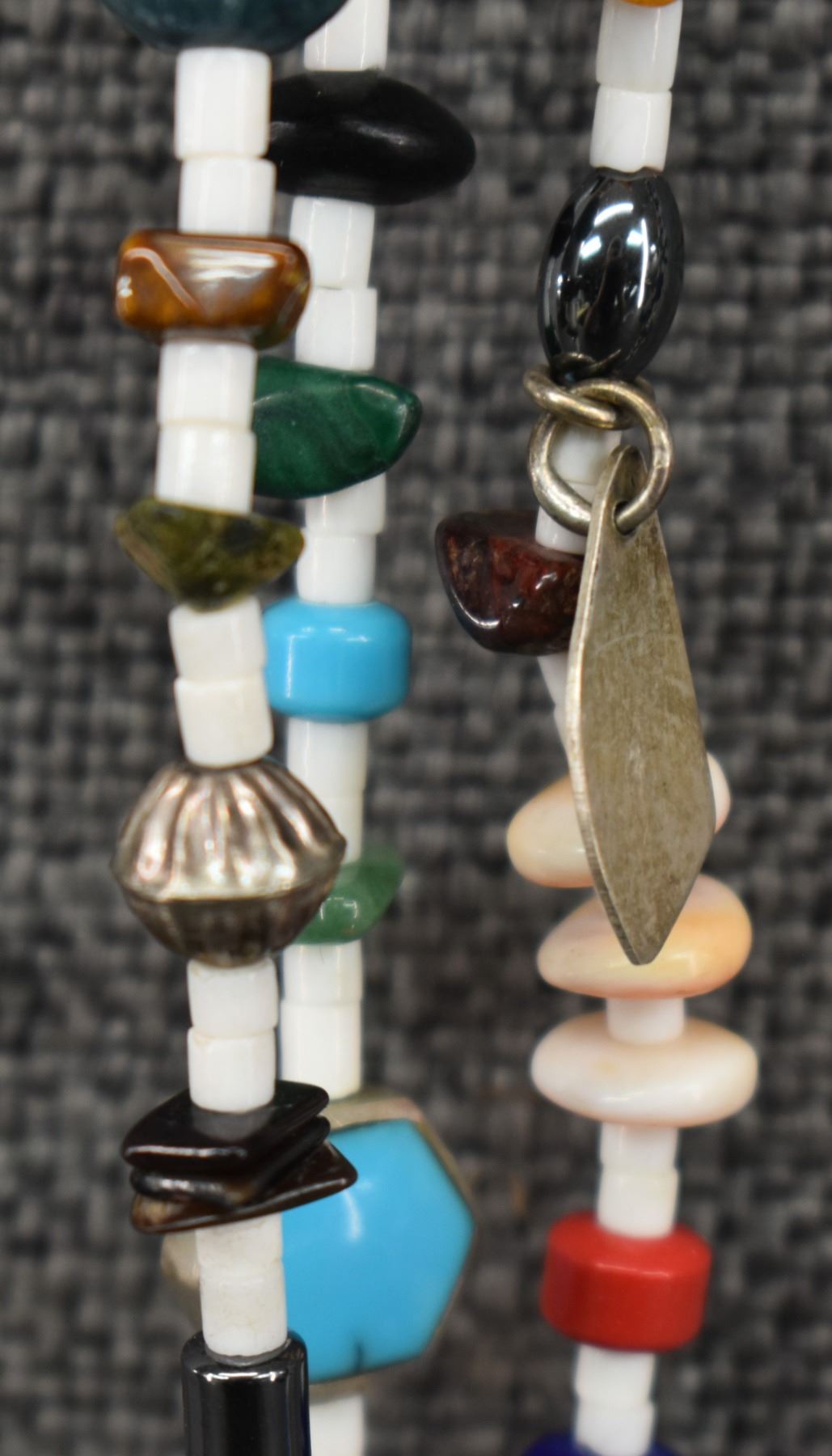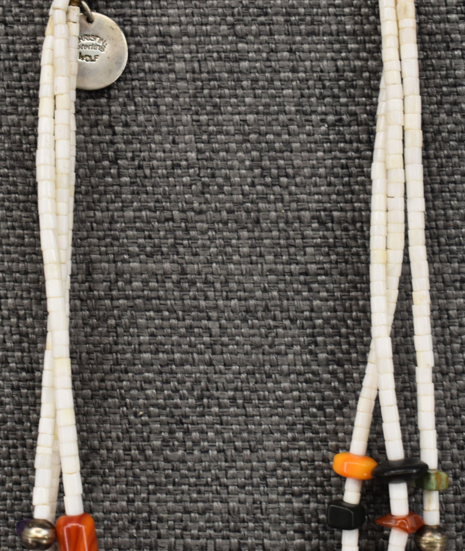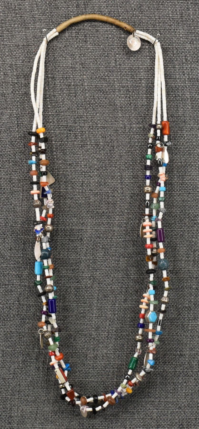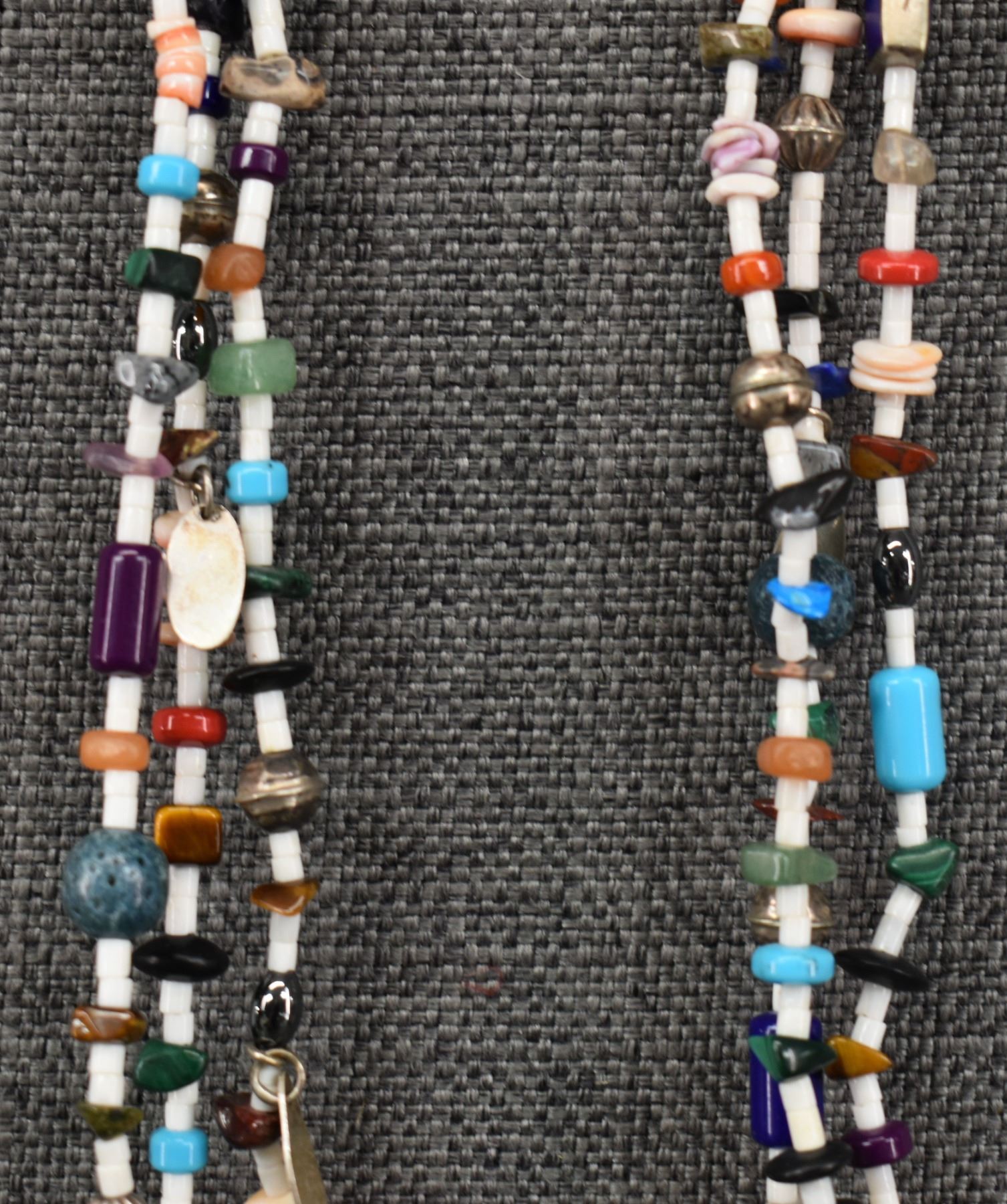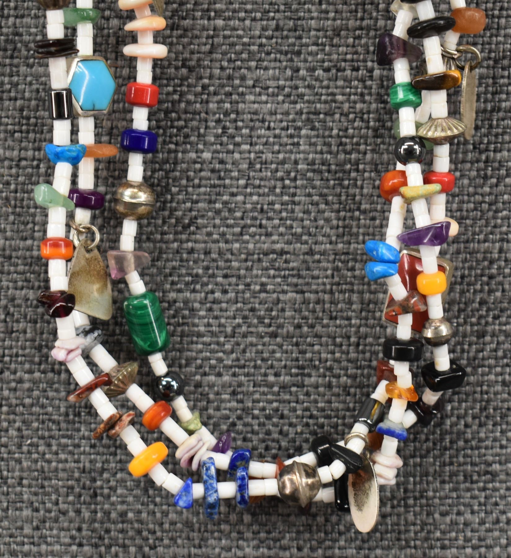 1990's Three strand of shell heishi with various stones and silver beads by Christian Wolf, 30" long